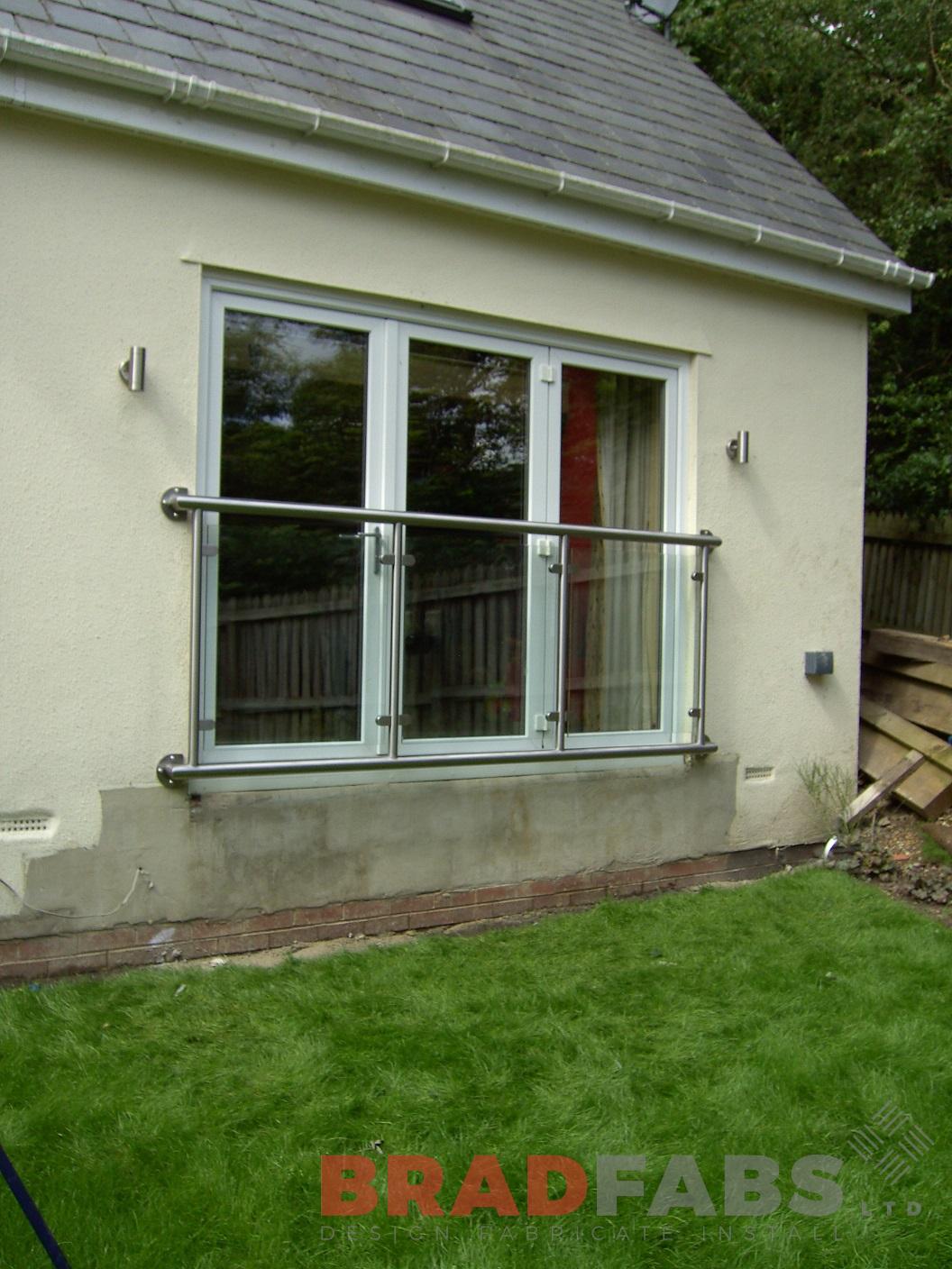 Made using stainless steel tubular handrail and toughened glass panels, fitted against windows at a house in Leeds, West Yorkshire.