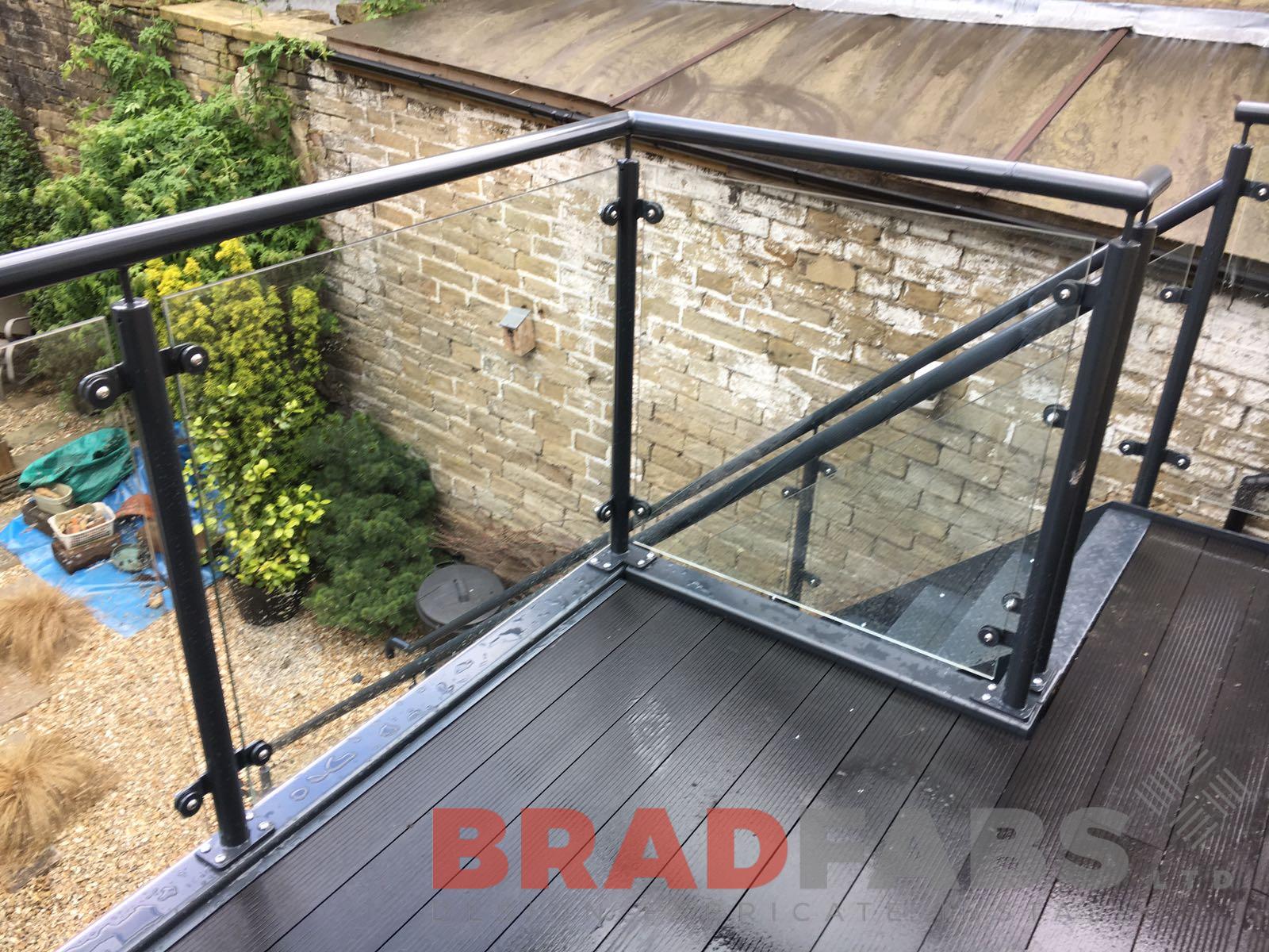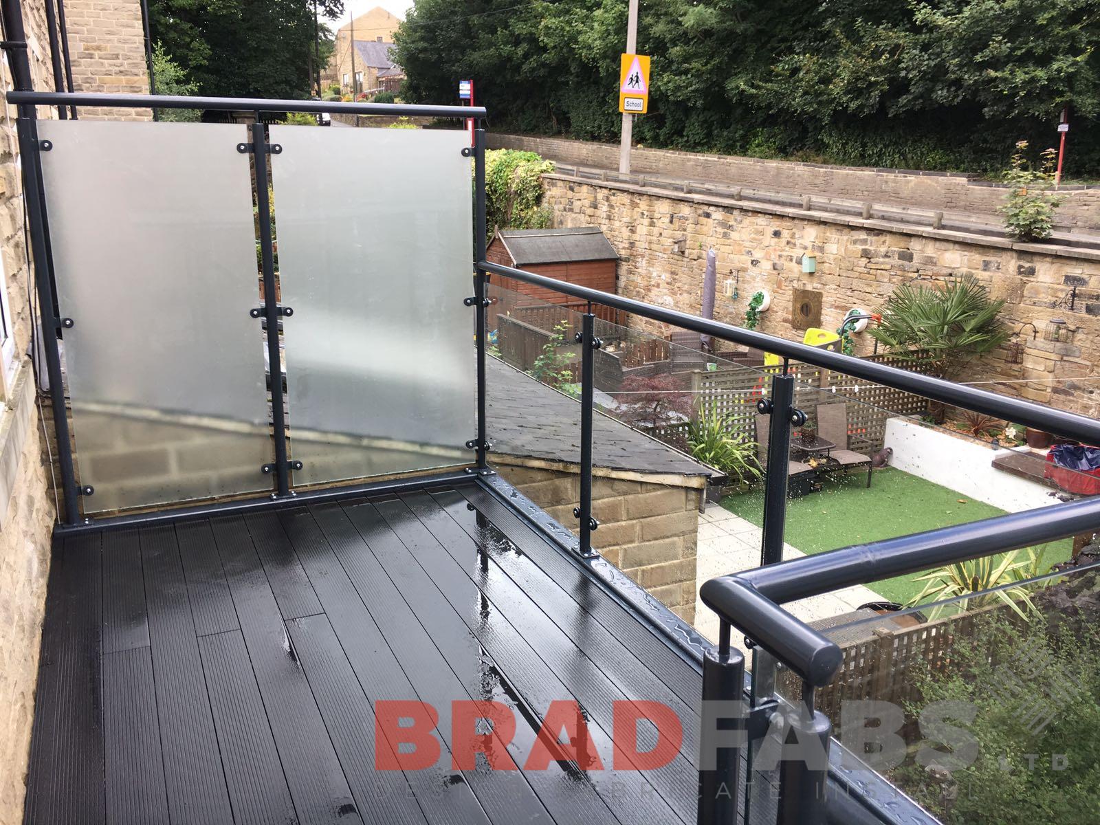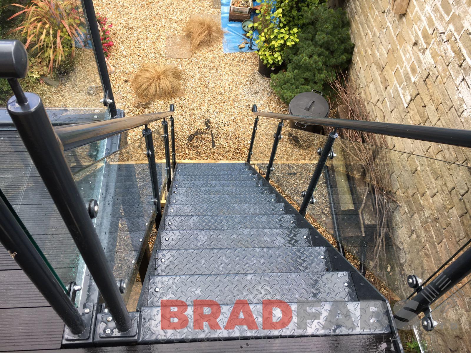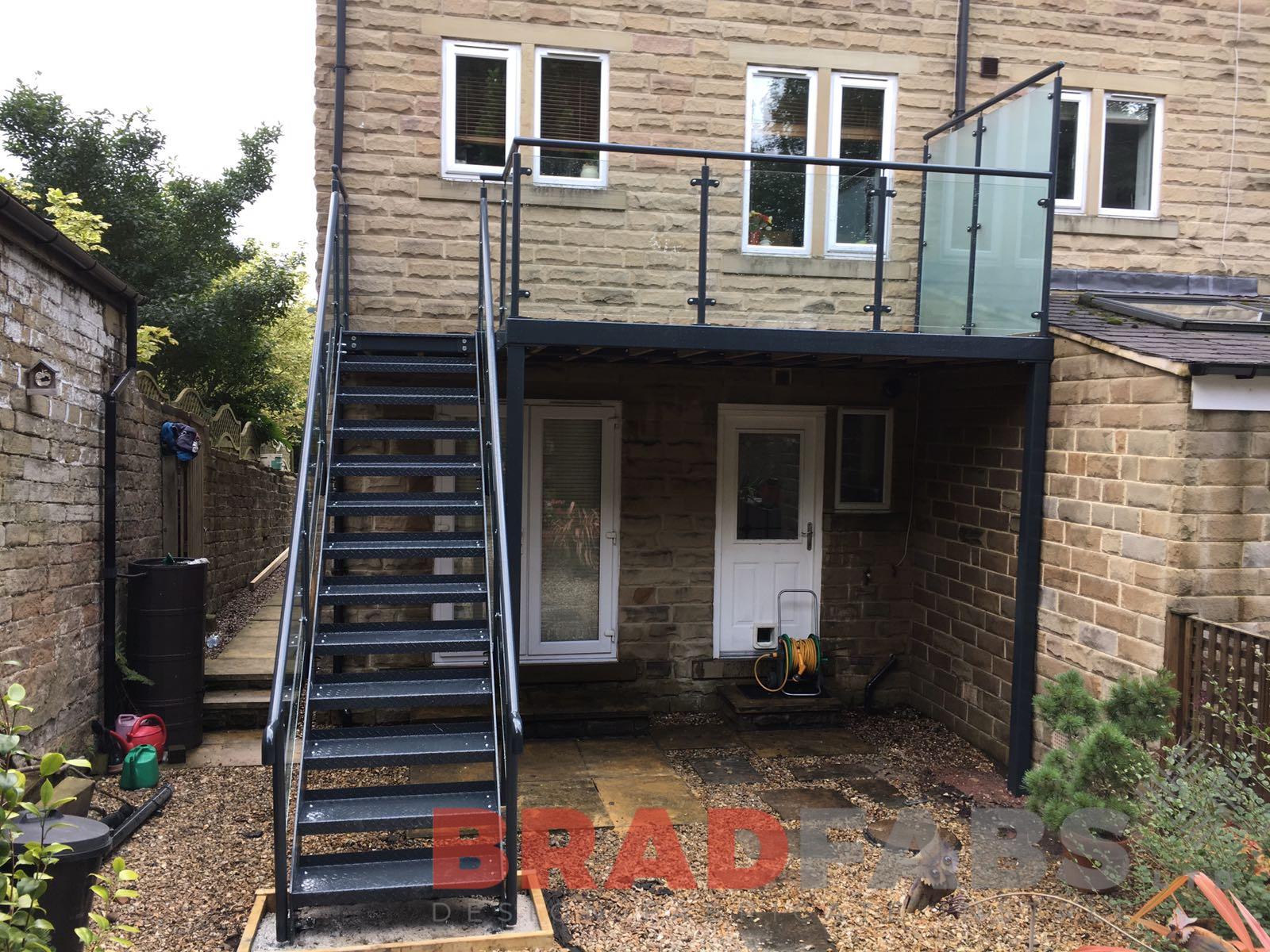 This customer opted for a matching balcony and access staircase from the balcony to the garden. The balcony is manufactured in mild steel, galvanised and powder coated with a modern colour with raised privacy glass to one side. The staircase is also in mild steel, galvanised and powder coated with chequer plate treads and powder coated glass balustrade