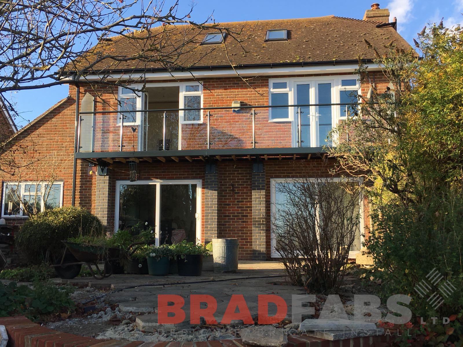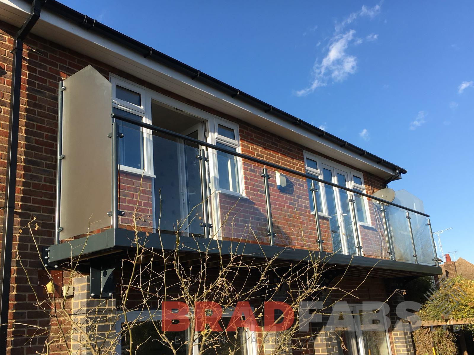 Bradfabs supplied and installed a mild steel, galvanised and powder coated balcony with mild steel, galvanised and powder coated balustrade with 10mm toughened glass infill panels, 1.700mm high privacy screens to both ends and composite decked floor.