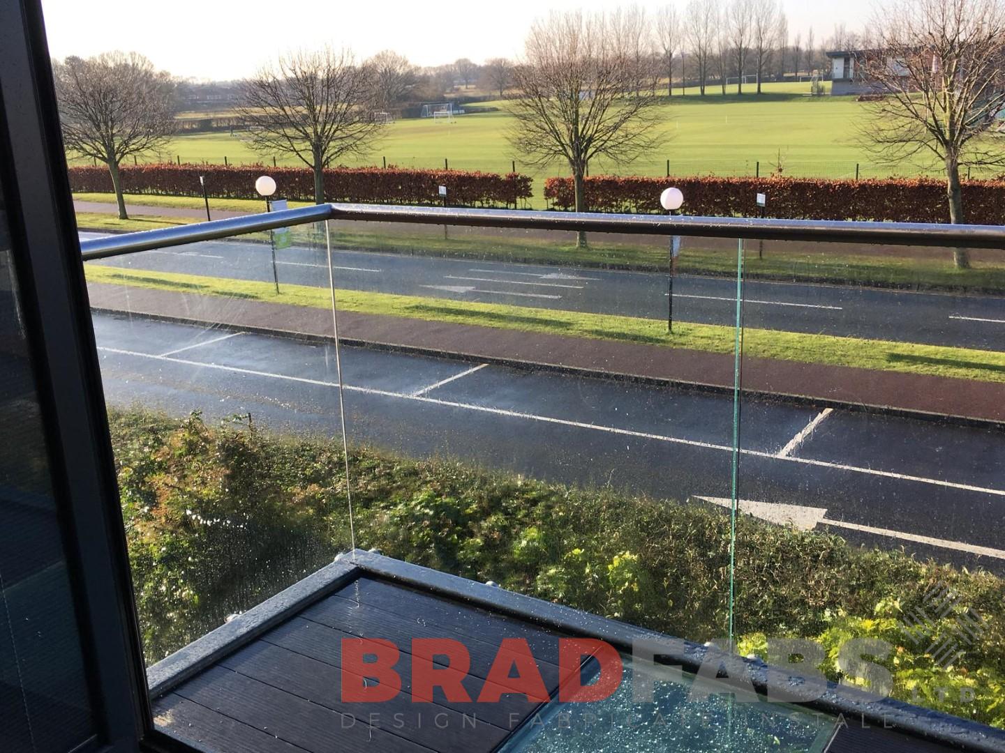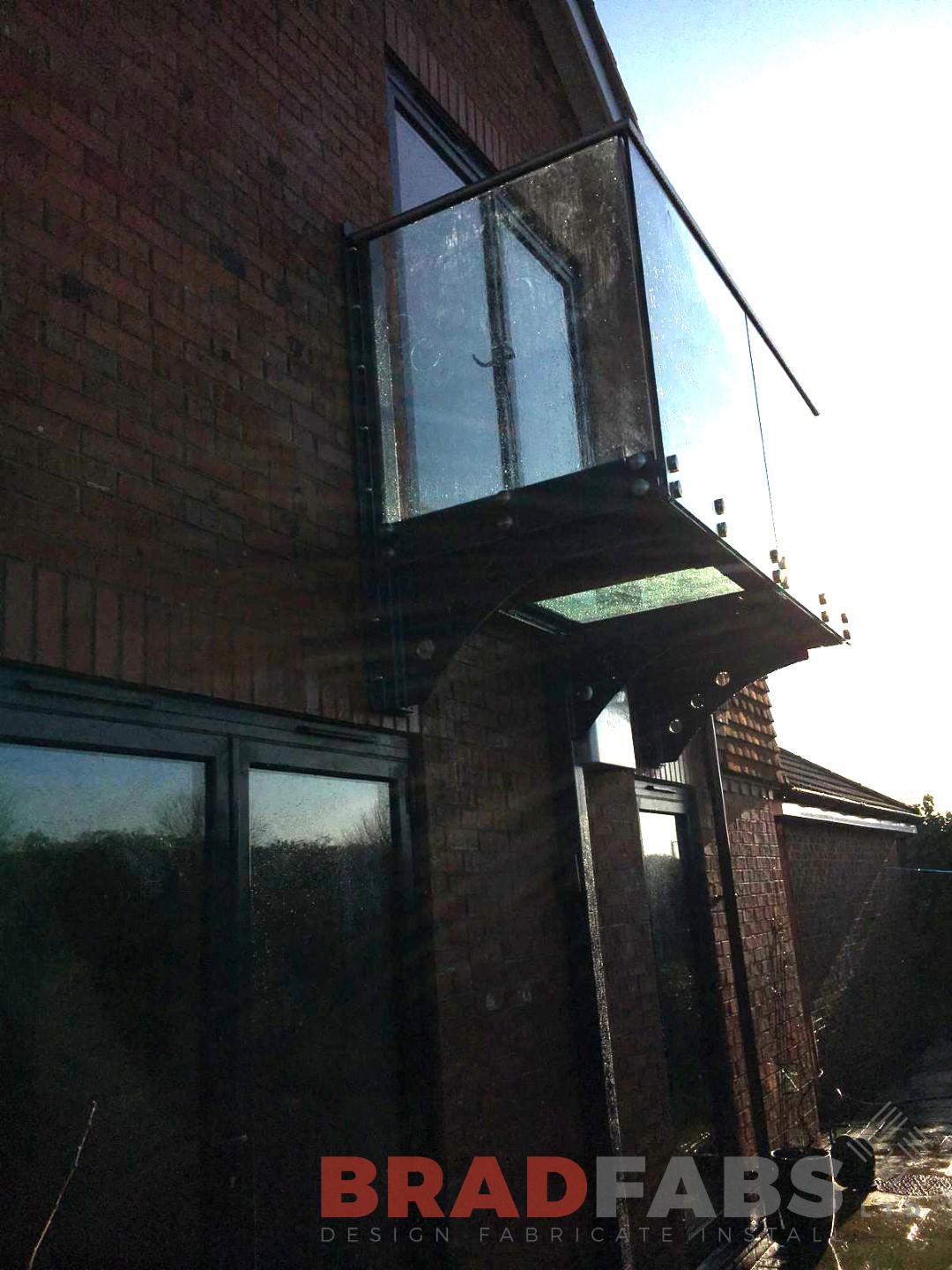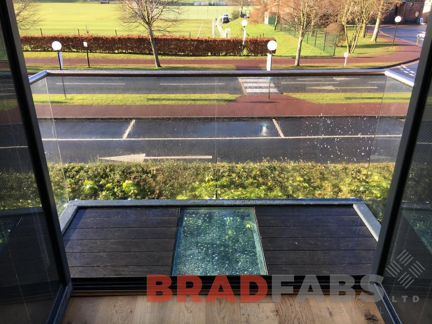 Bradfabs installed this unique balcony with a different position for the leg. The wall was not suitable for a full cantilevered balcony and this gave the customer a different option to the standard position of legs. Bradfabs designed, manufactured and installed this small garden balcony with floating glass balustrade with stainless steel capping. There was also a small section of glass floor added to the balcony to allow light through to underneath.