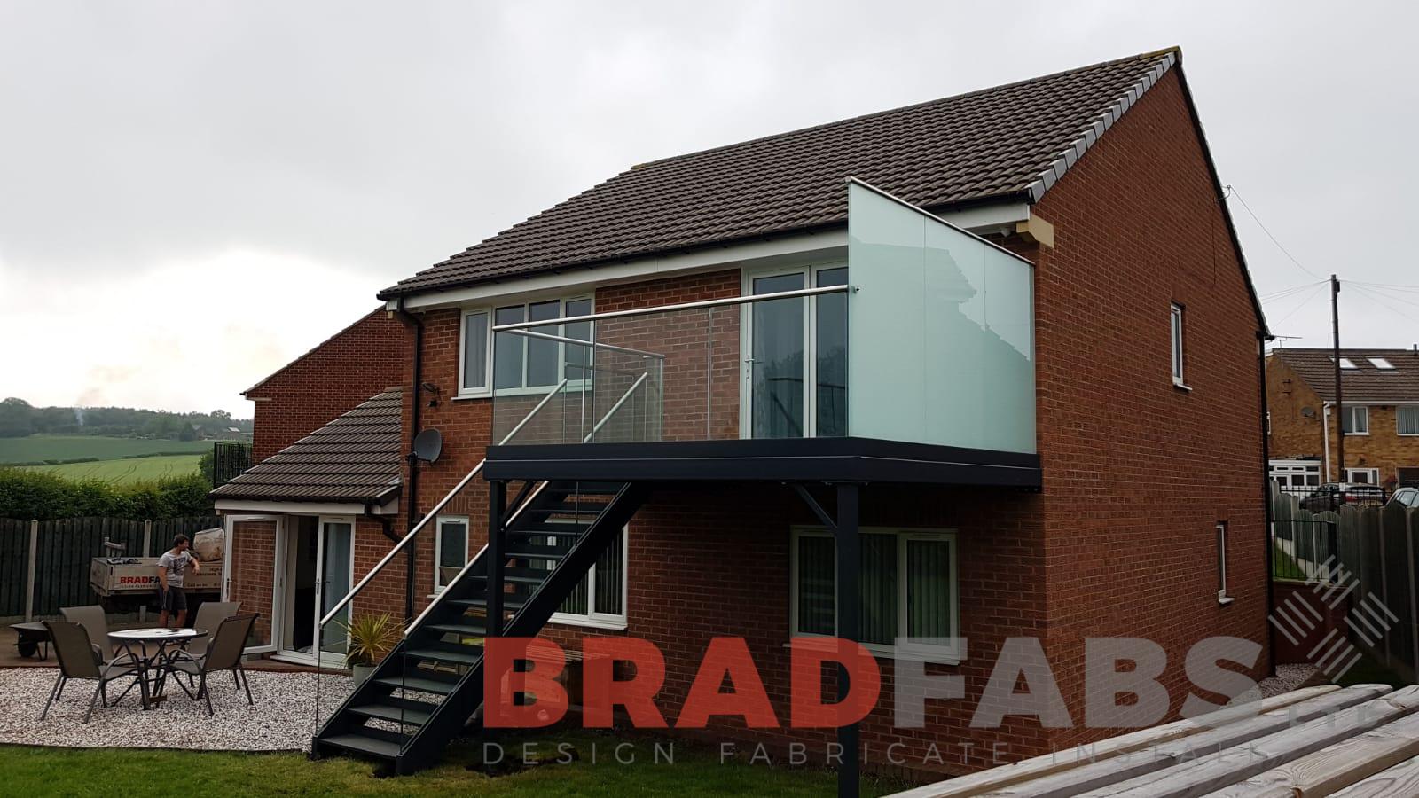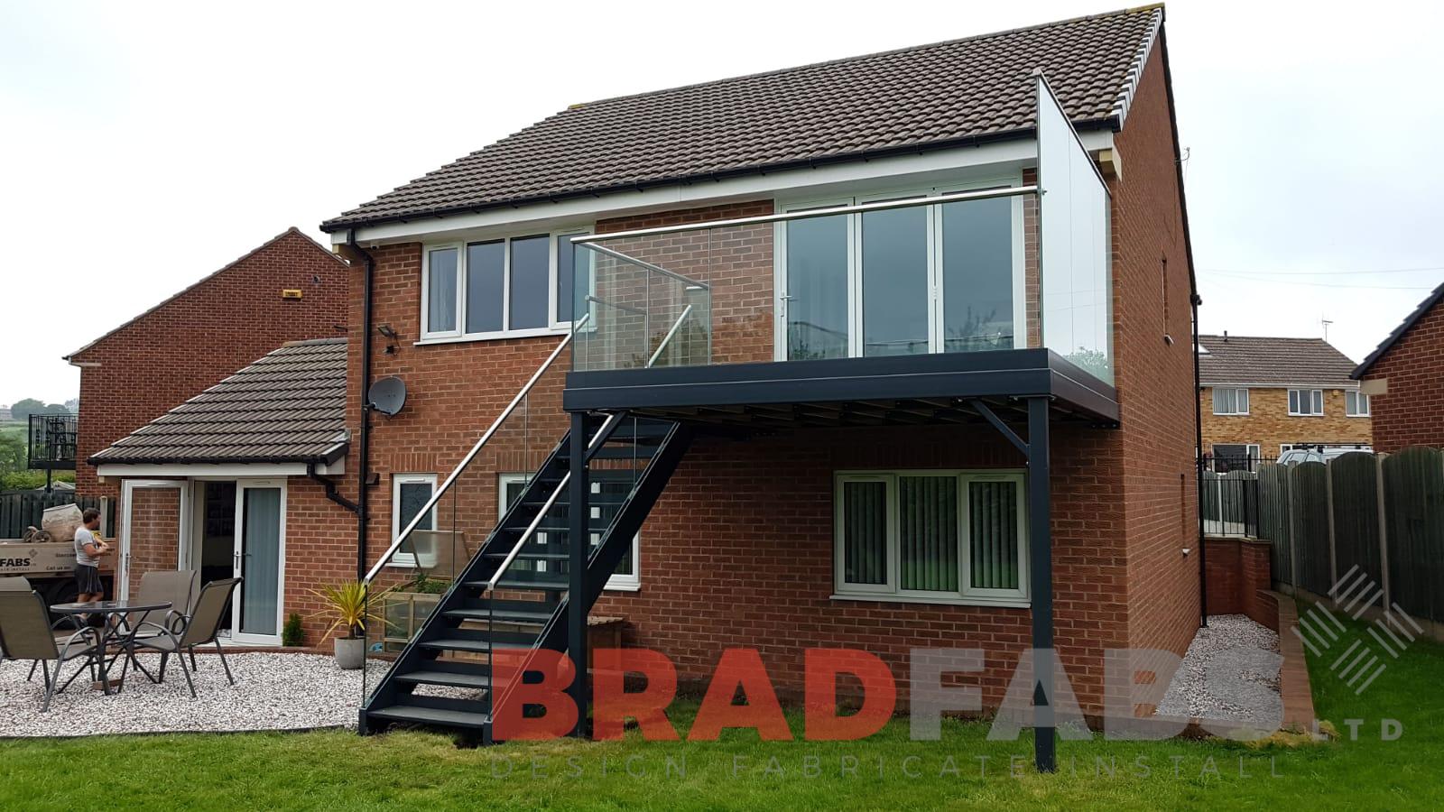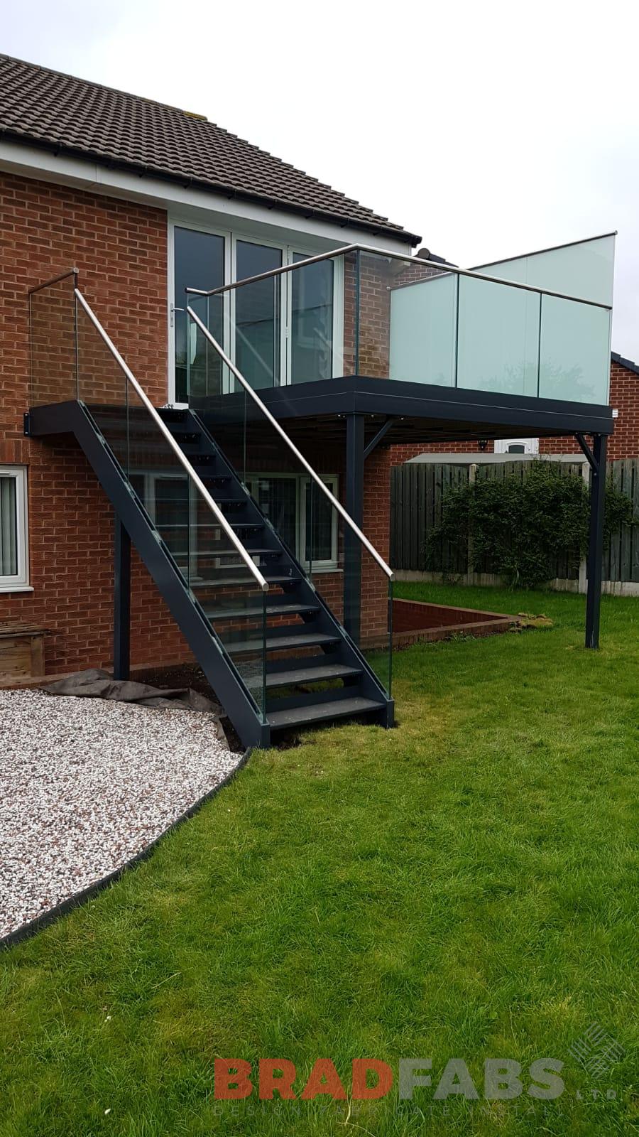 This custom made balcony and staircases, was fabricated in mild steel, galvanised and powder coated finish. The balcony is complete with channel system (infinity glass) balustrade with stainless steel handrail (privacy glass to one side). The staircase is custom made in mild steel, galvanised and powder coated with channel system balustrade and composite decked treads.