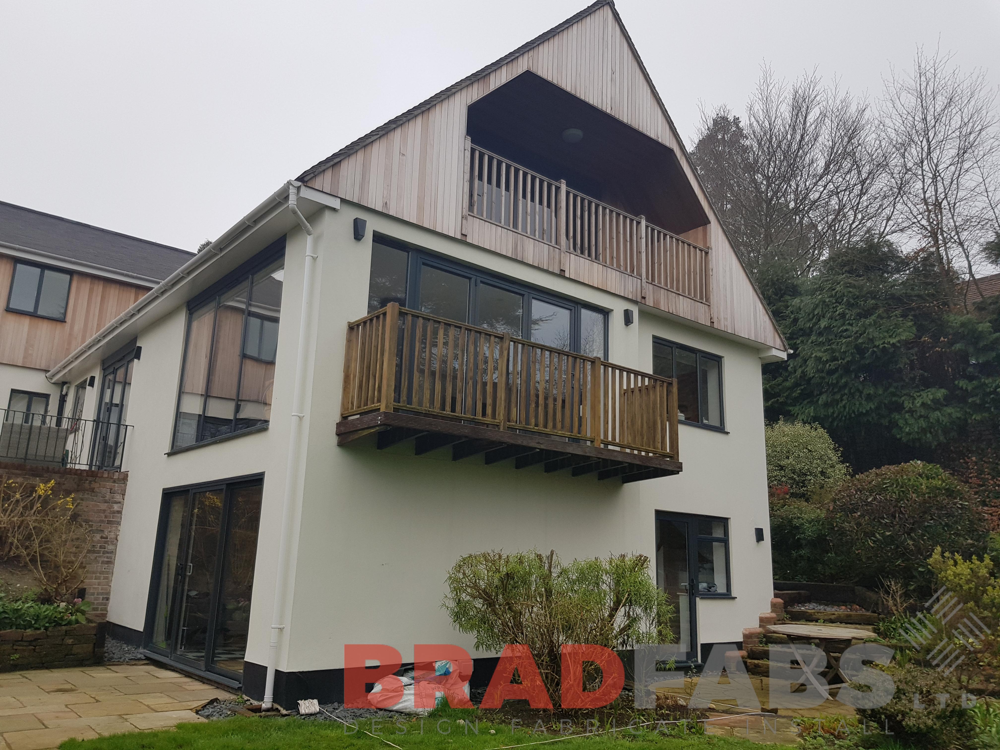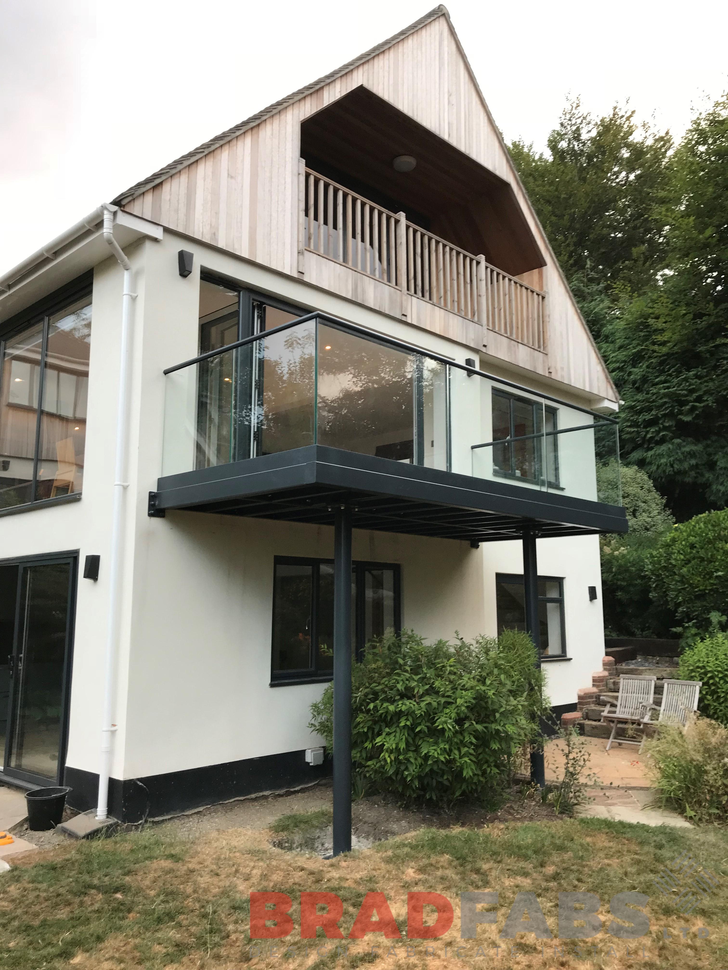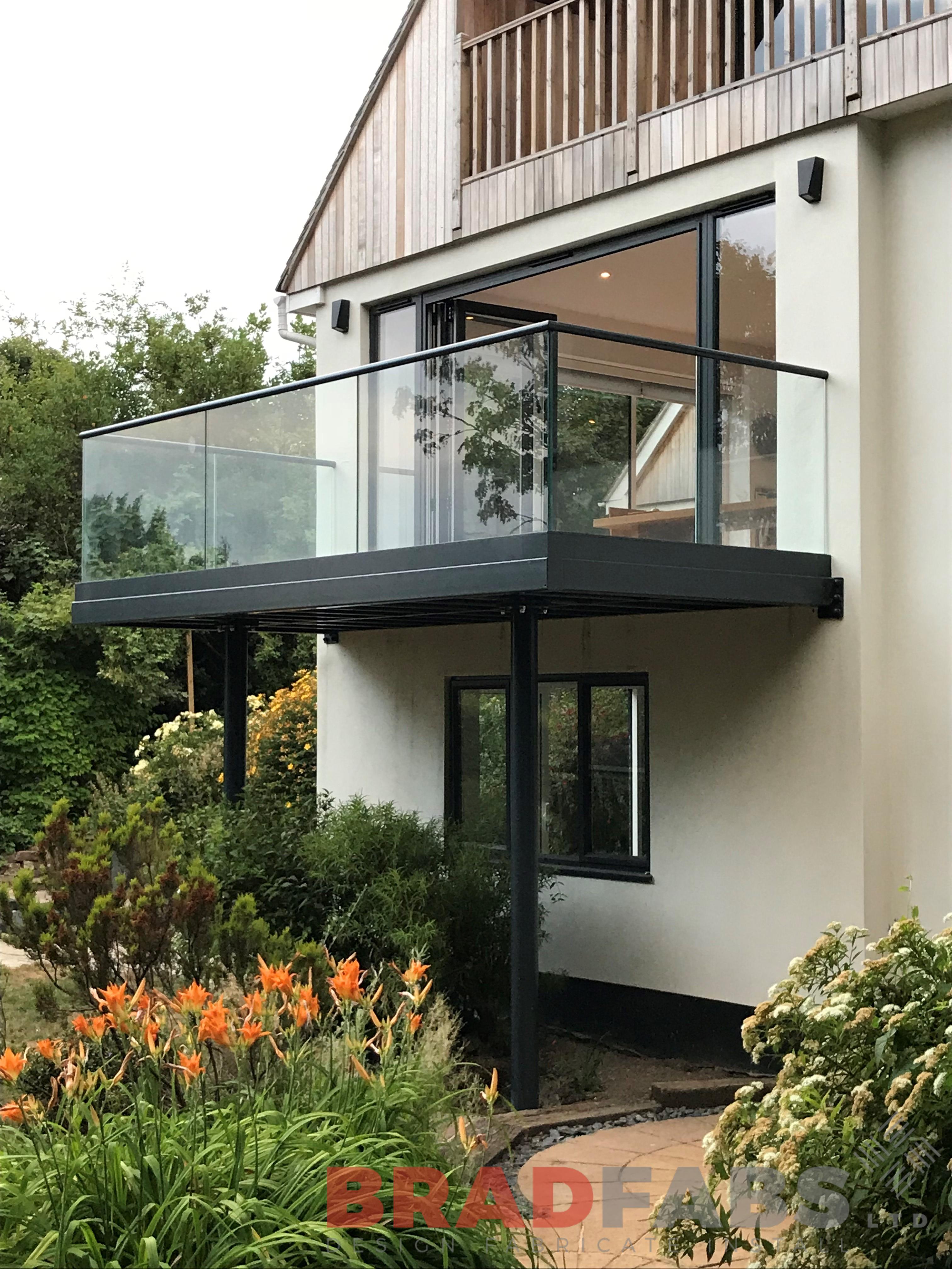 Bradfabs were commissioned to replace an existing wooden cantilevered balcony. We designed, fabricated and installed a mild steel, galvanised and powder coated frame with channel system balustrade (infinity glass), along with a stainless steel top rail and composite decked floor. We can design, manufacture and install any design, size and colour you require as all our balconies are bespoke and tailored to meet your needs and requirements.