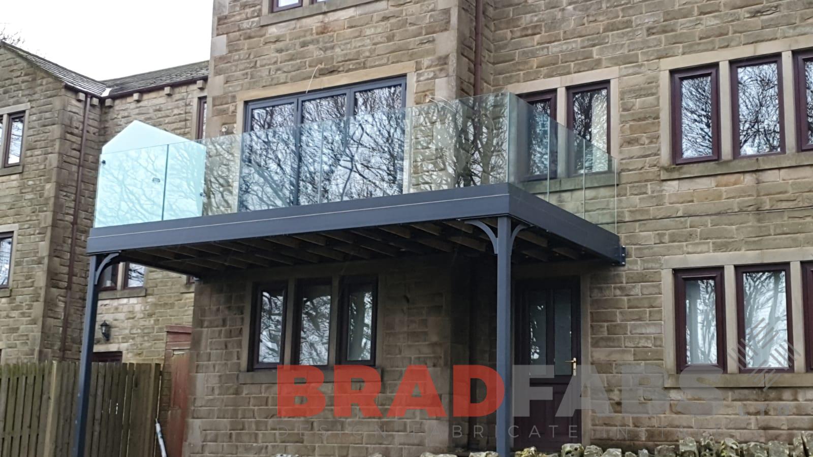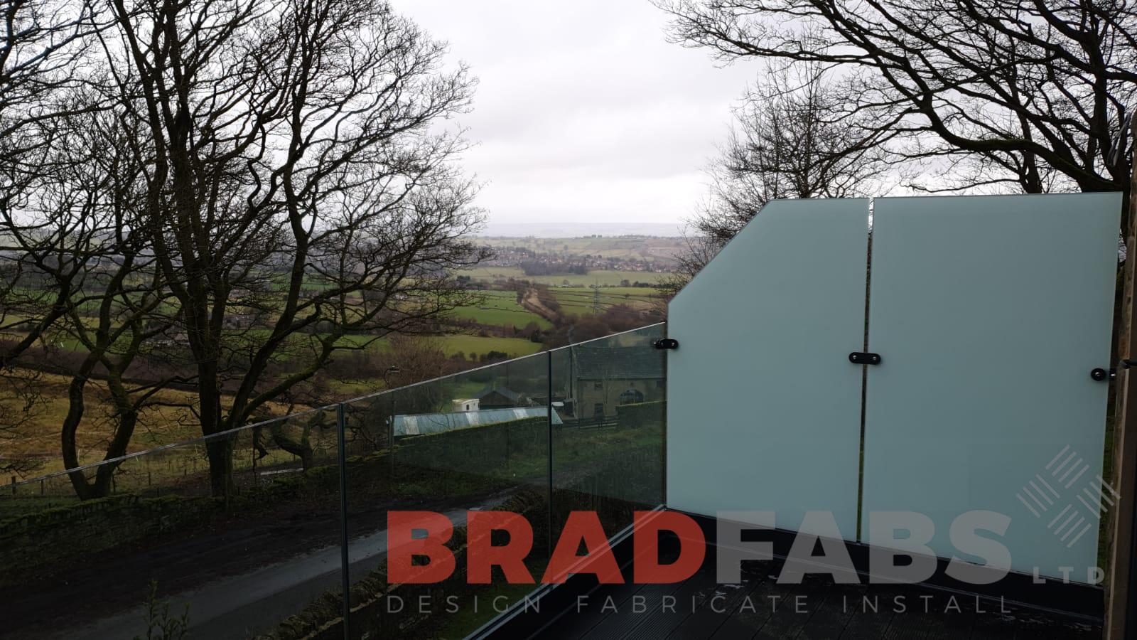 Beautiful large balcony, with supporting legs. Manufactured in mild steel, galvanised and powder coated frame, with channel system infinity glass balustrade and privacy screen to one side, complete with composite decked flooring