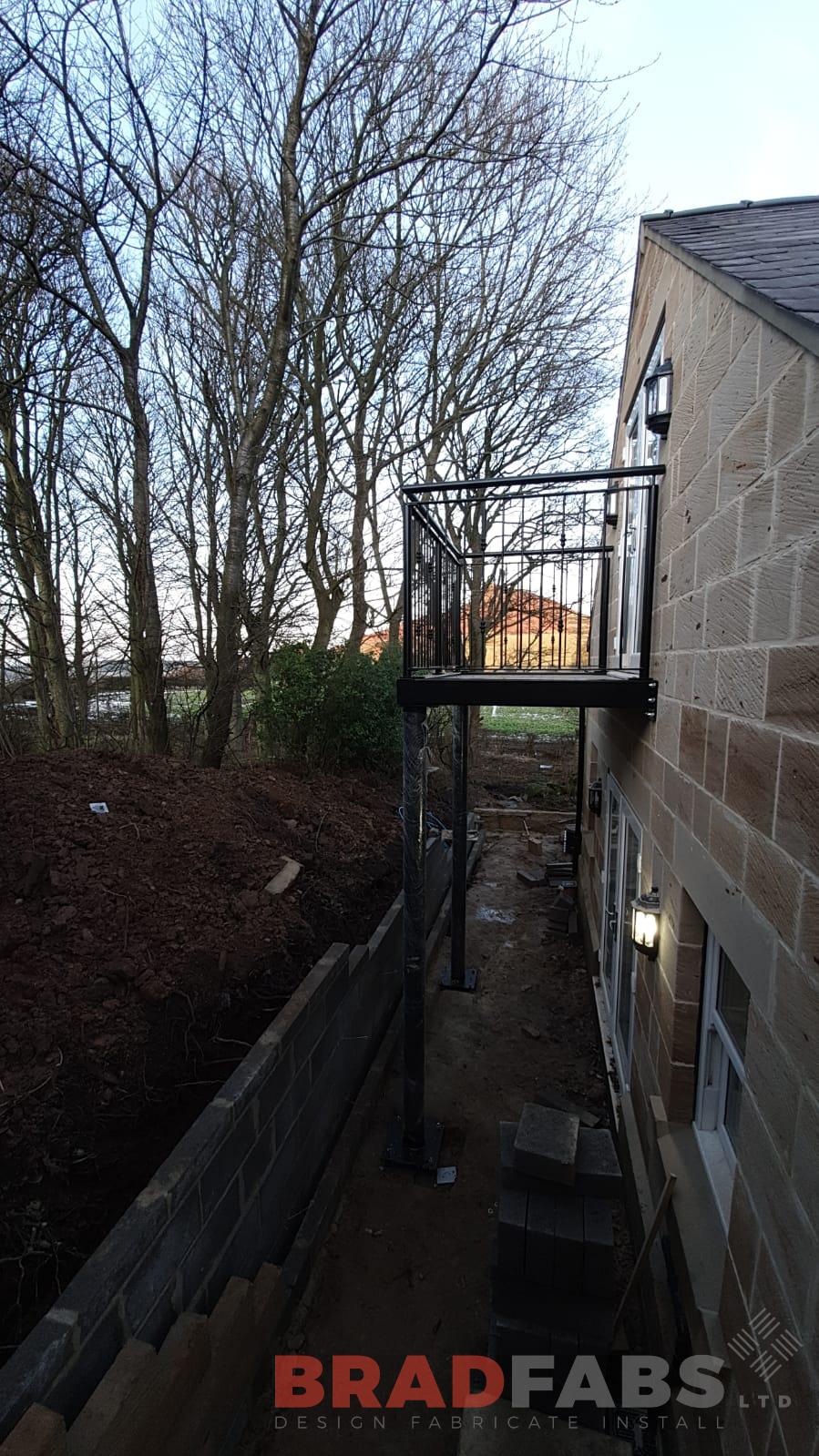 Perfect way to extend your living space, and make the most of the sunny days! This Balcony is manufactured in mild steel, galvanised and powder coated black with vertical decorative balustrade and tubular top rail, and is complete with composite decked flooring by the Bradfabs team.