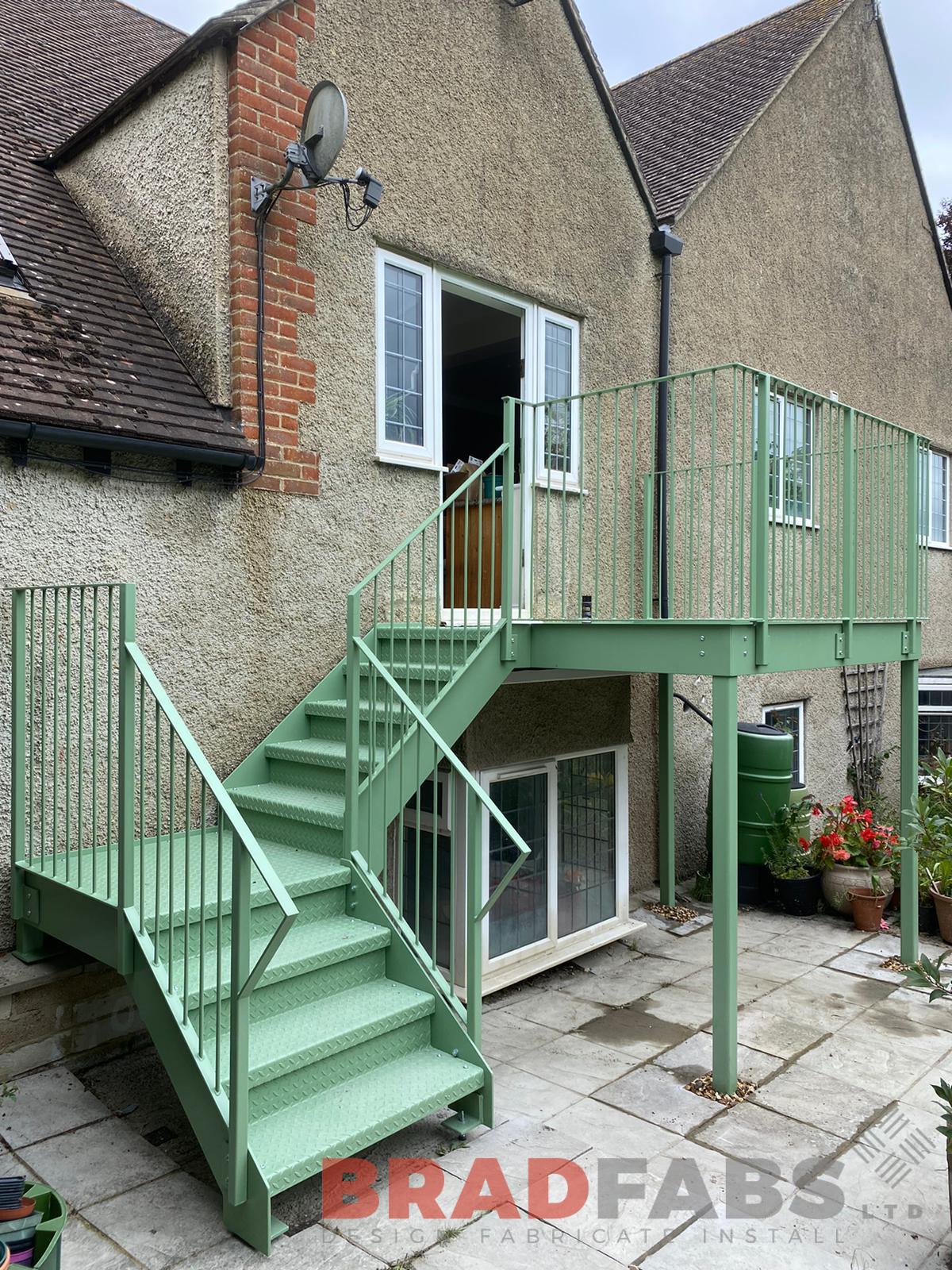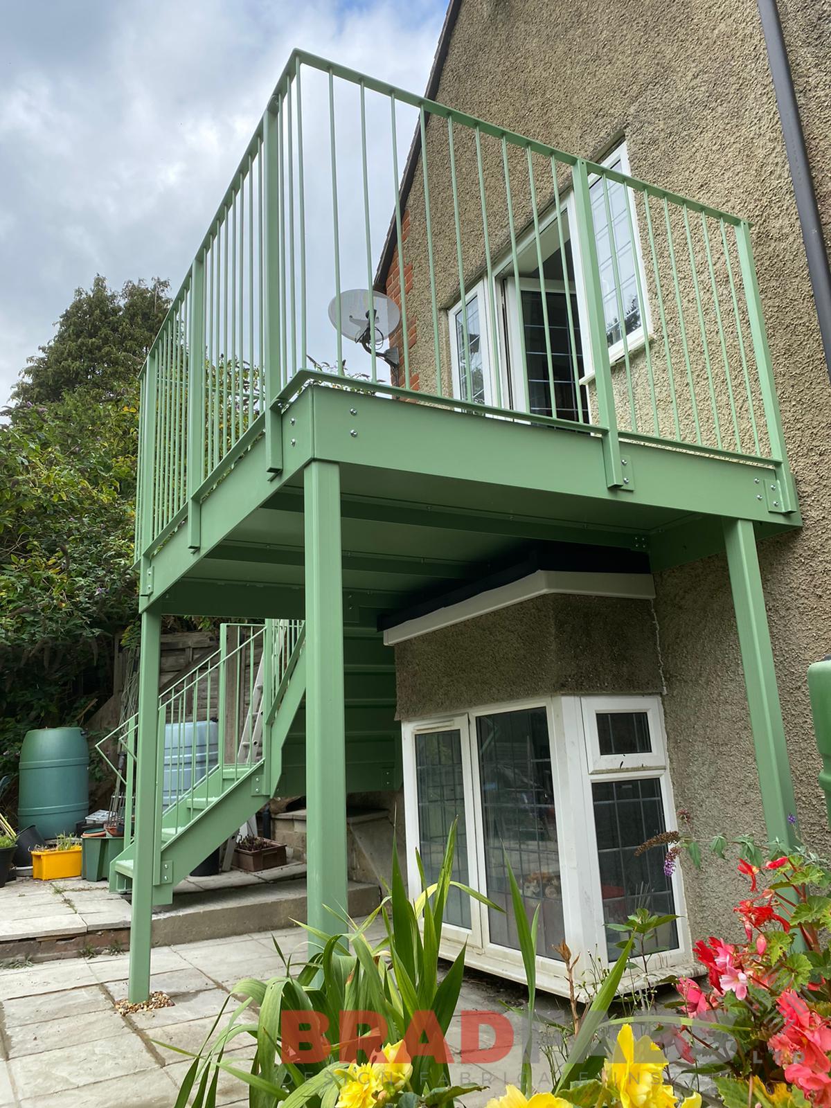 Balcony and straight staircase leading to a domestic property garden. Mild steel, galvanised and powder coated to RAL colour of customers choice, complete with durbar treads and landings