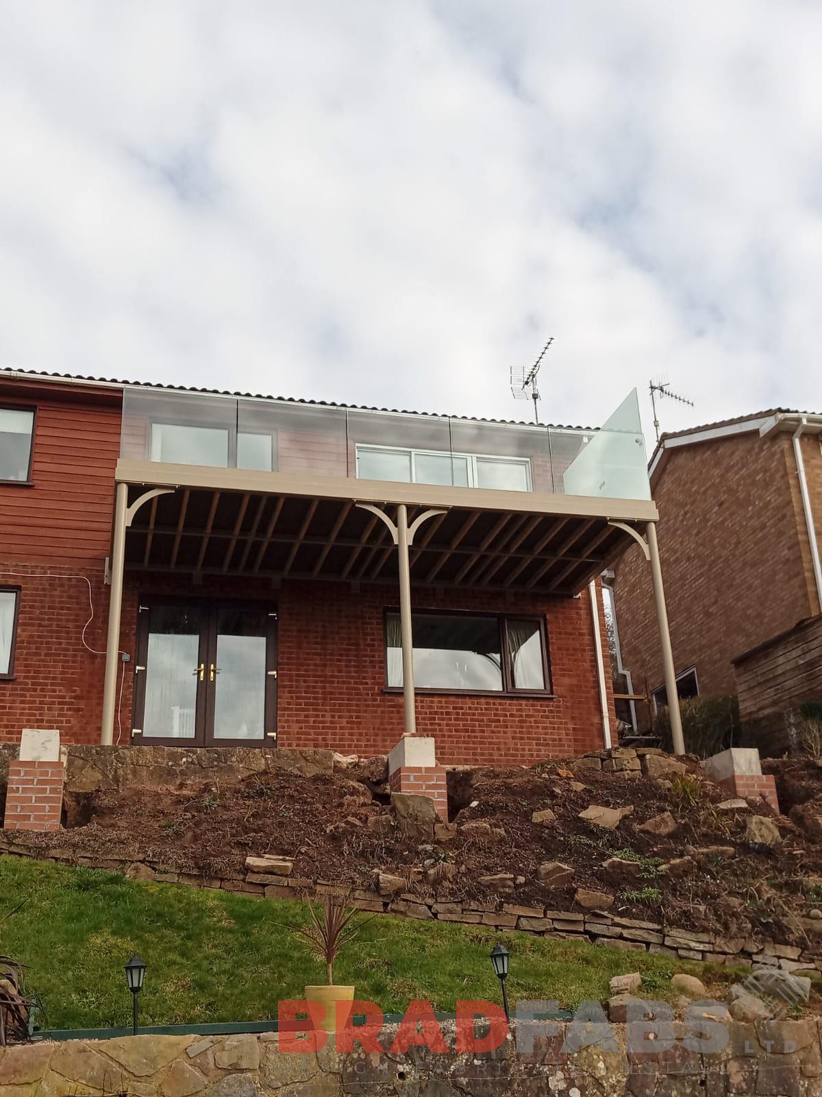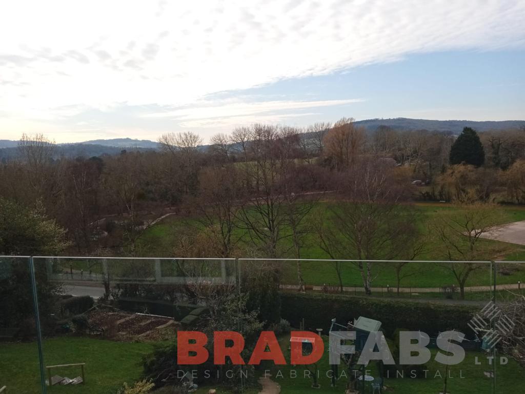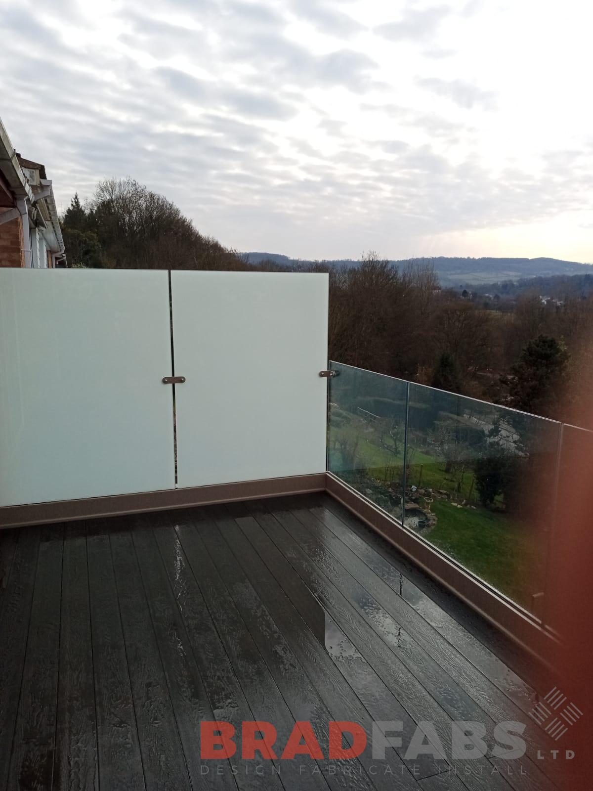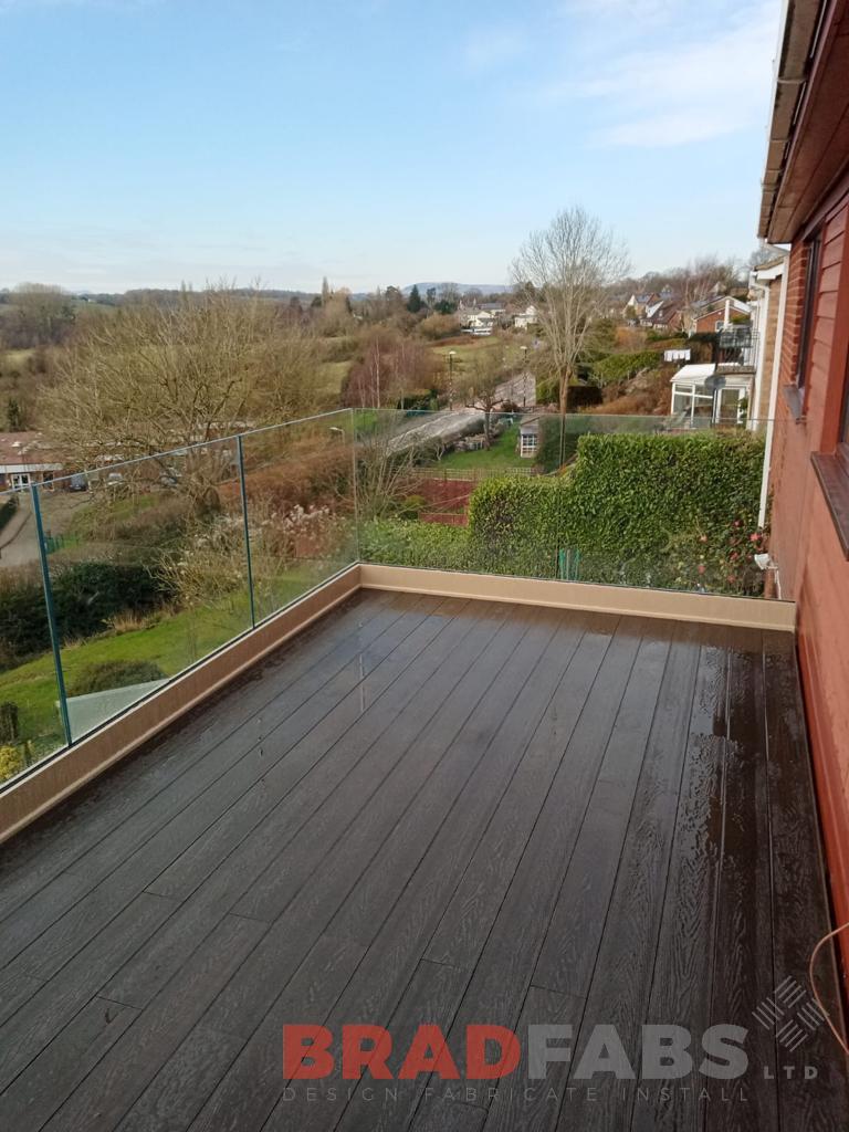 Large balcony with channel system infinity glass balustrade including privacy screen to one side, complete with five supporting legs and composite decked flooring