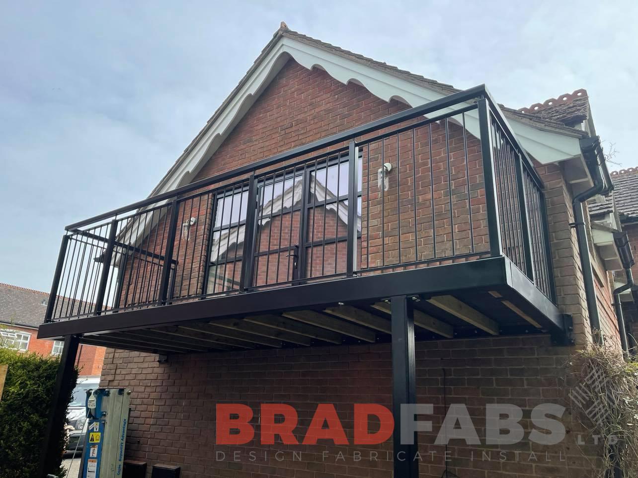 Balcony with two supporting legs and vertical bar balustrade complete with tubular top rail in mild steel, galvanised and powder coated