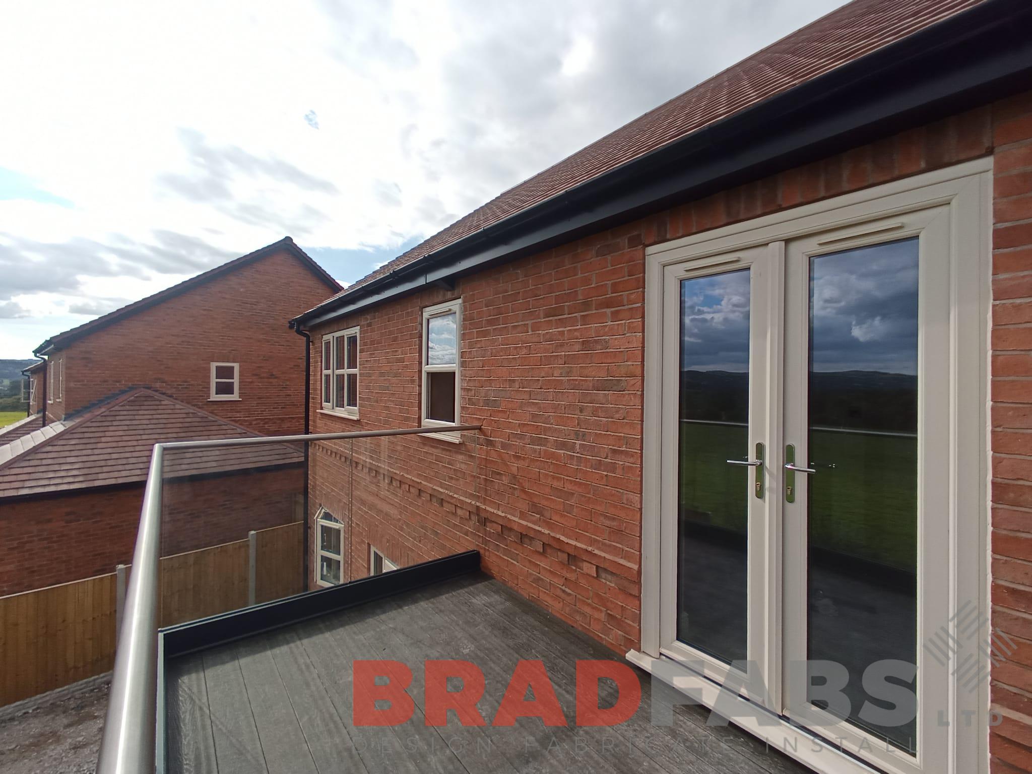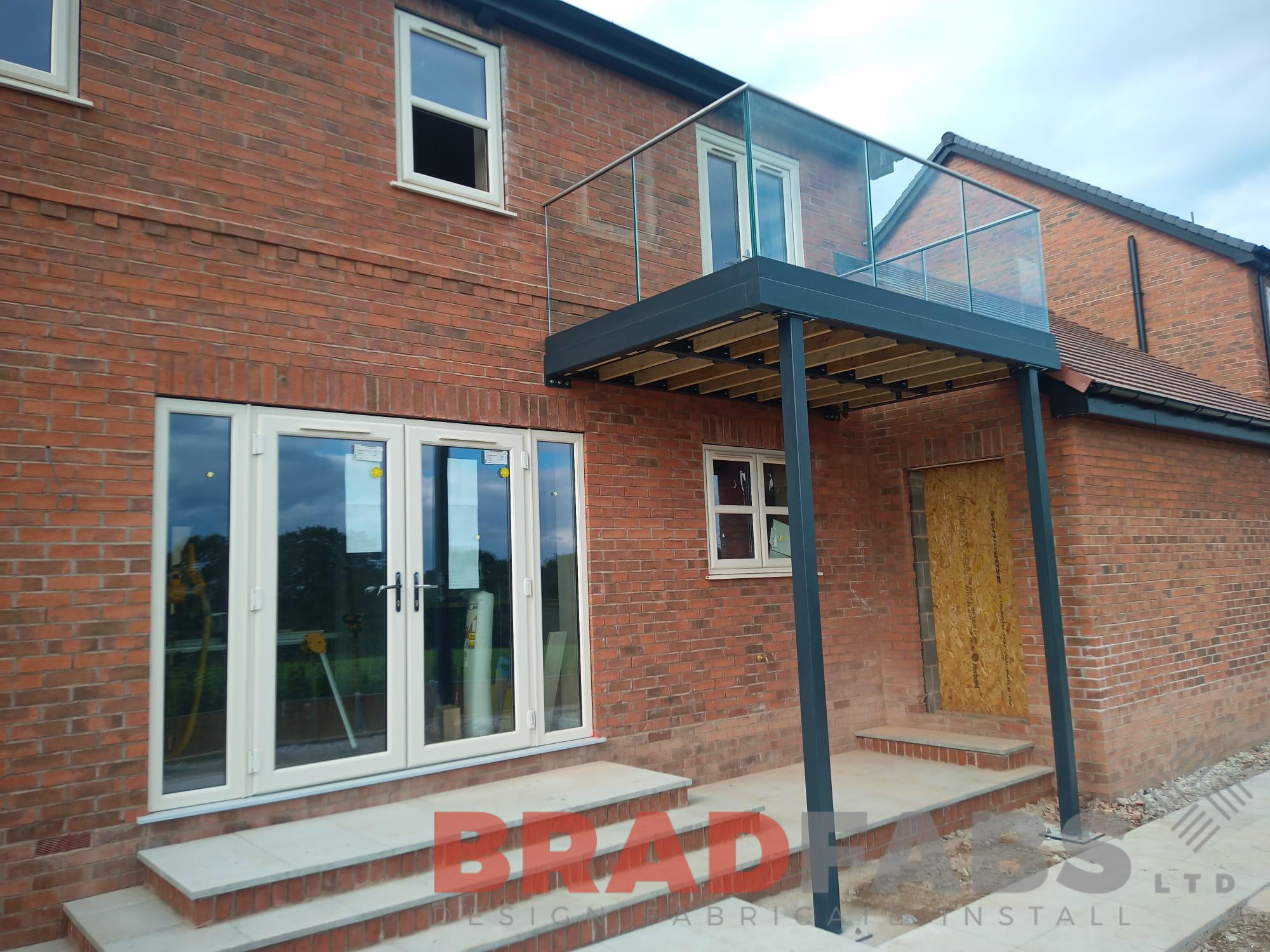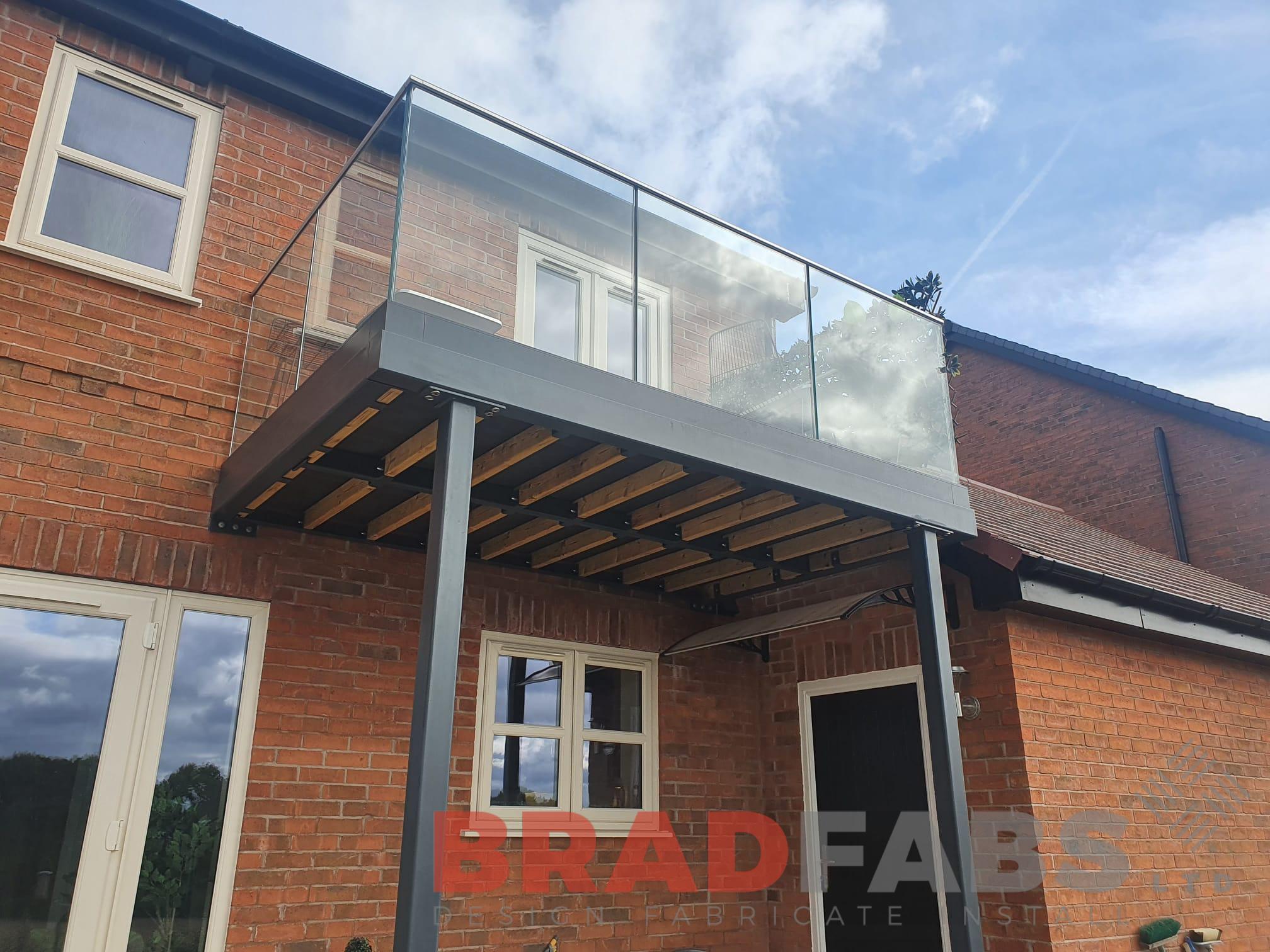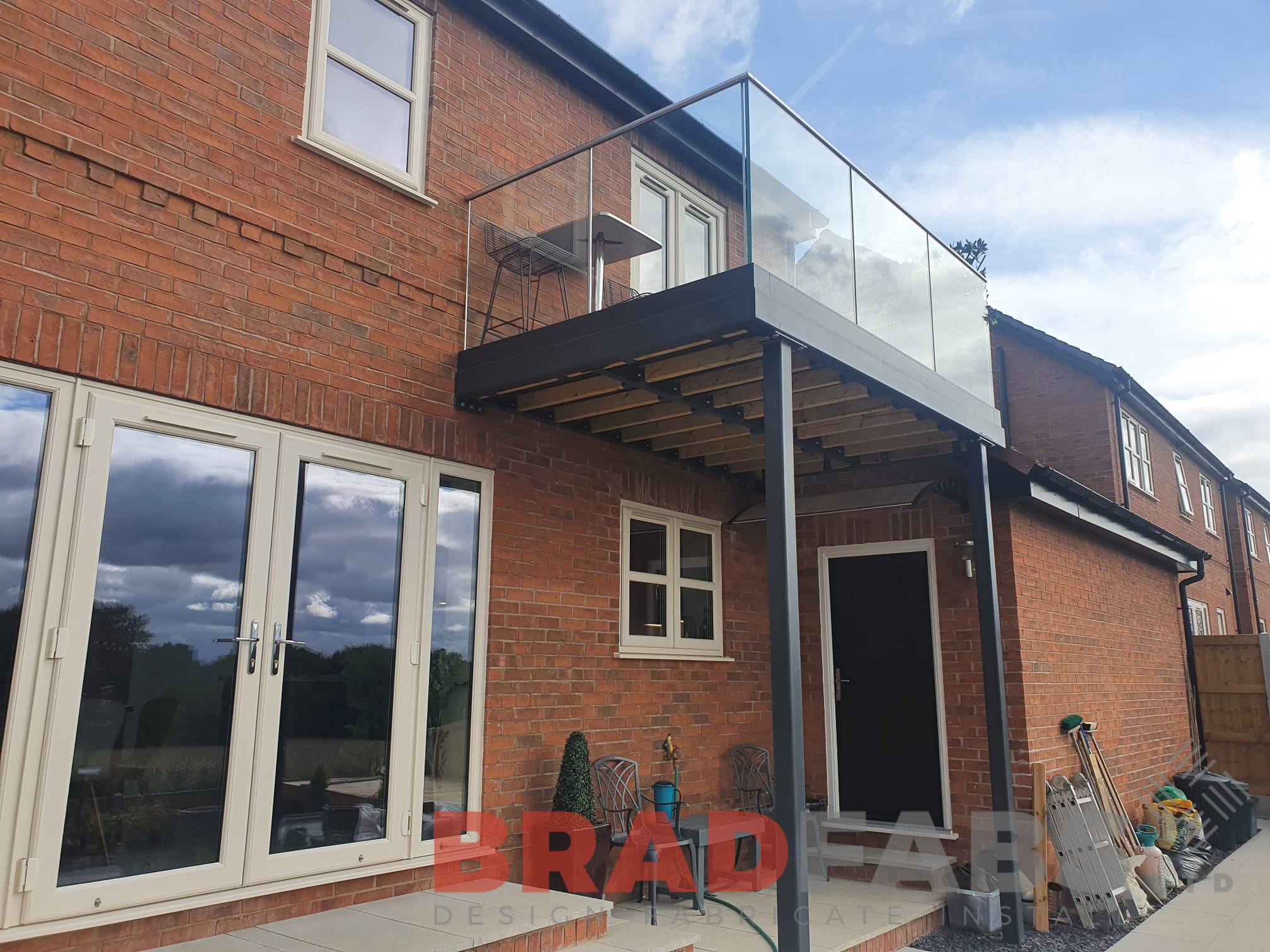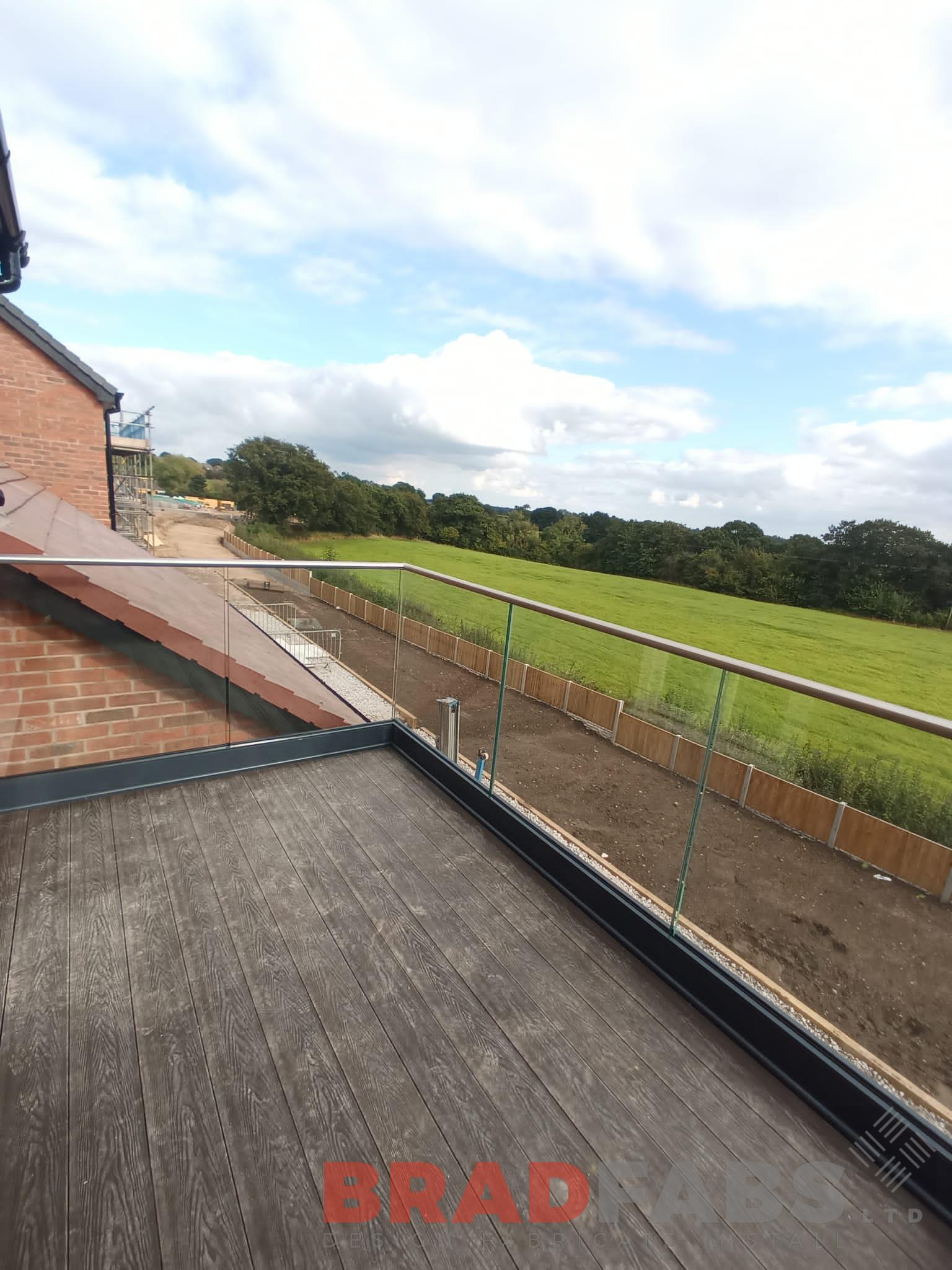 Modern bespoke design balcony with two supporting legs and pressure treated tanalised timber joists to the underside of the decking, complete with channel system infinity glass balustrade, with stainless steel top rail