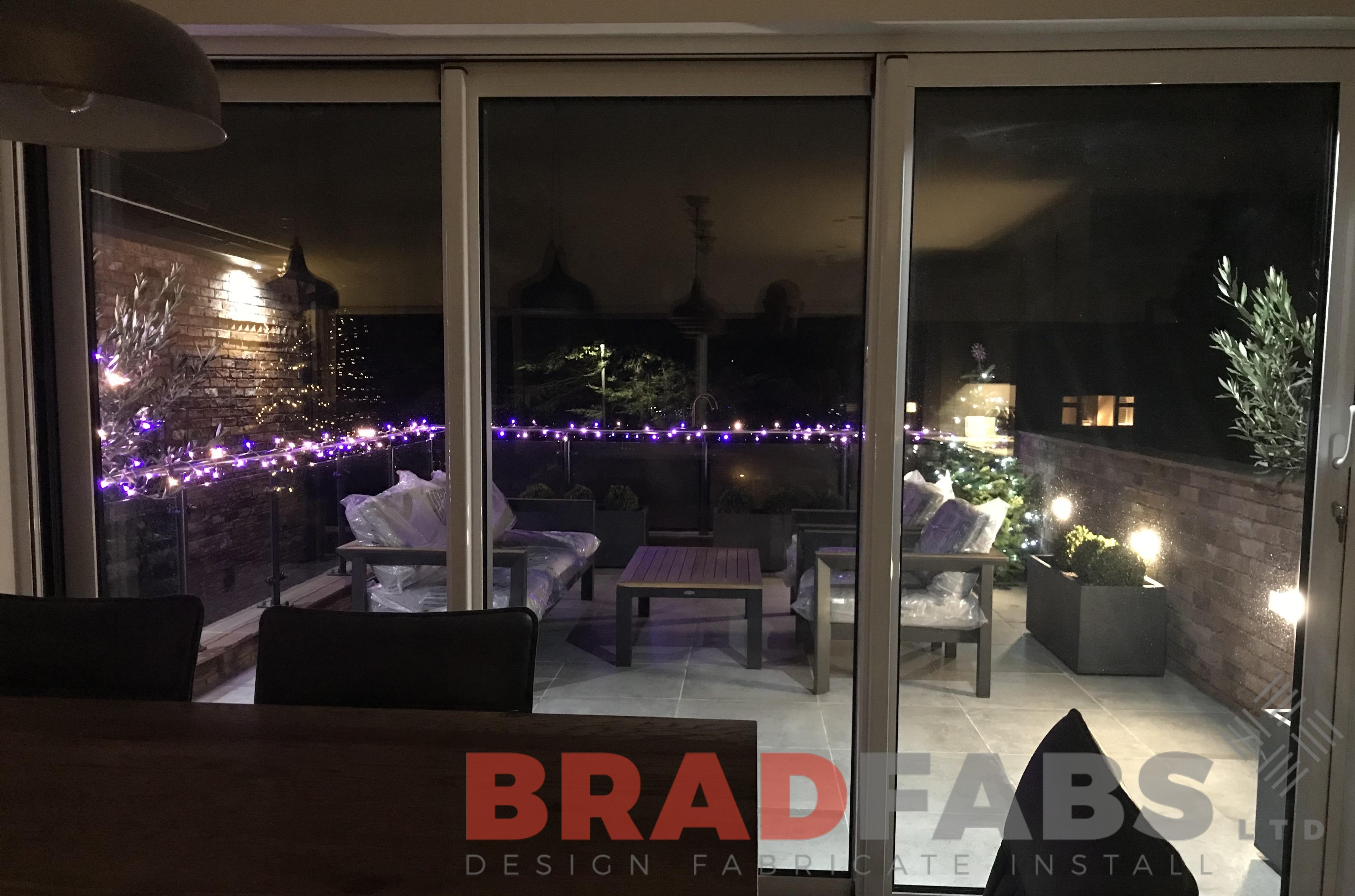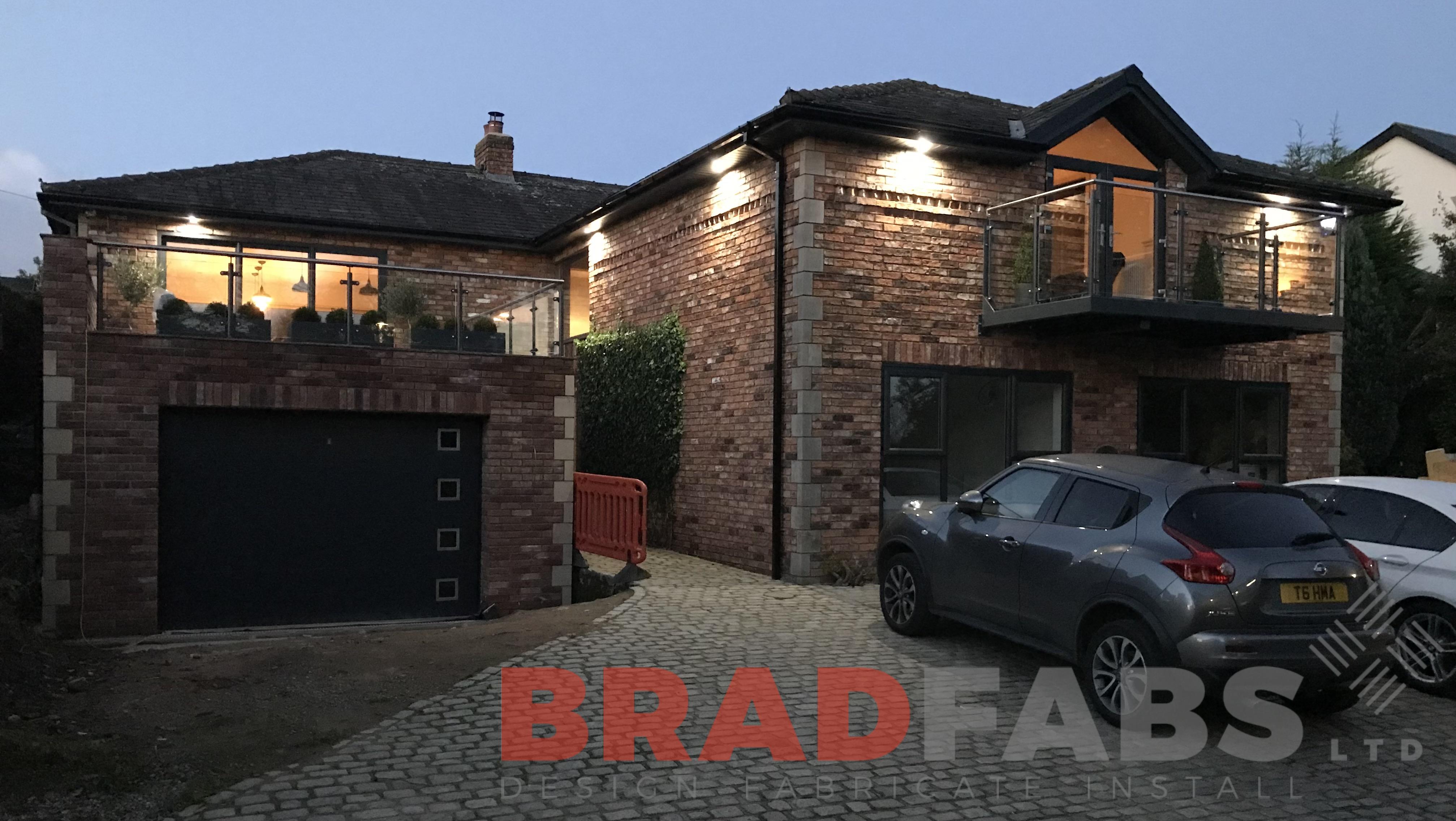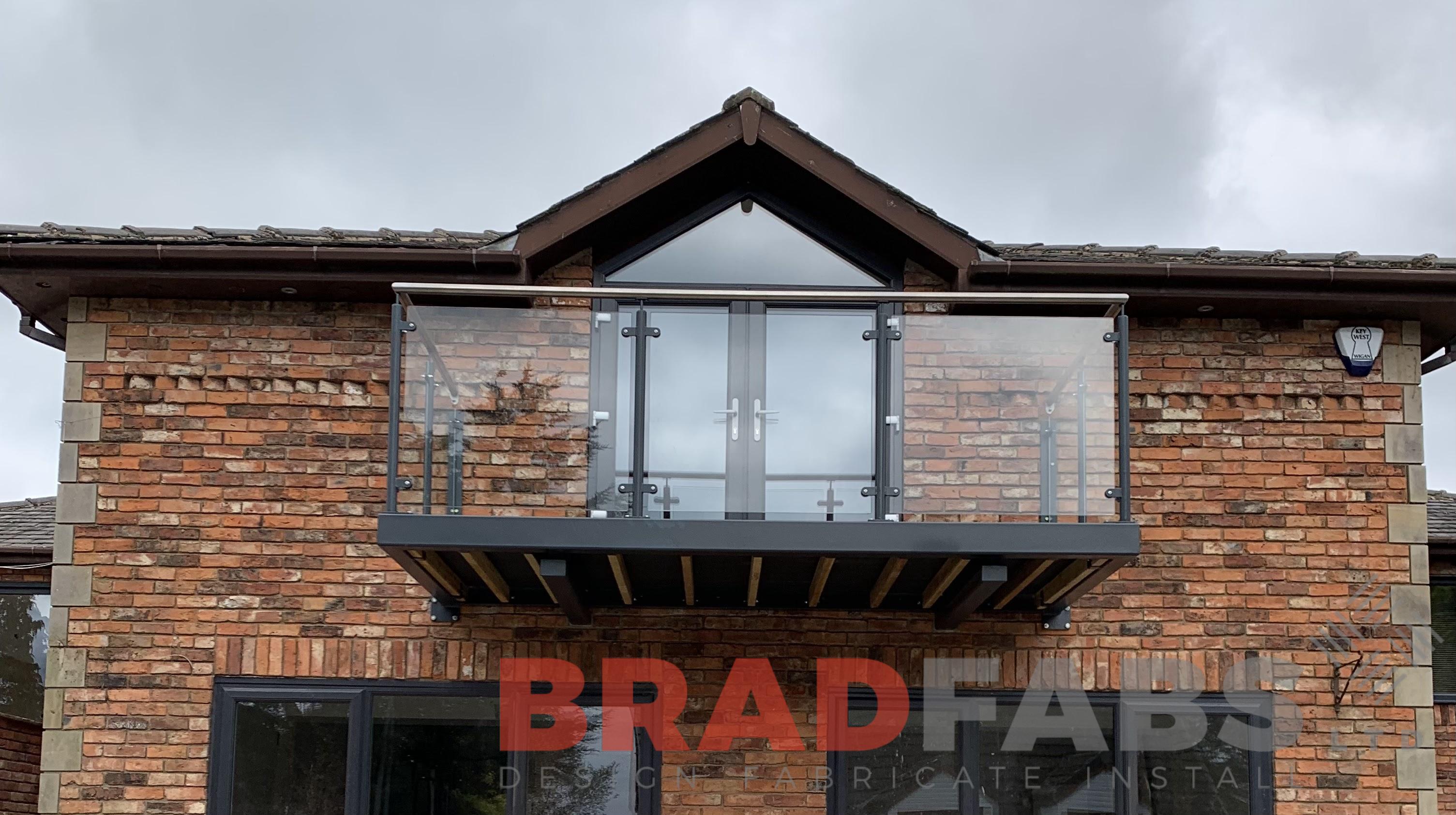 Cantilevered design with mild steel, galvanised and powder coated posts, to match the balcony frame, and stainless steel top rail, complete with glass infill panels.