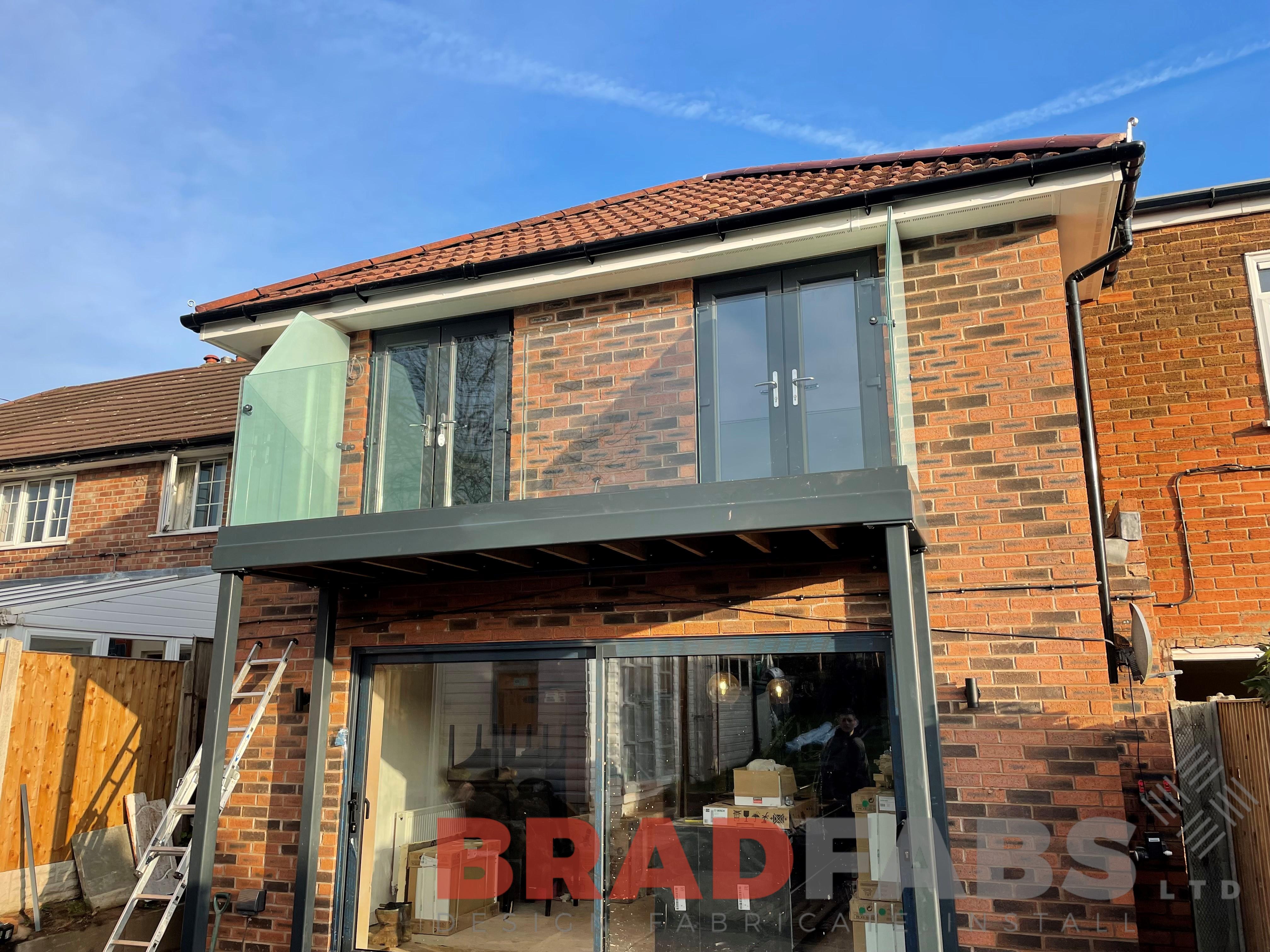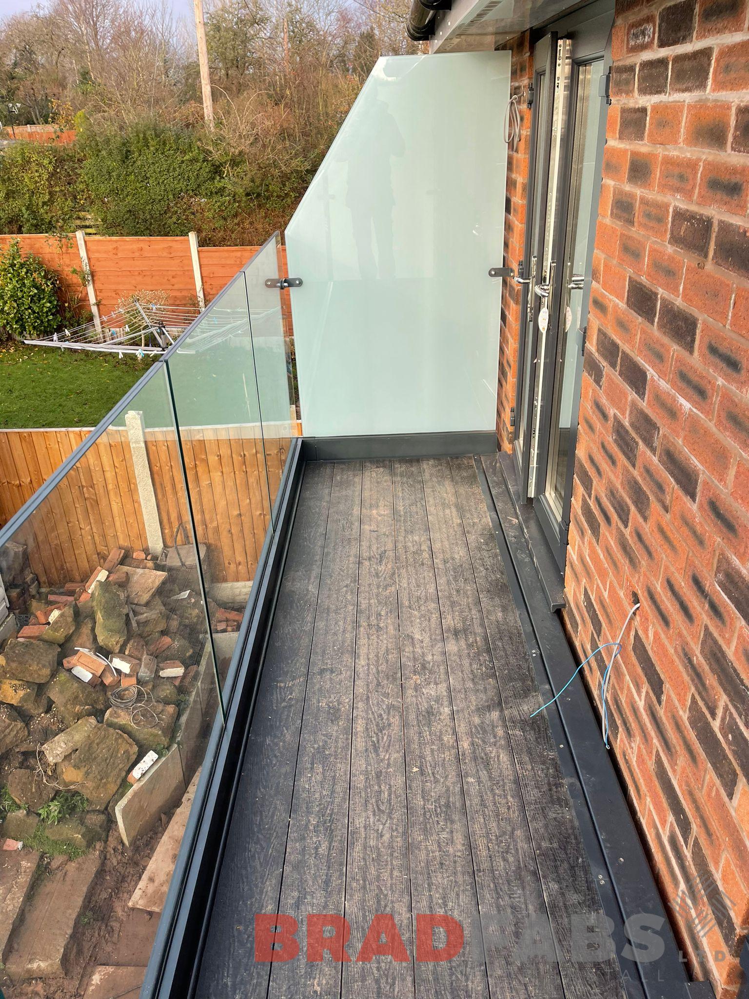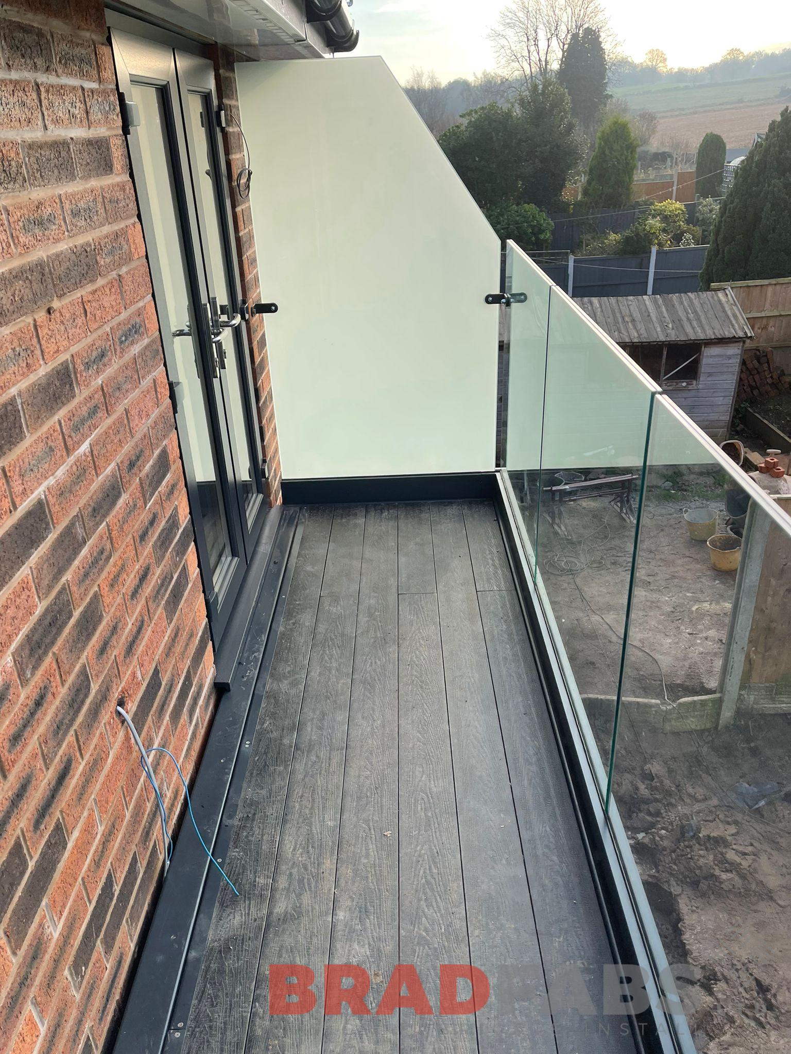 Steel balcony with two supporting legs, channel system infinity glass and privacy screen to both sides