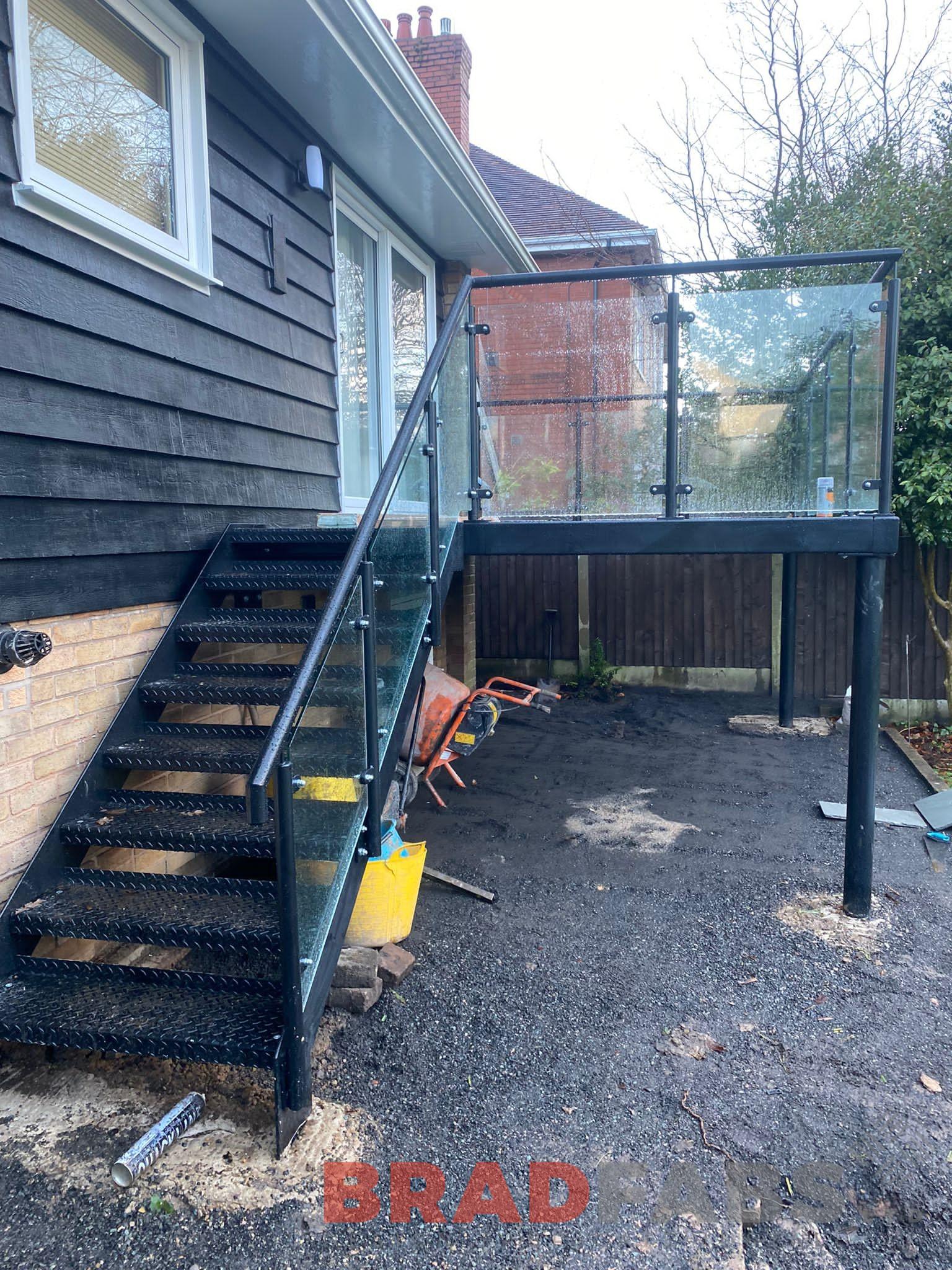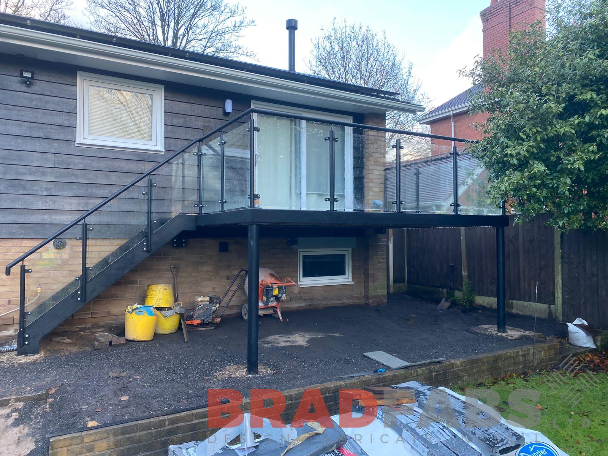 Mild steel, galvanised and powder coated black balcony with straight staircase. With mild steel and glass balustrade for both balcony and staircase. complete with composite decking for the balcony and durbar treads for the staircase