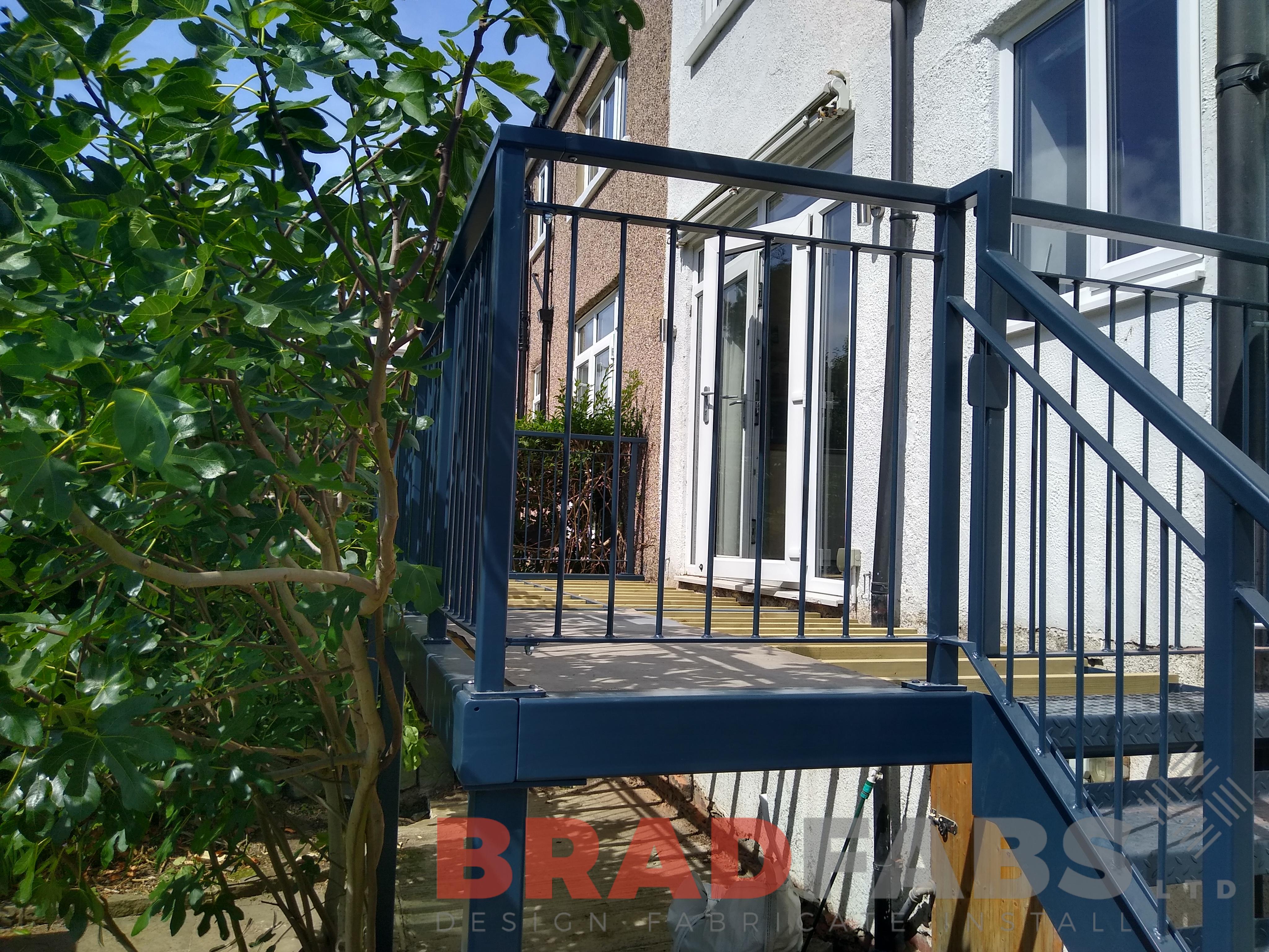 Bespoke Balcony for a domestic property, manufactured in mild steel, galvanised and powder coated with vertical bar balustrade with flat bar top rail