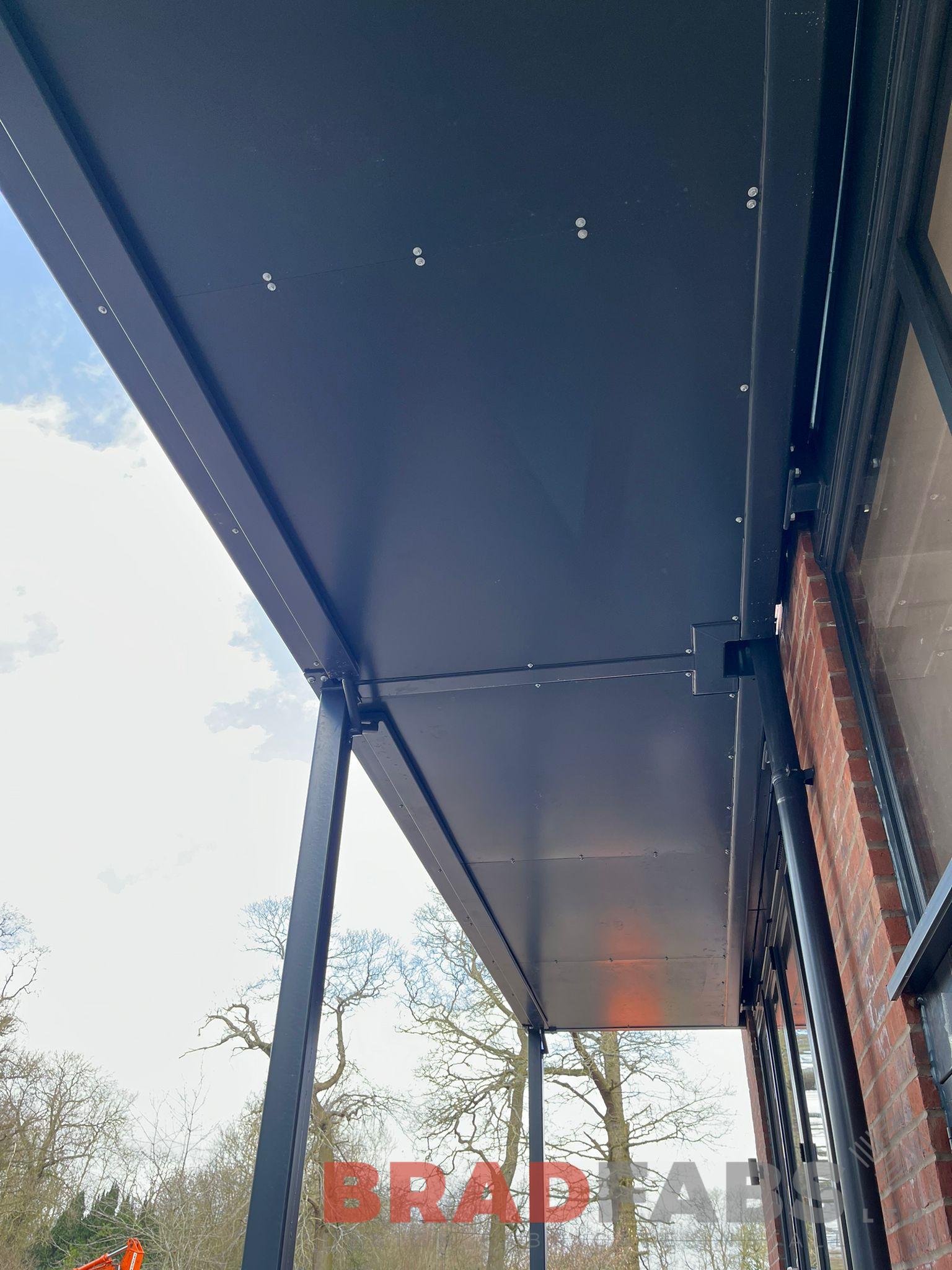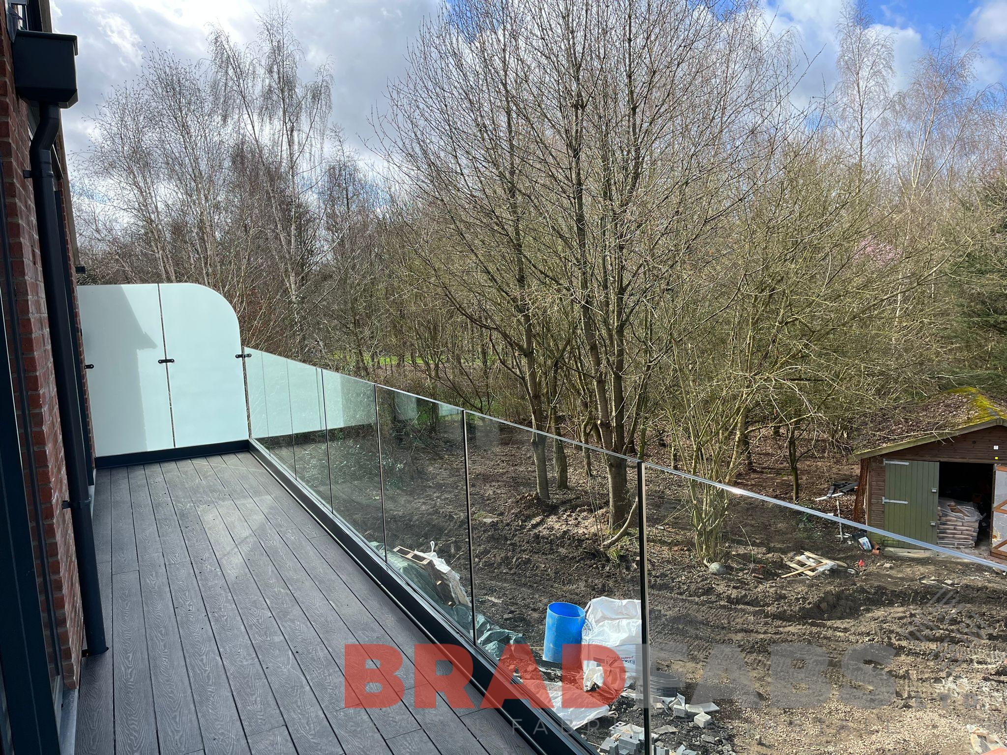 Large balcony with glass balustrade and privacy screen at both sides, finished off with composite decking and shower proof cladding to the under side of the balcony.