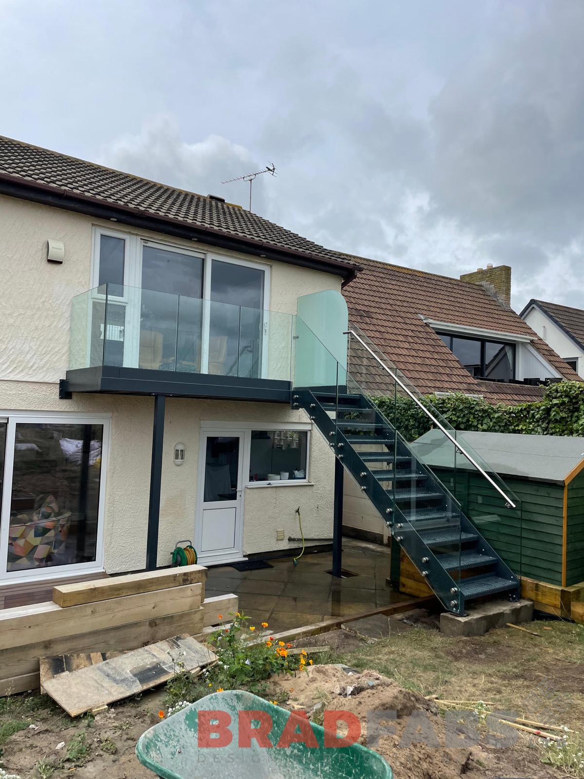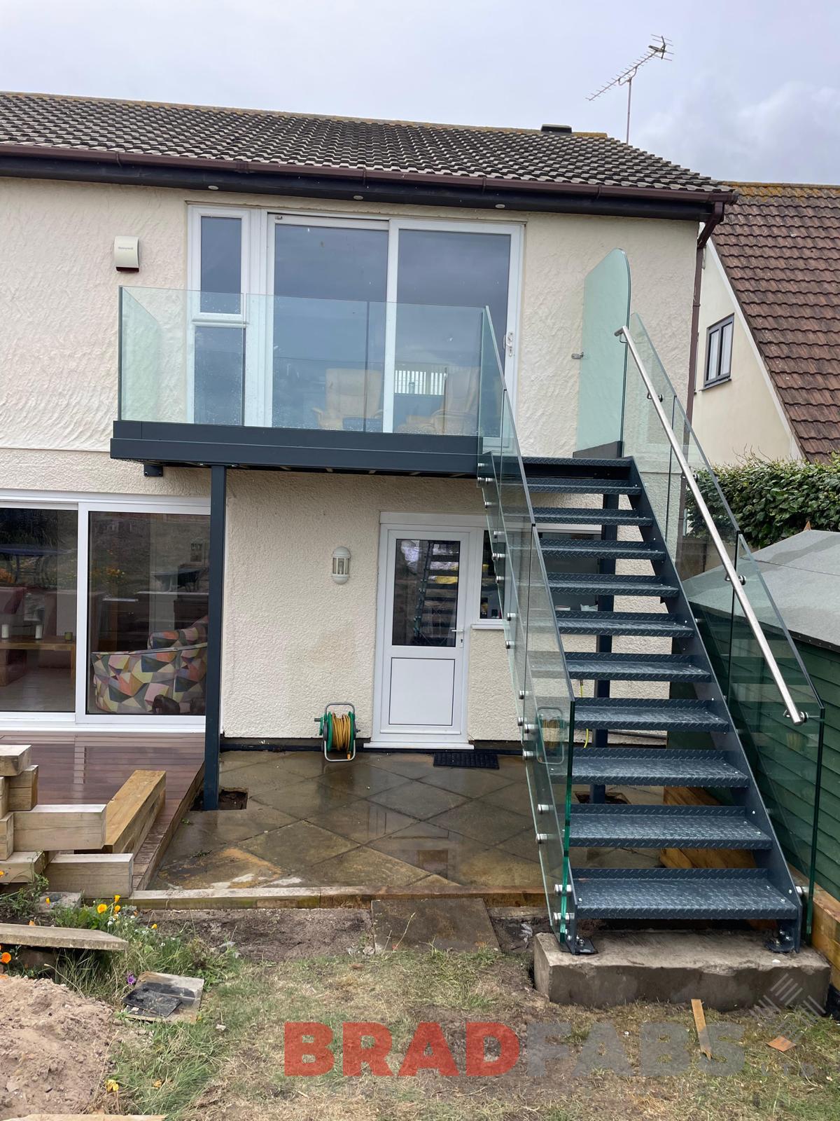 A modern addition to our customers home, bespoke steel balcony with channel system infinity glass on the balcony and straight staircase leading down to the garden with bolt on infinity glass