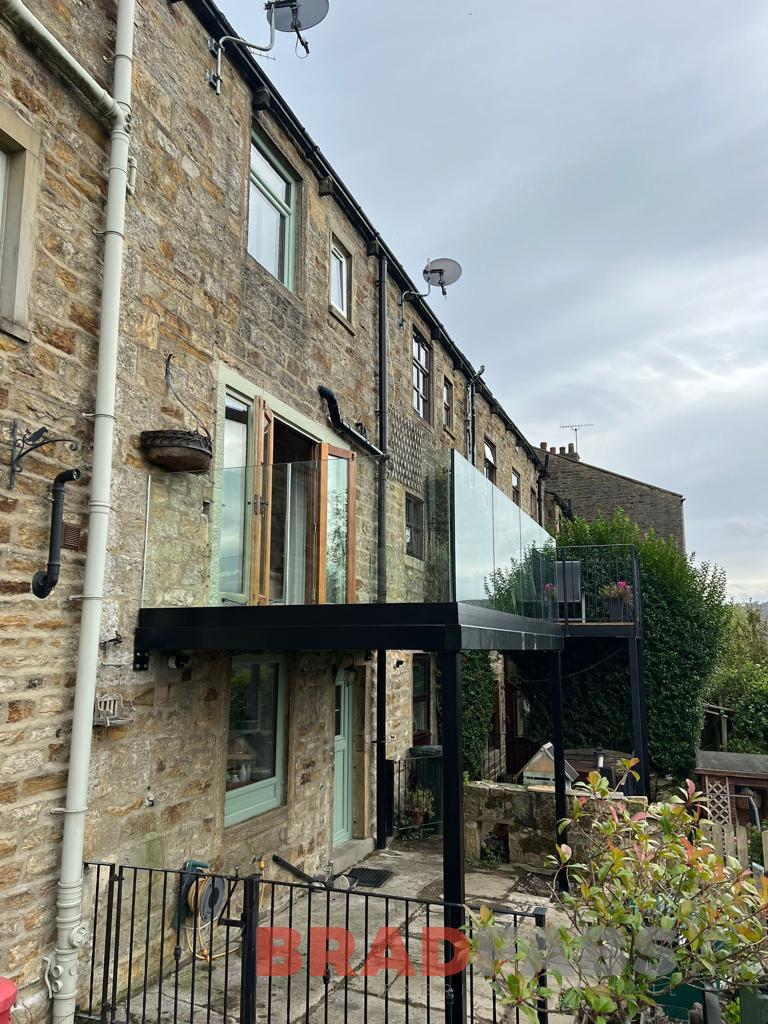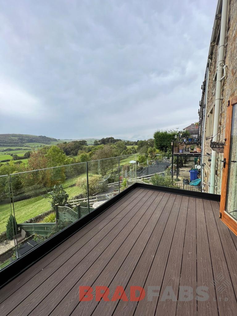 Bespoke steel balcony with channel system infinity glass and complete with composite decking