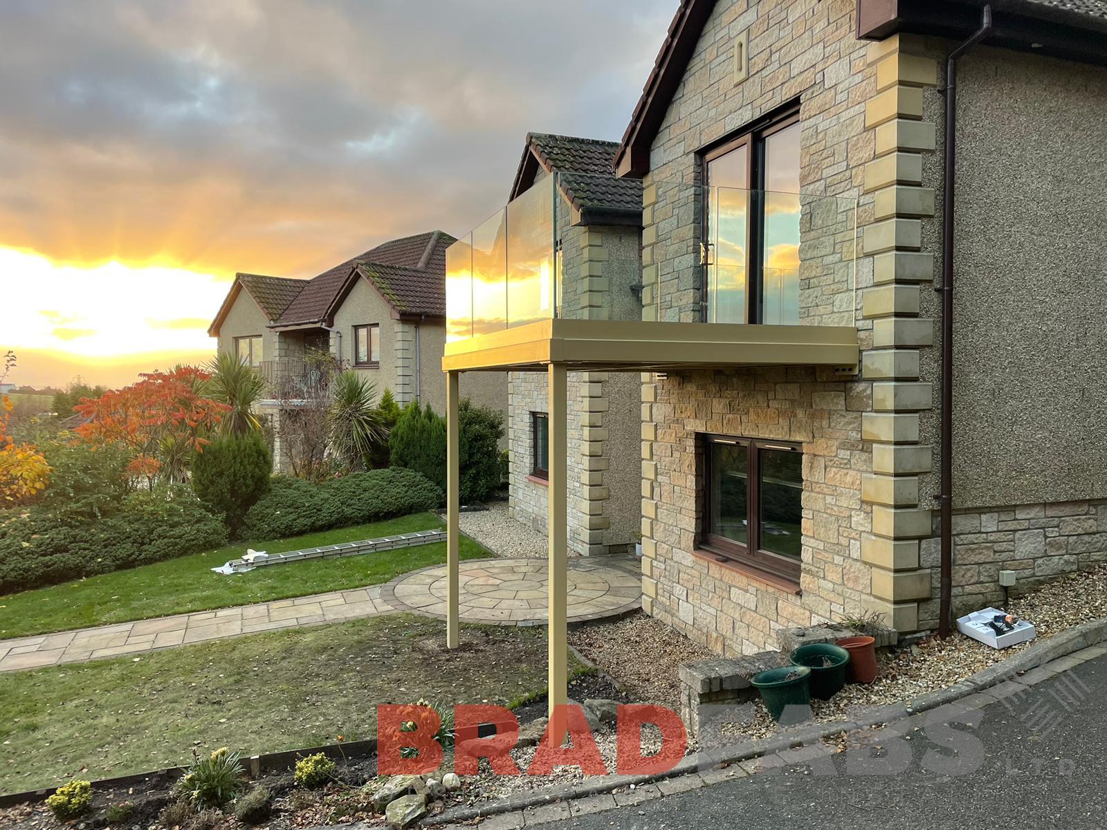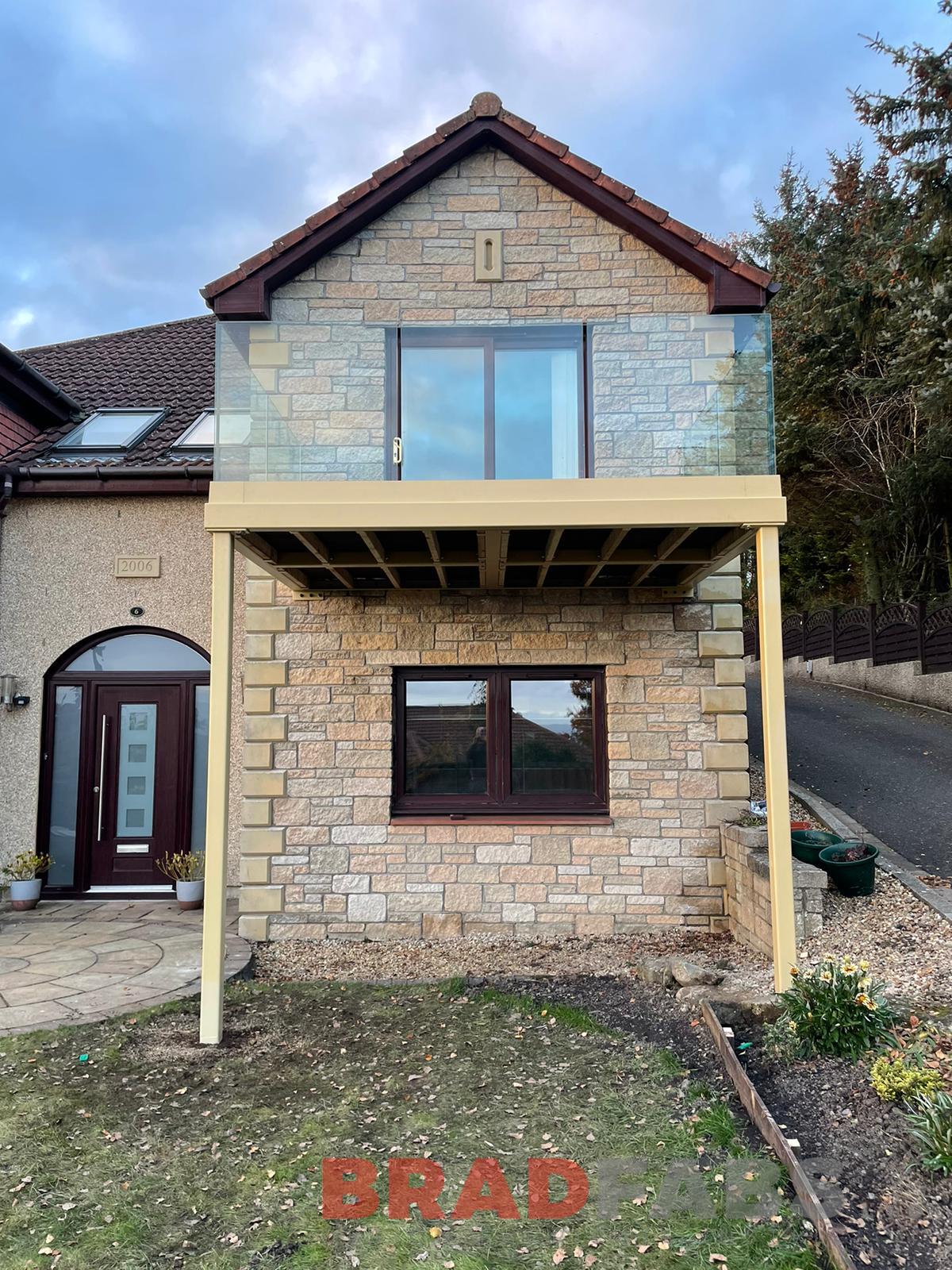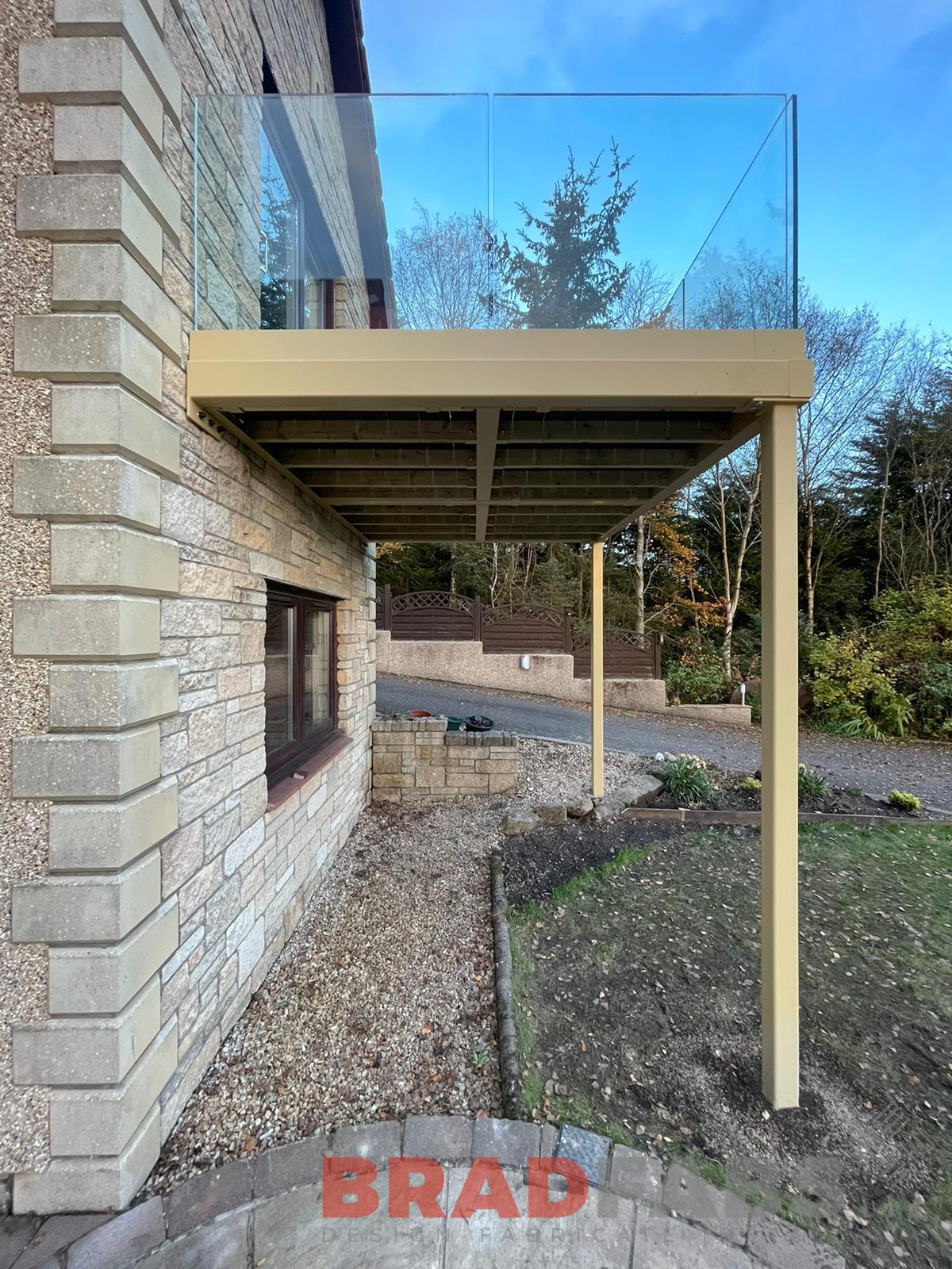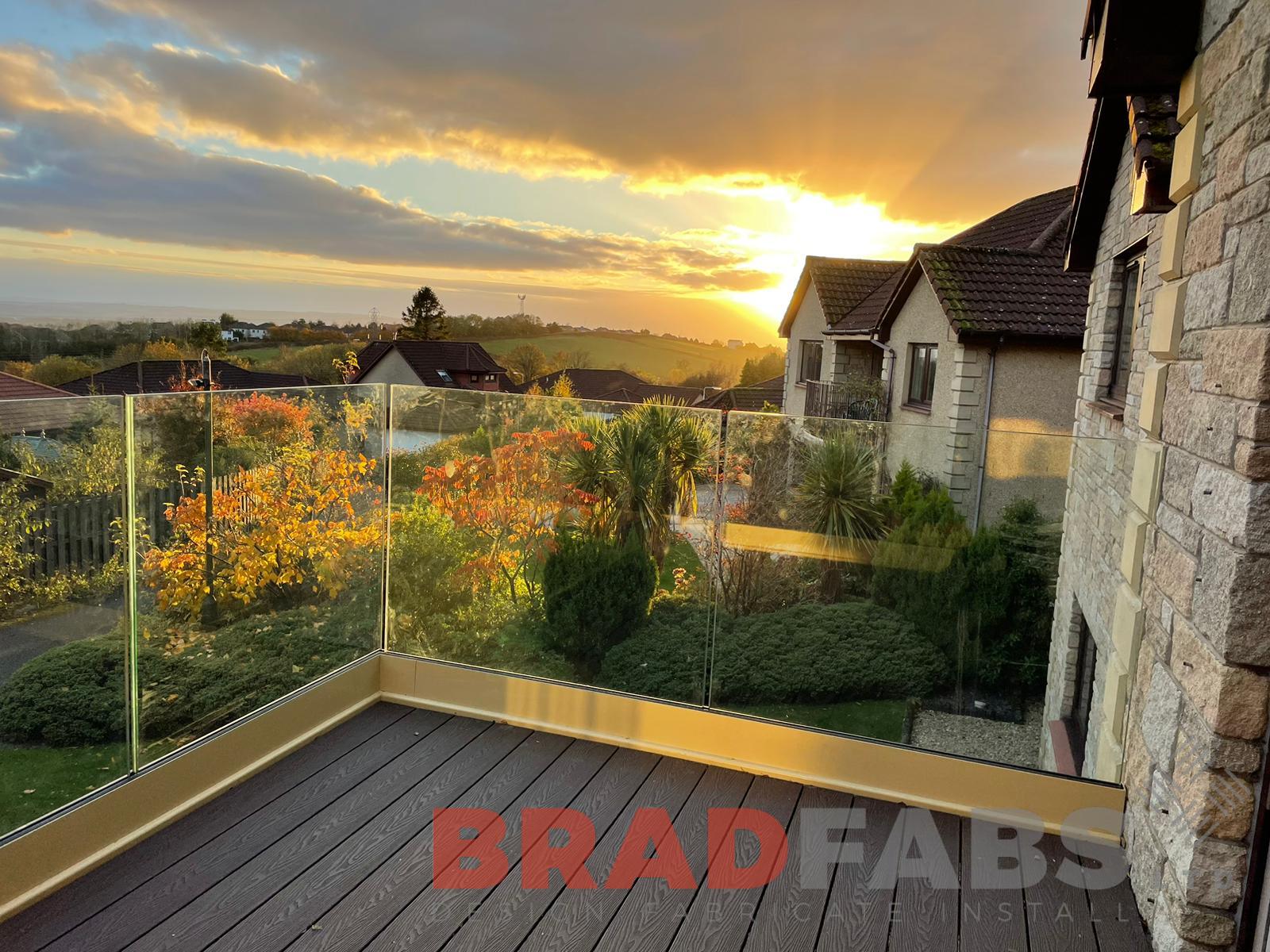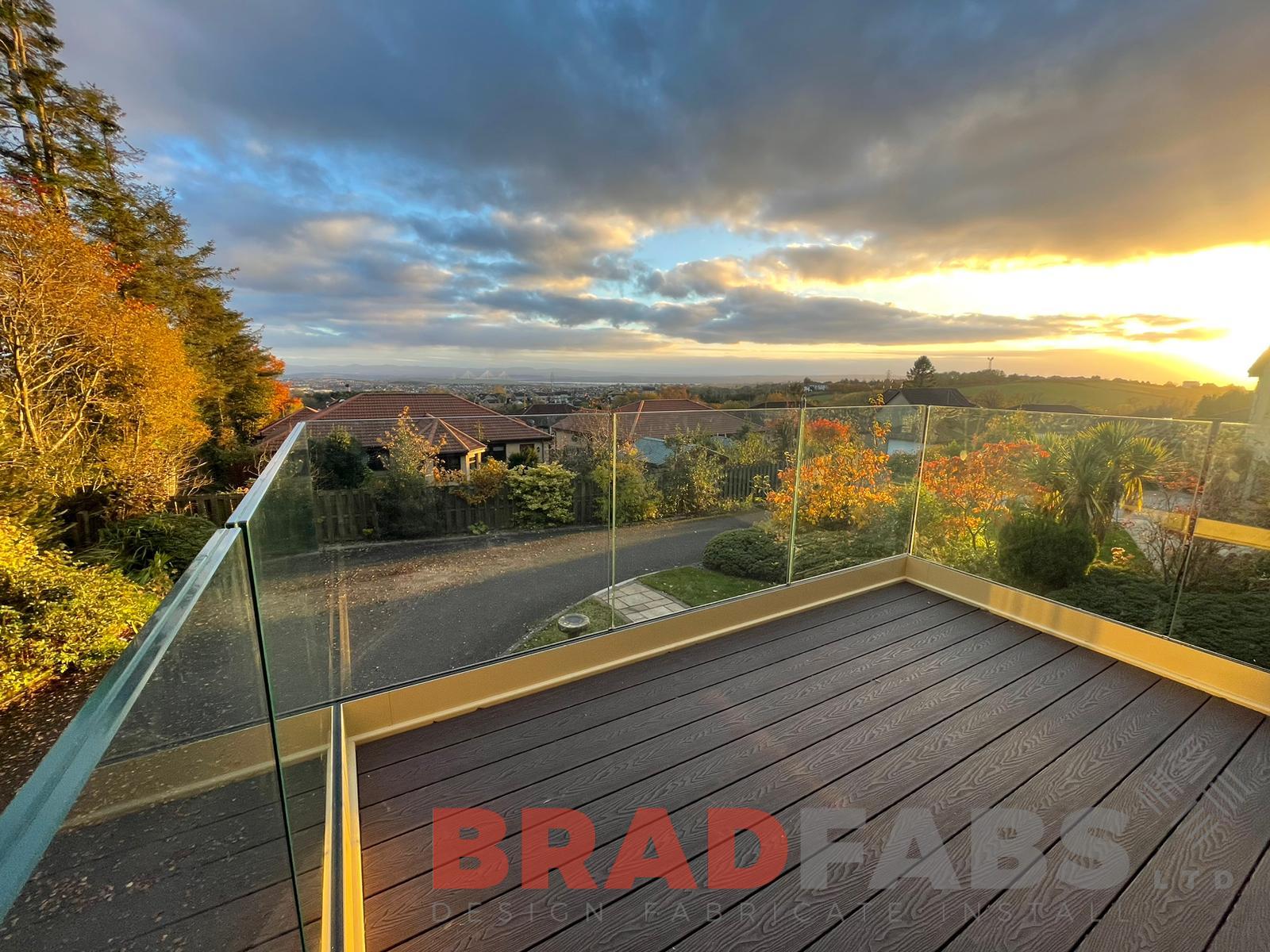Stunning bespoke balcony with channel system infinity glass and complete with composite decking. Powder coated to the RAL colour of our customers choice.