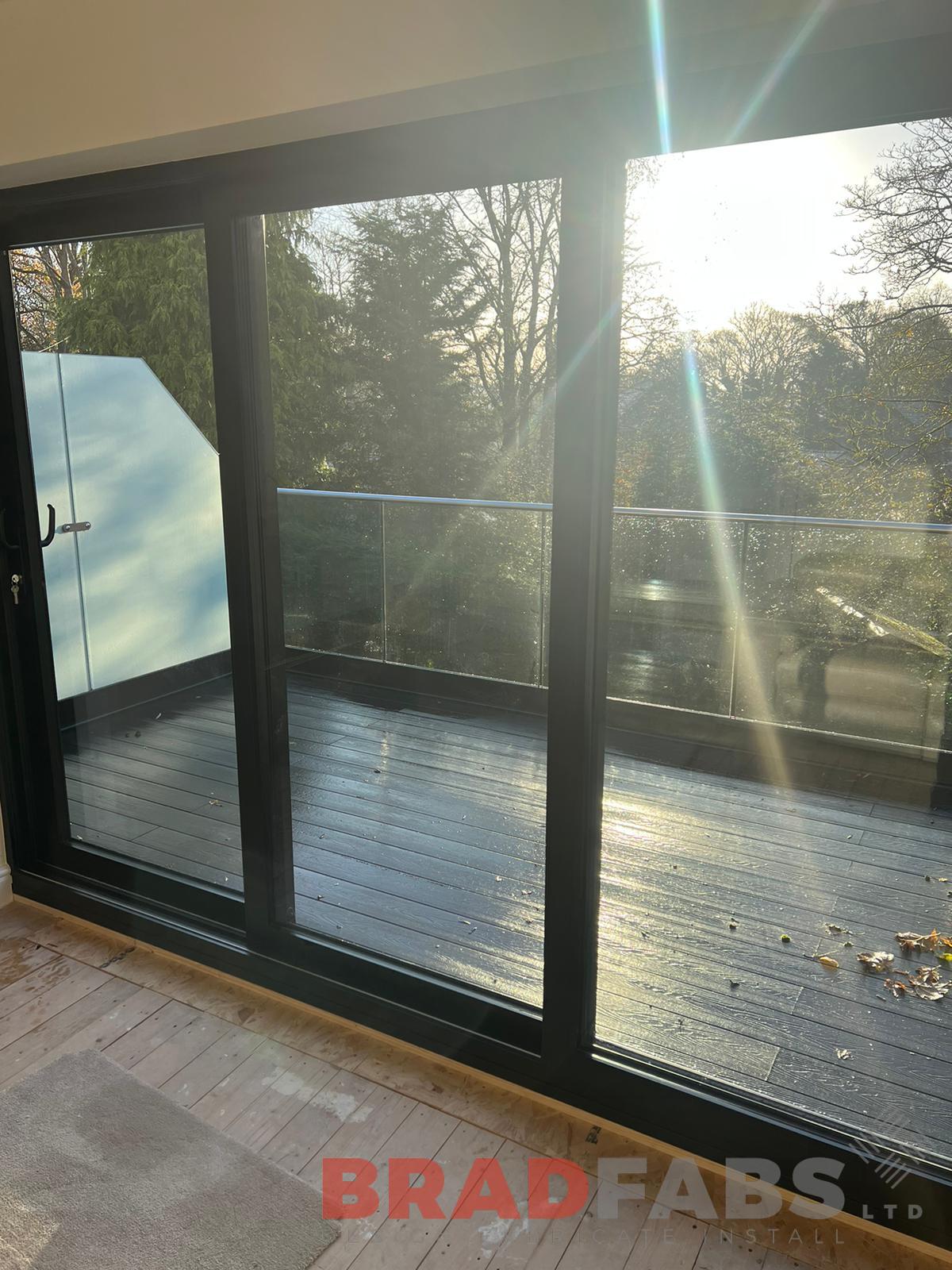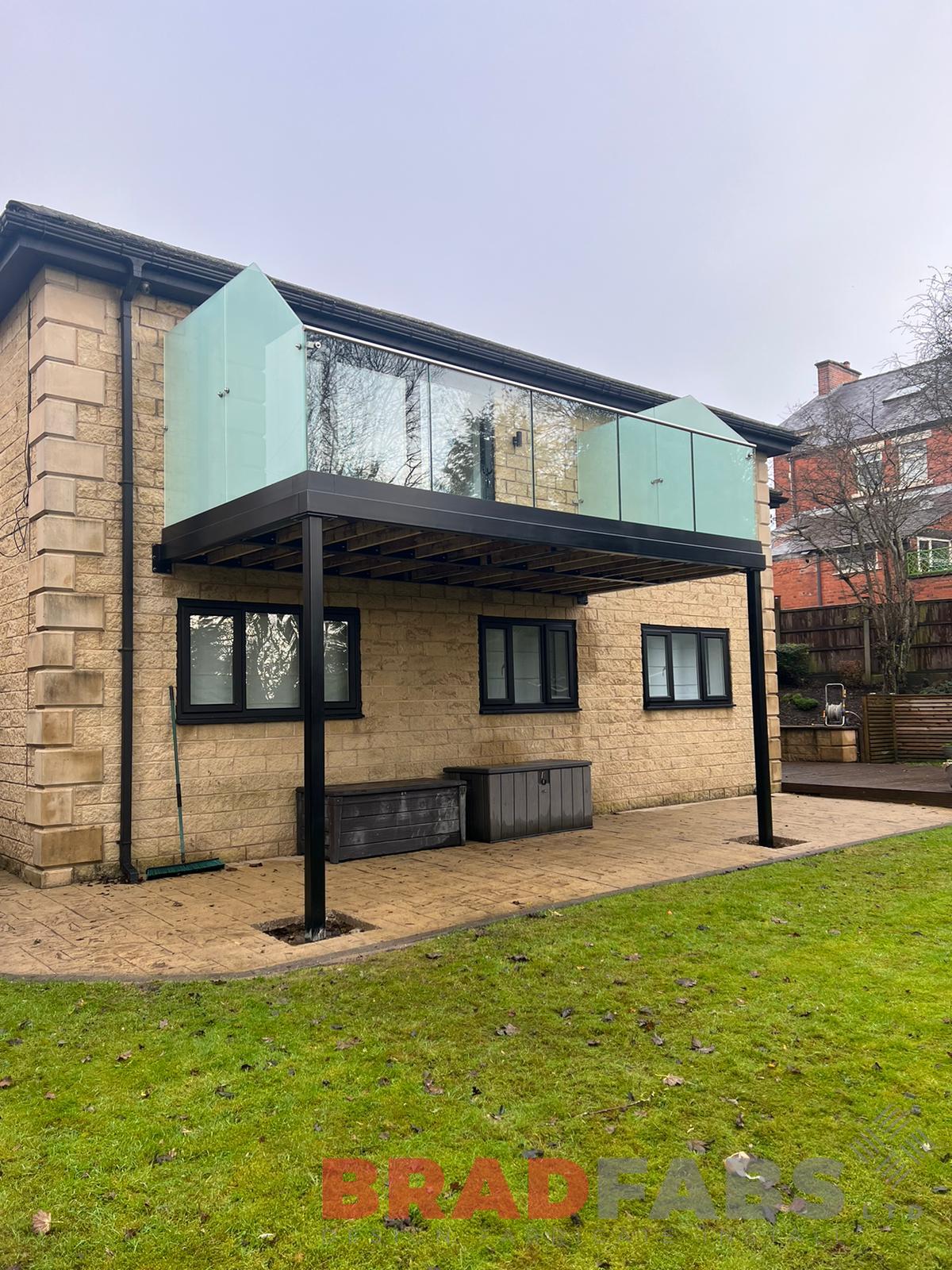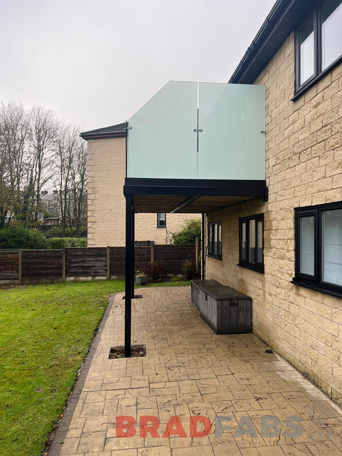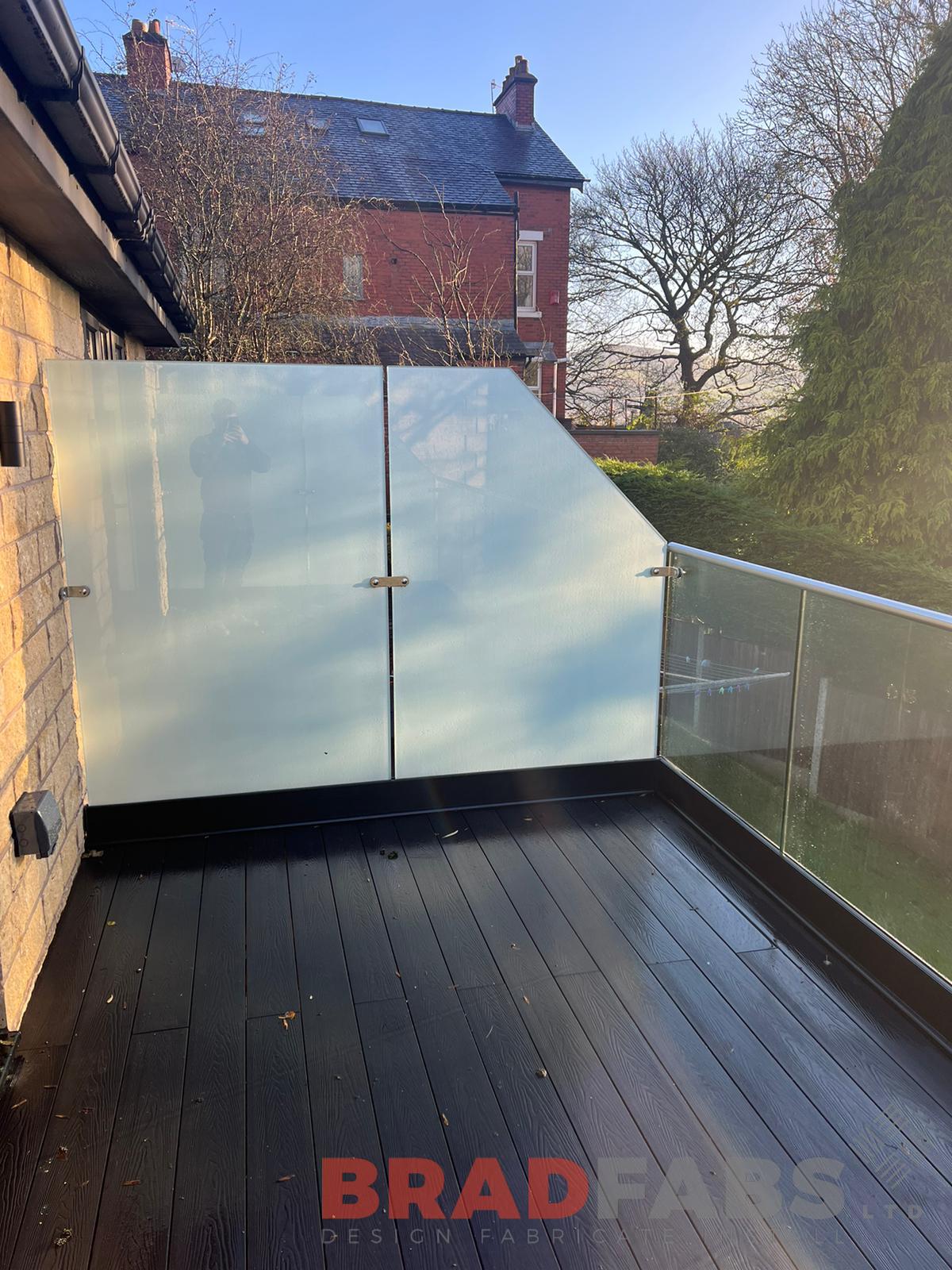 Beautiful modern domestic property balcony with privacy screen to both sides, glass balustrade and composite decking.