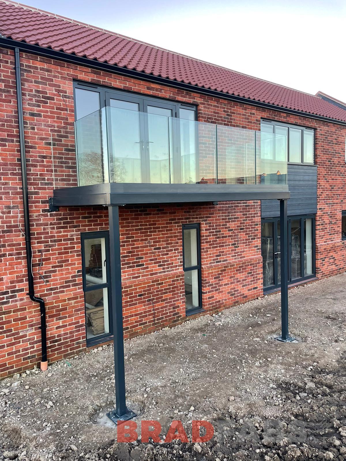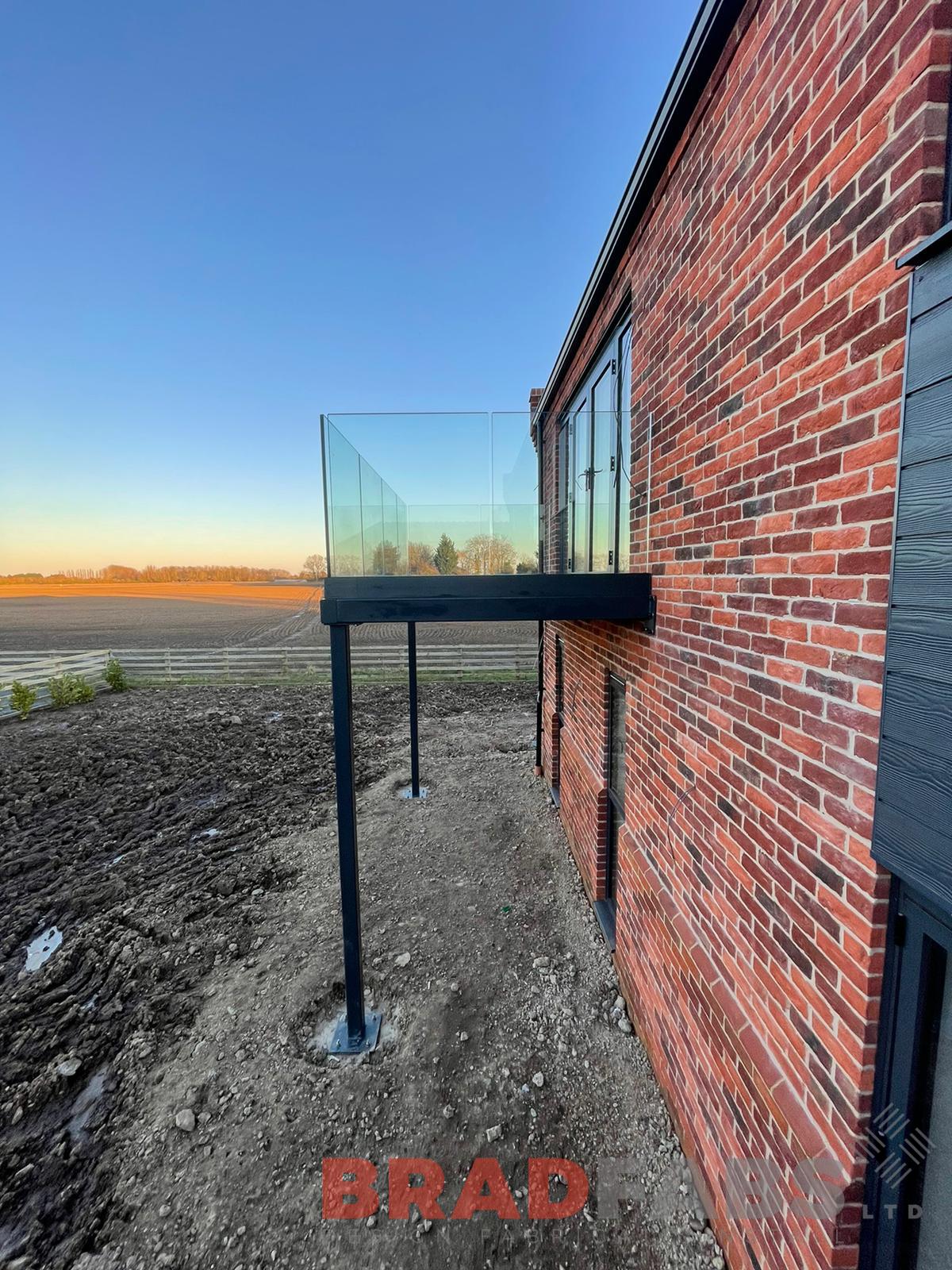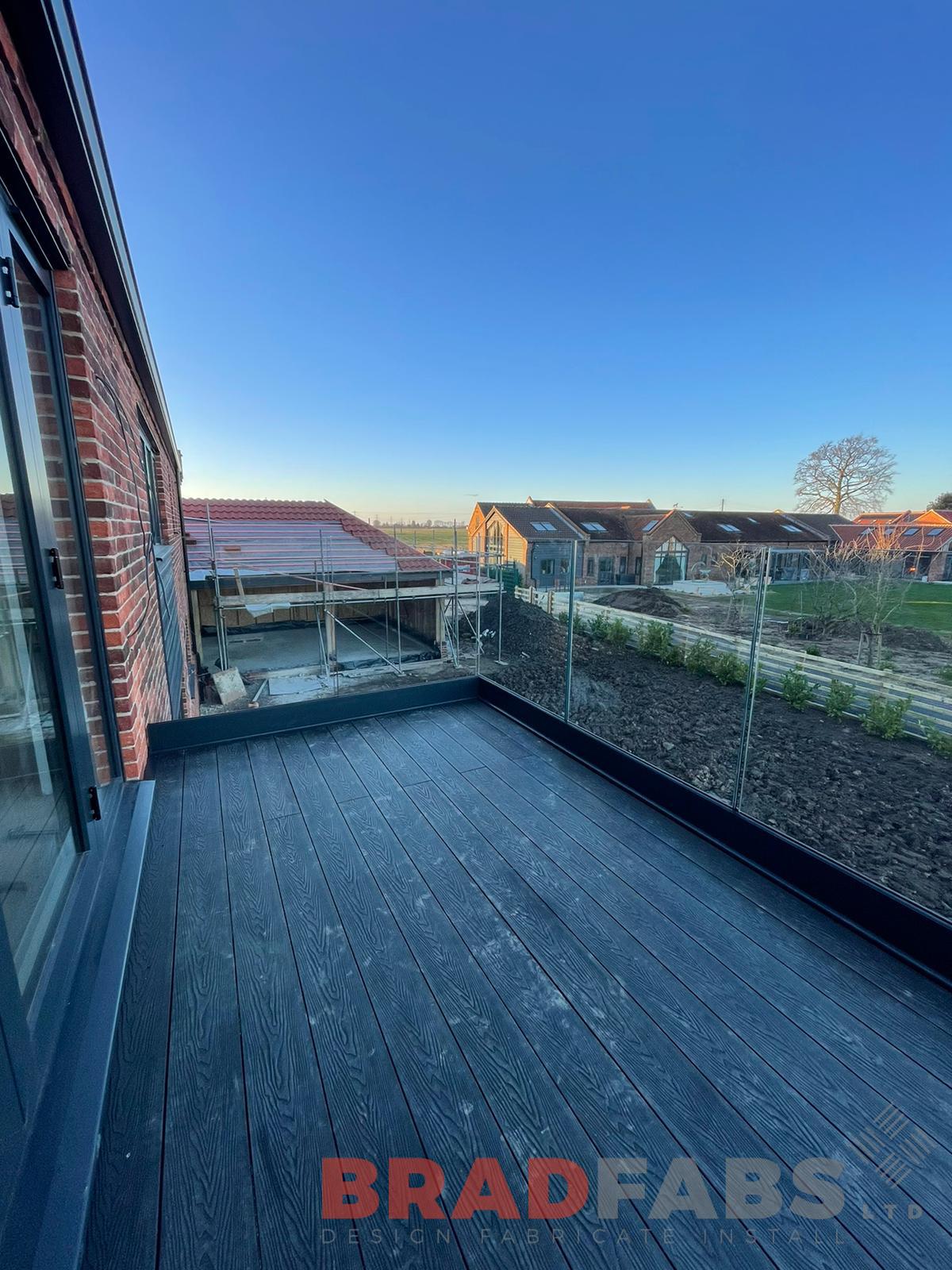 Bespoke steel balcony with channel system infinity glass complete with composite decked flooring