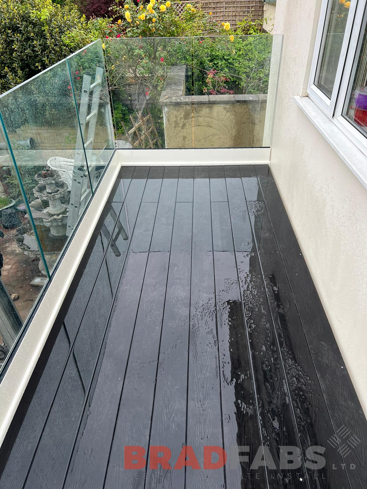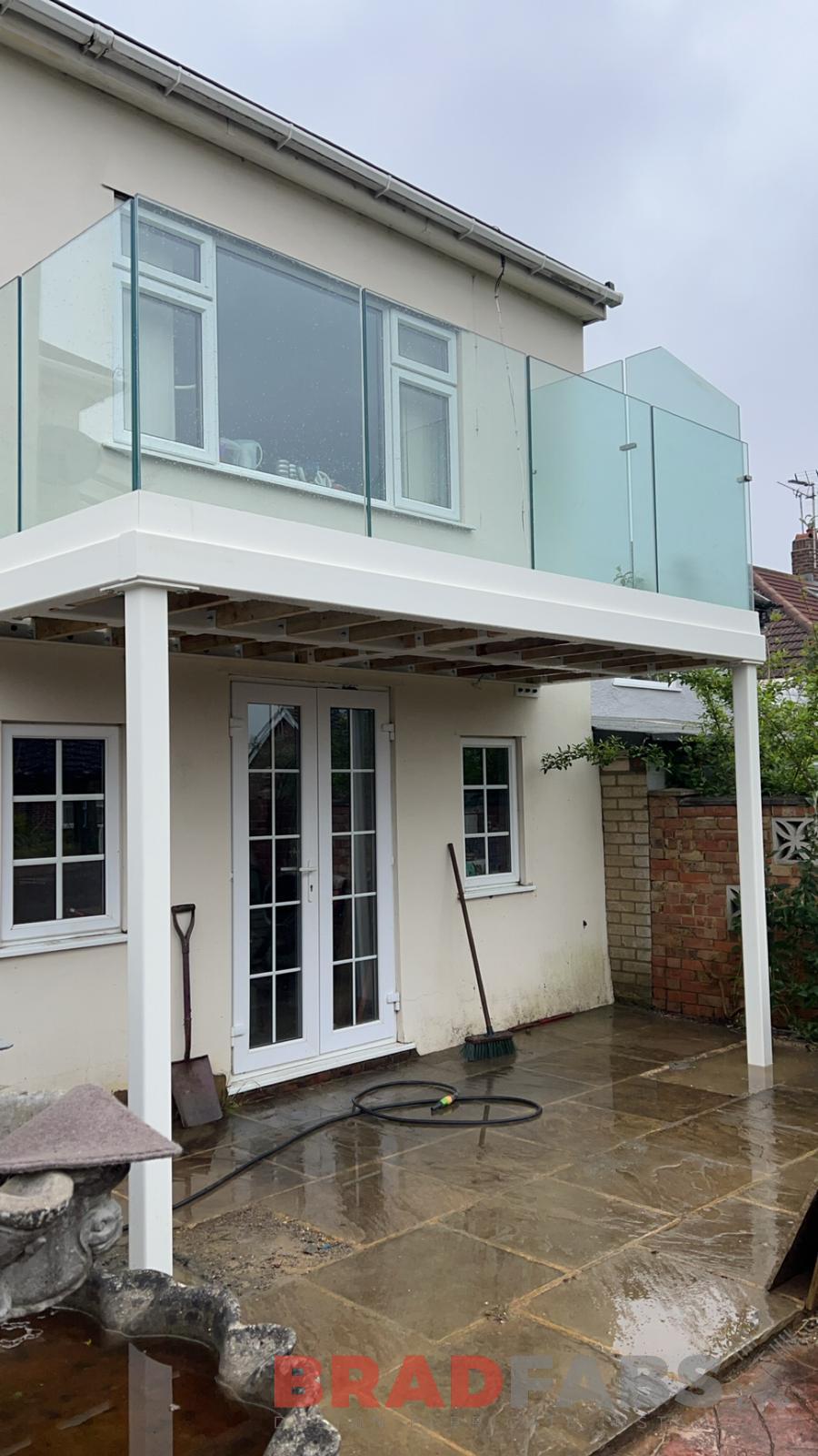 Balcony with two support legs, channel system infinity glass and privacy screen to one side