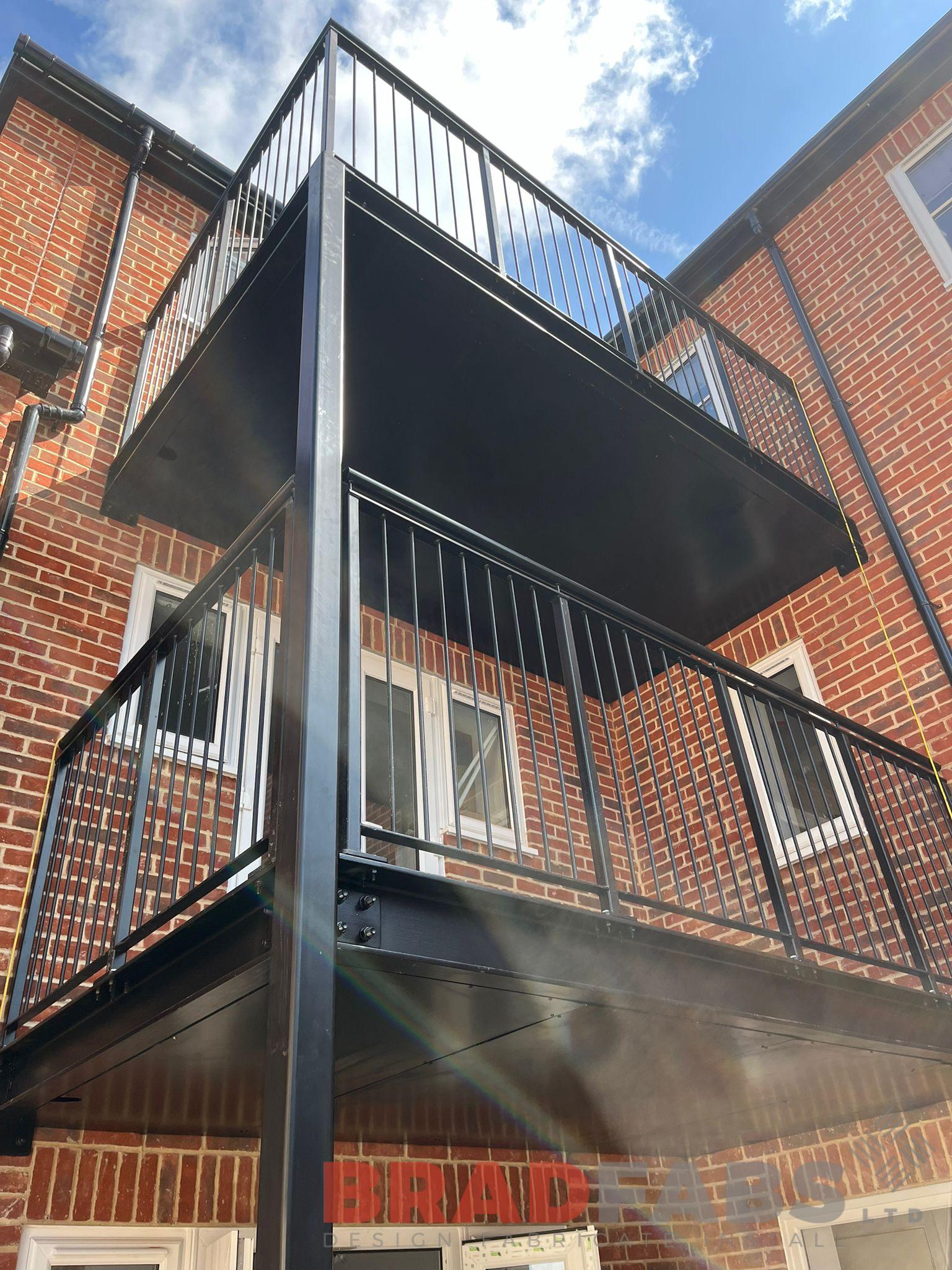 Double stacked balcony with vertical bar balustrade and tubular top rail, powder coated to the RAL colour of our customers choice.