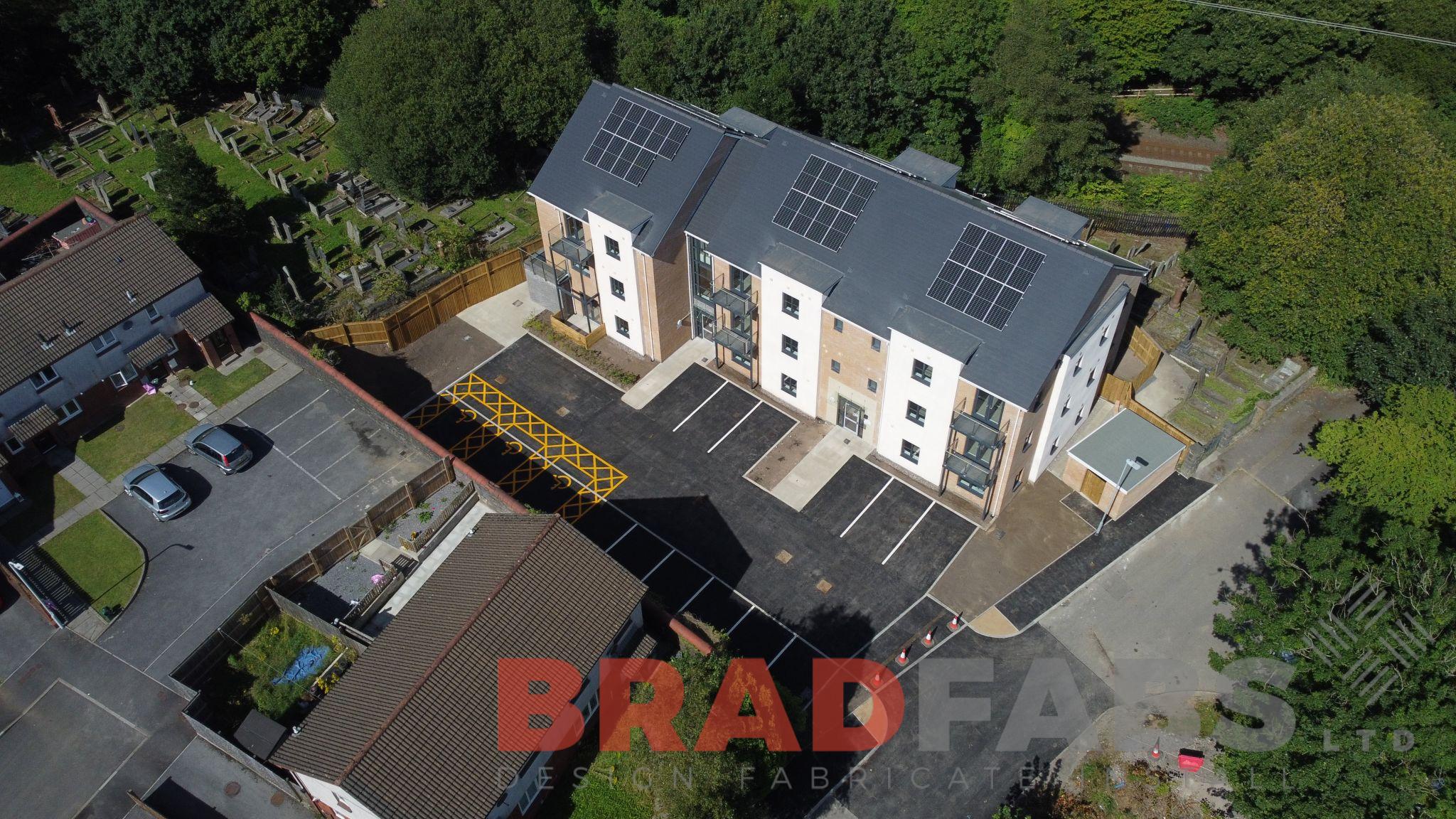 Huge project, with two sets of stacked balconies, one singular balcony and some balustrade around the ledge.