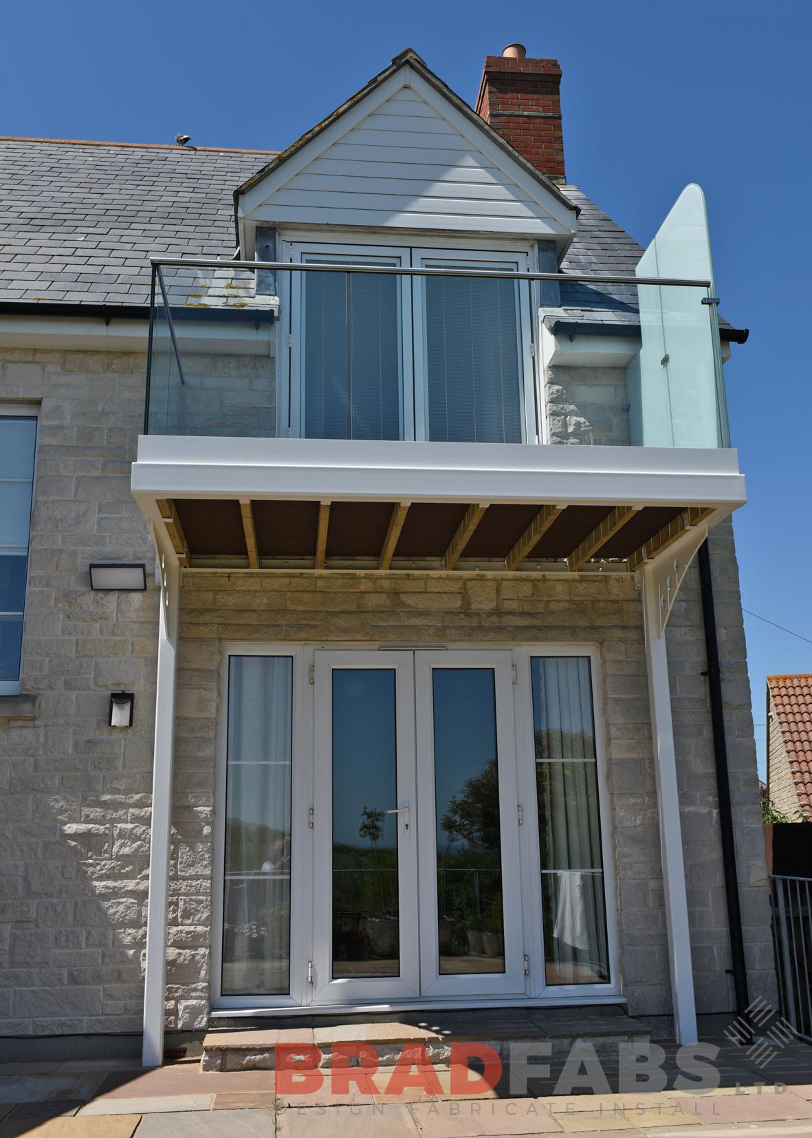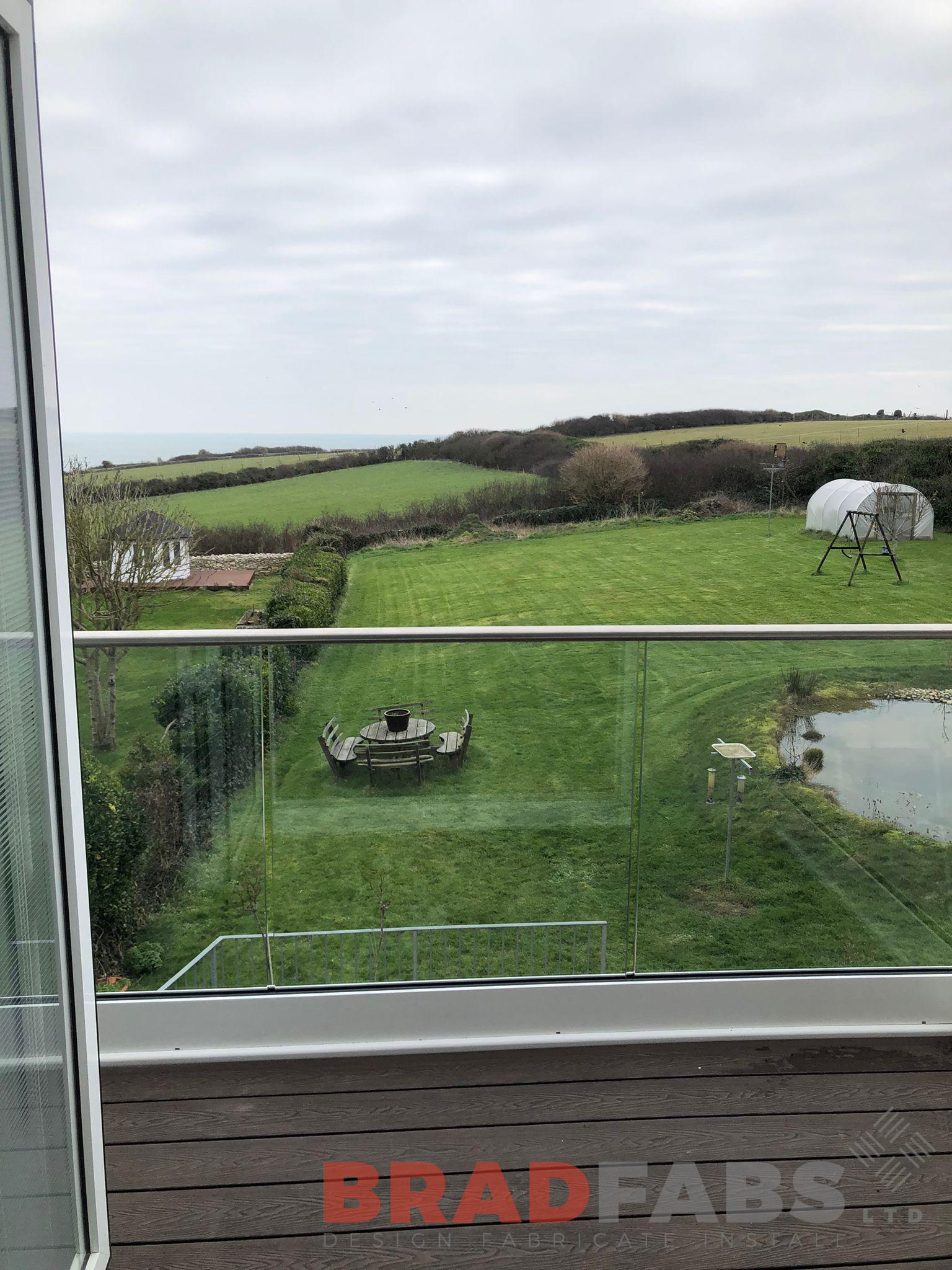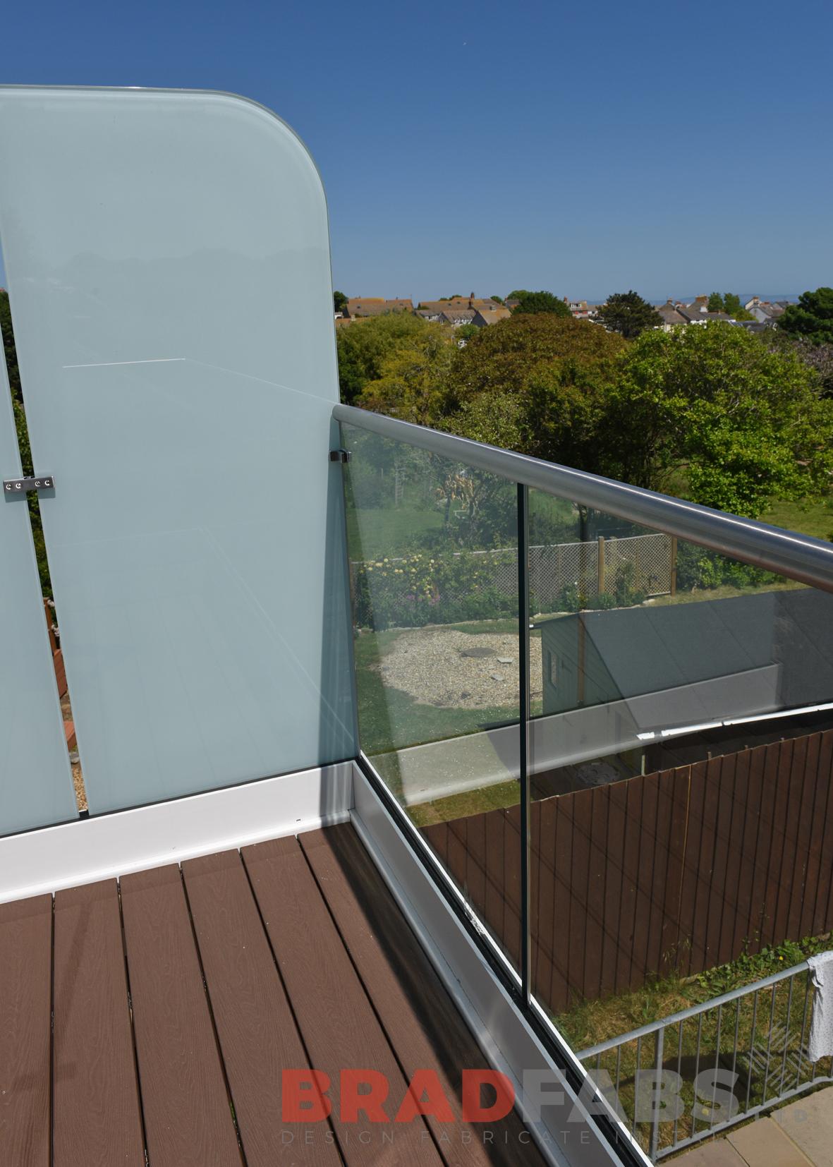 Bradfabs have supplied and installed a balcony with support legs running down the wall, 3 x 1.5 m all in mild steel, galvanised and powder coated complete with channel system infinity glass and tubular top rail with privacy glass to one side and composite decked flooring