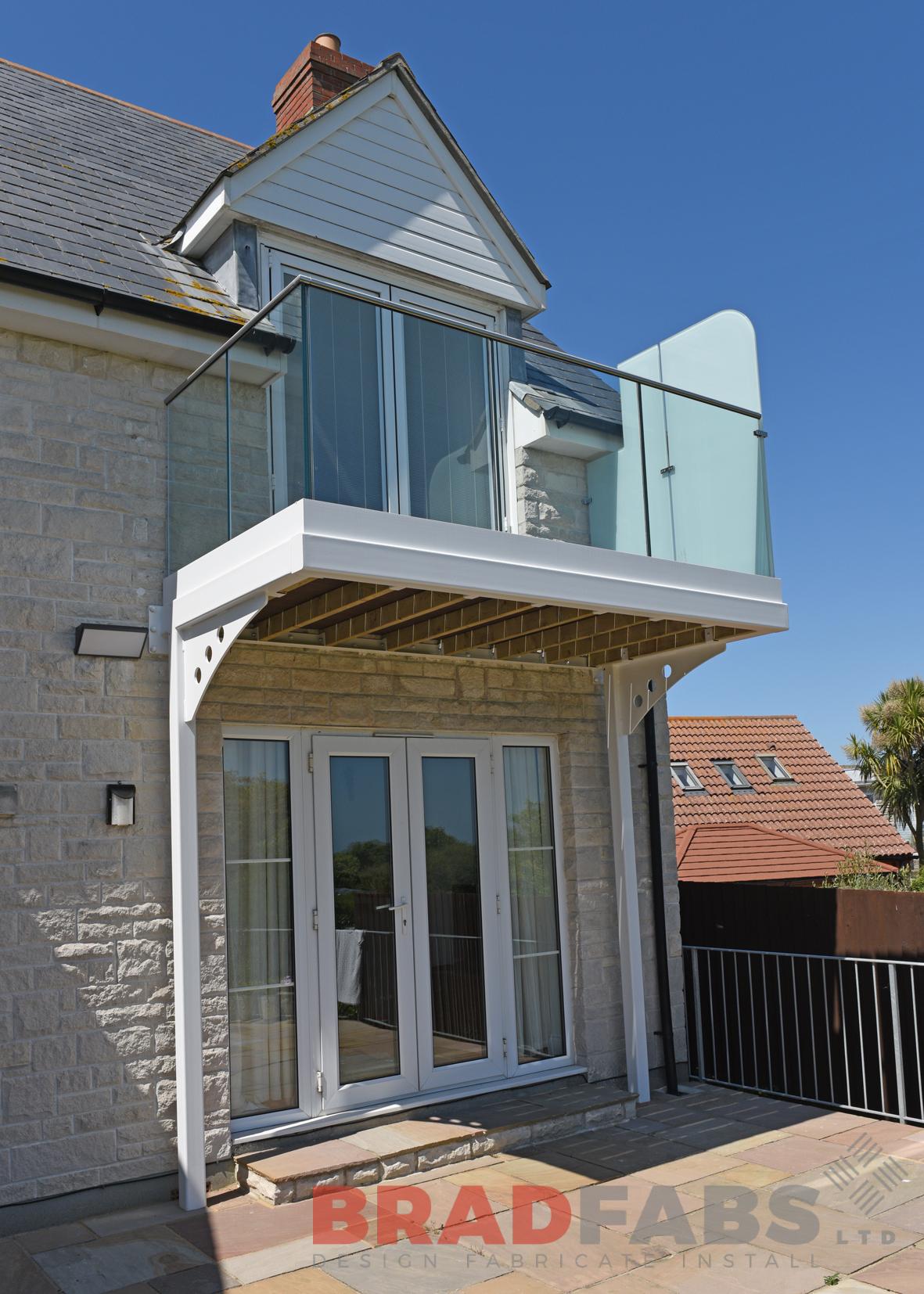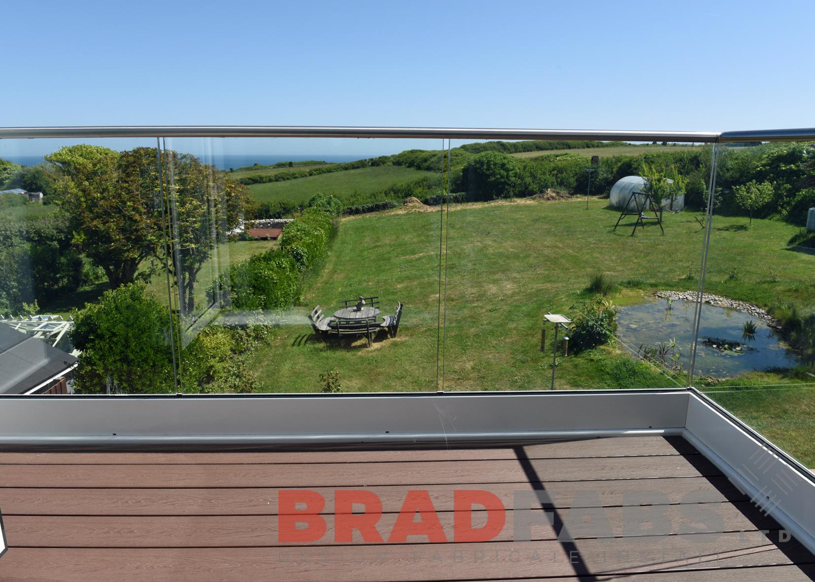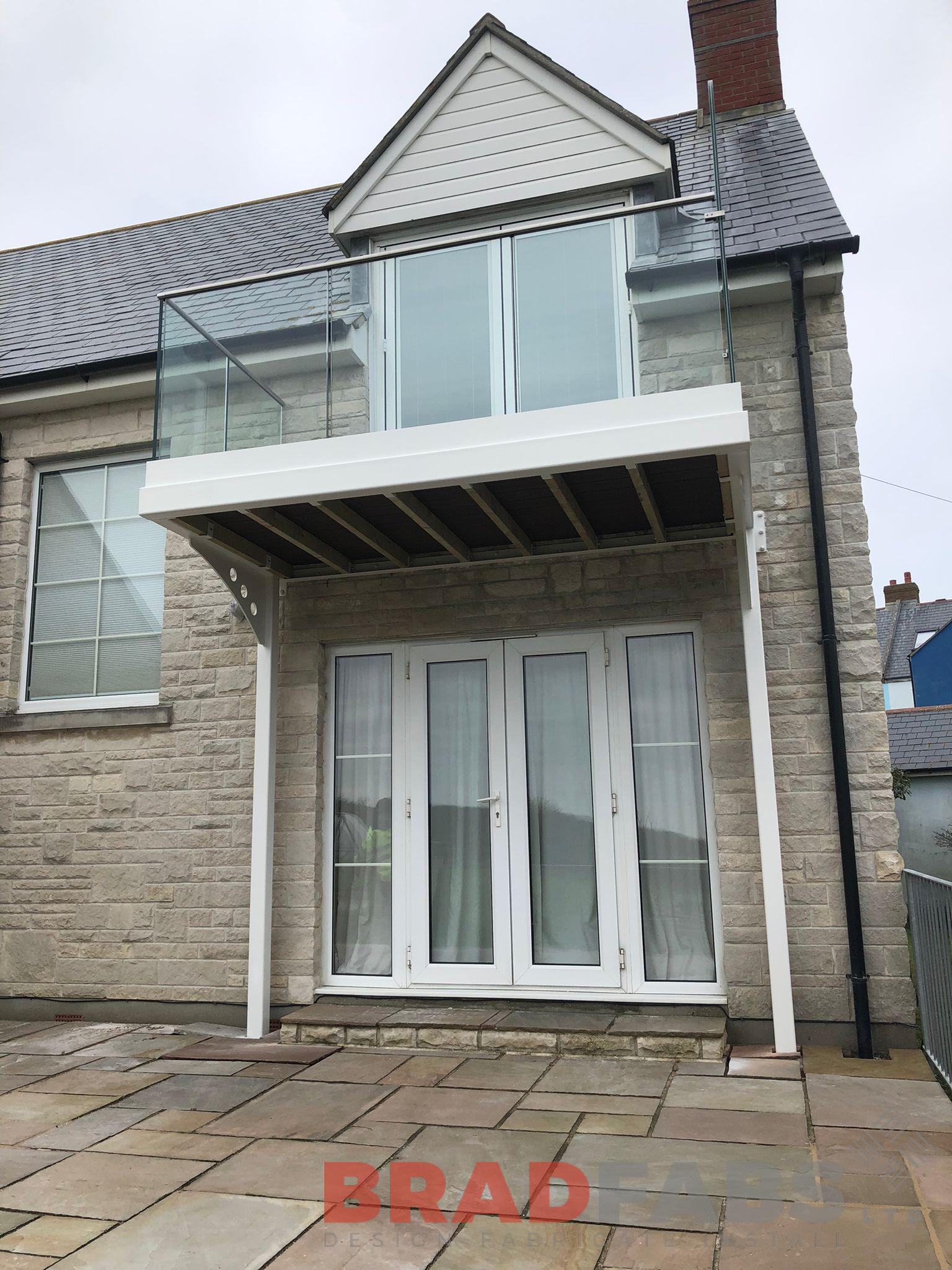 Bradfabs have supplied and installed a balcony with support legs running down the wall, 3 x 1.5 m all in mild steel, galvanised and powder coated complete with channel system infinity glass and tubular top rail with privacy glass to one side and composite decked flooring