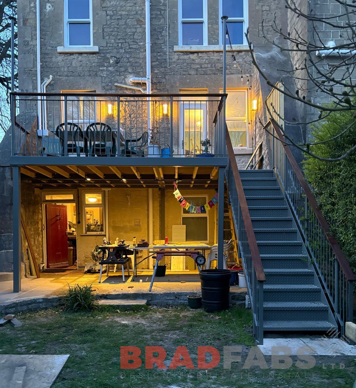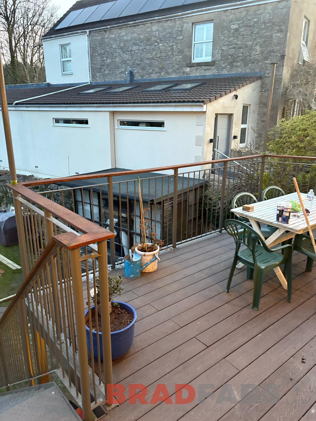 Balcony - Made from a sturdy box section frame with supporting steelwork, finished with composite decking for a clean, low-maintenance surface. Fitted with a vertical bar balustrade for a safe and modern look.