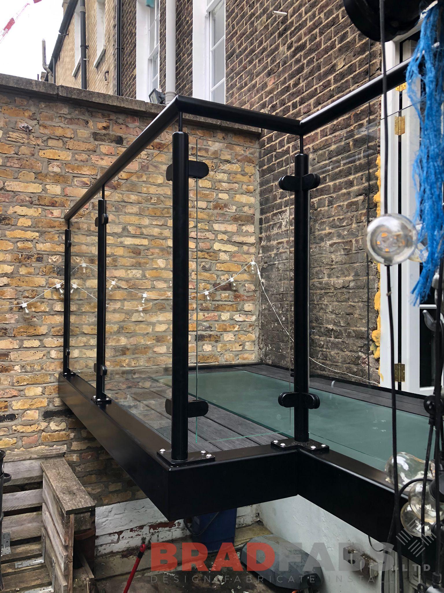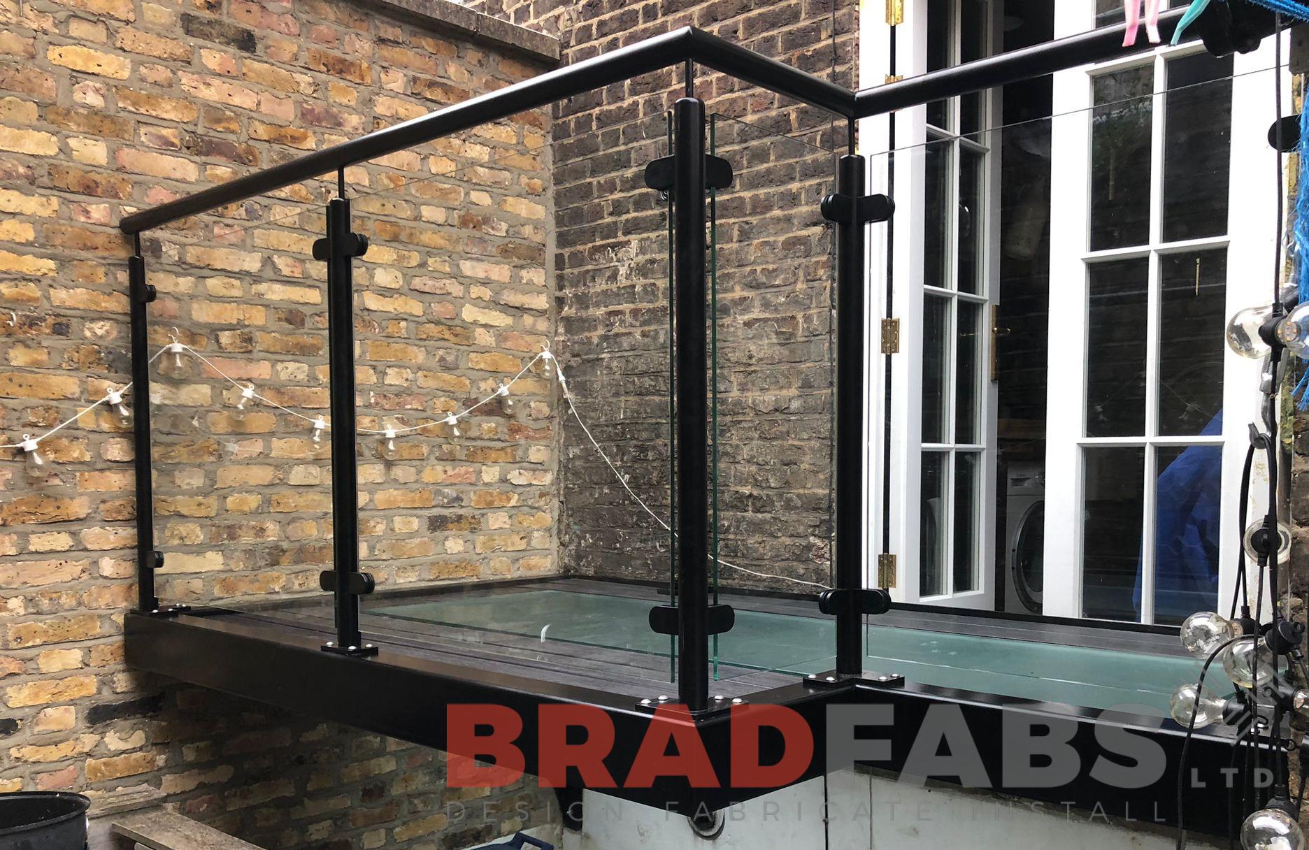 Balustrade - 48.3 dia balustrade in mild steel, galvanised and powder coated with 10mm toughened safety glass infill panels