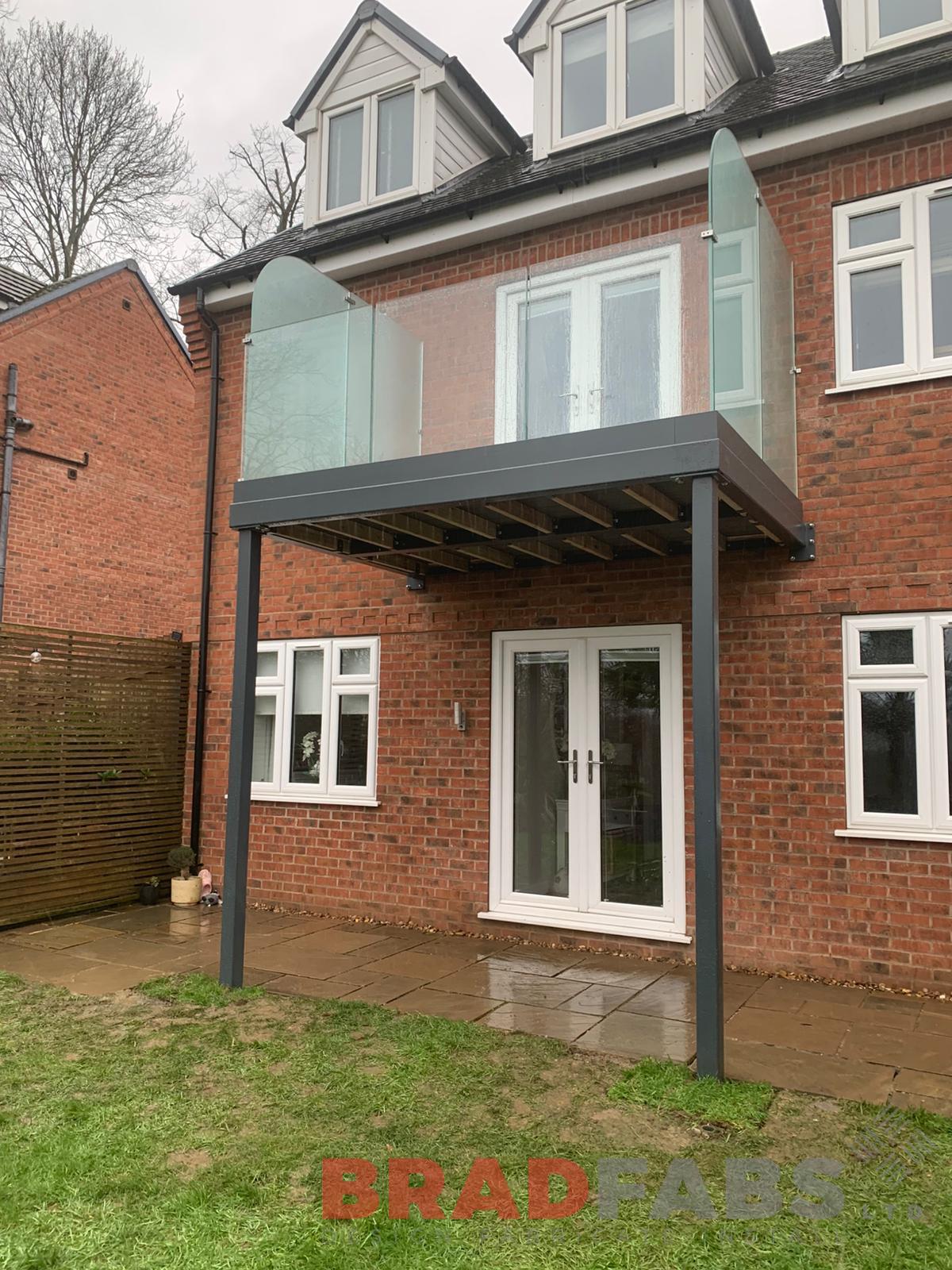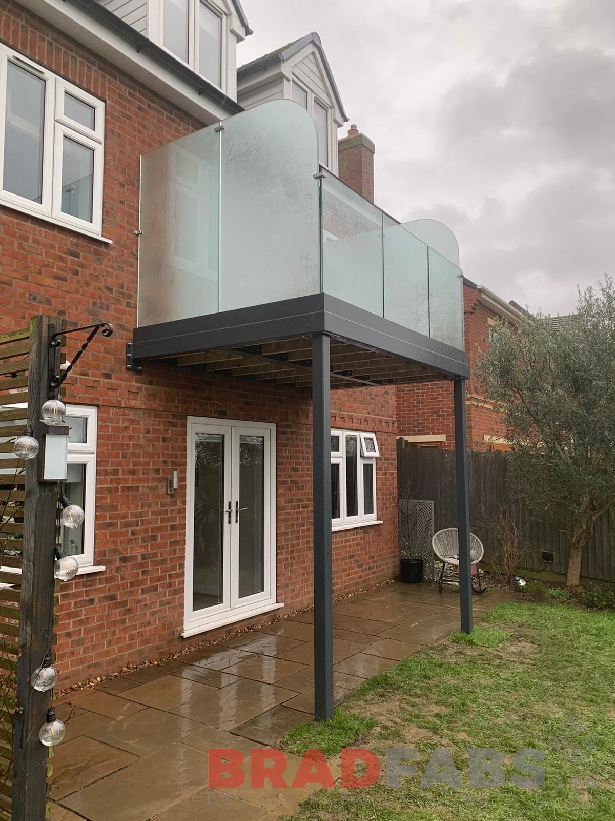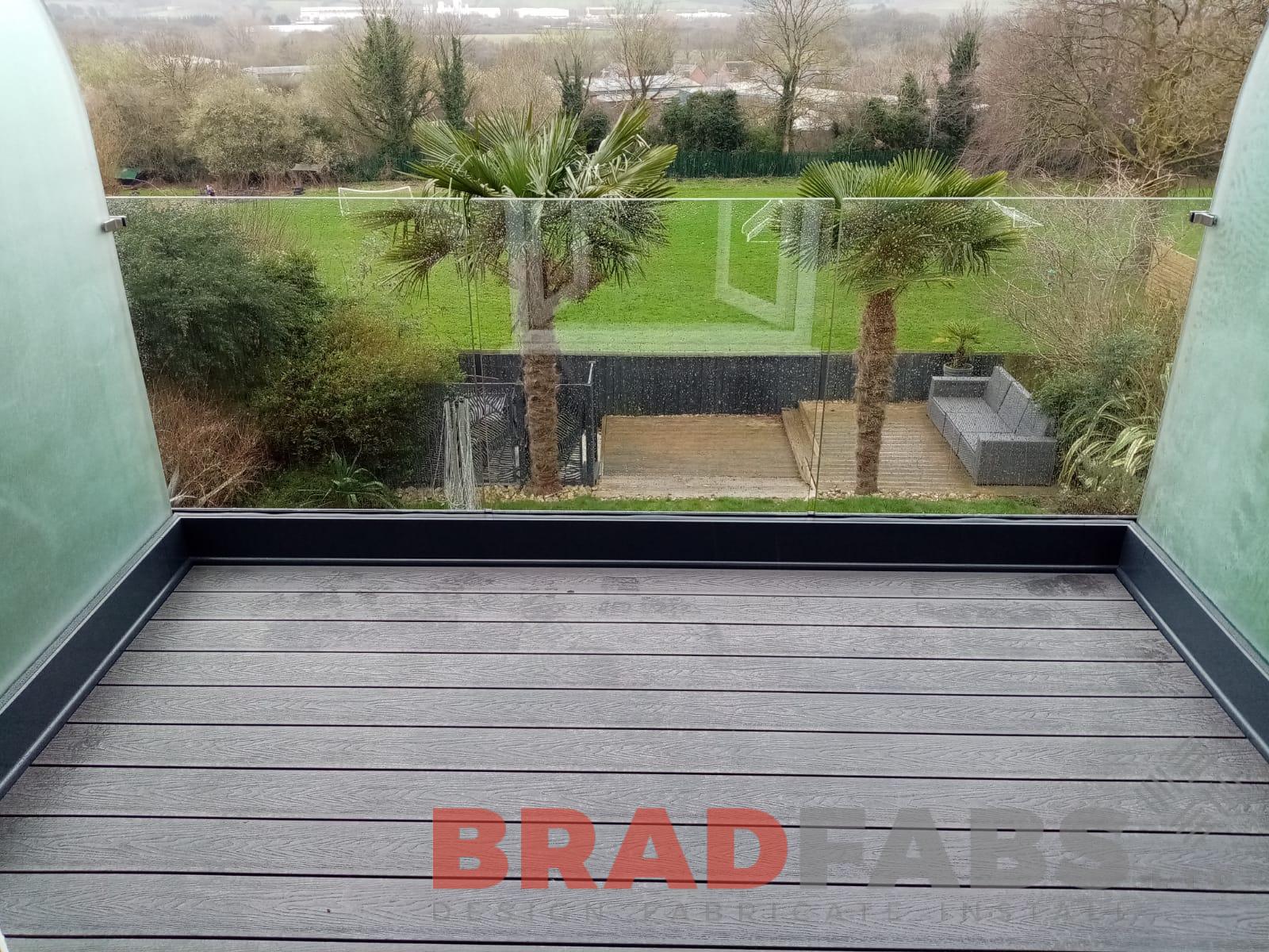 Supply and installation of a balcony at 3 x 2 m comprising of box section frame and support, composite decked floor with infinity glass balustrade (both sides have privacy glass at 1.8 high). All in a galvanised and powder coated finish