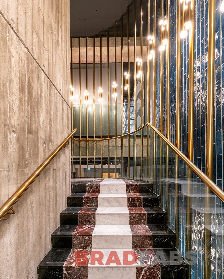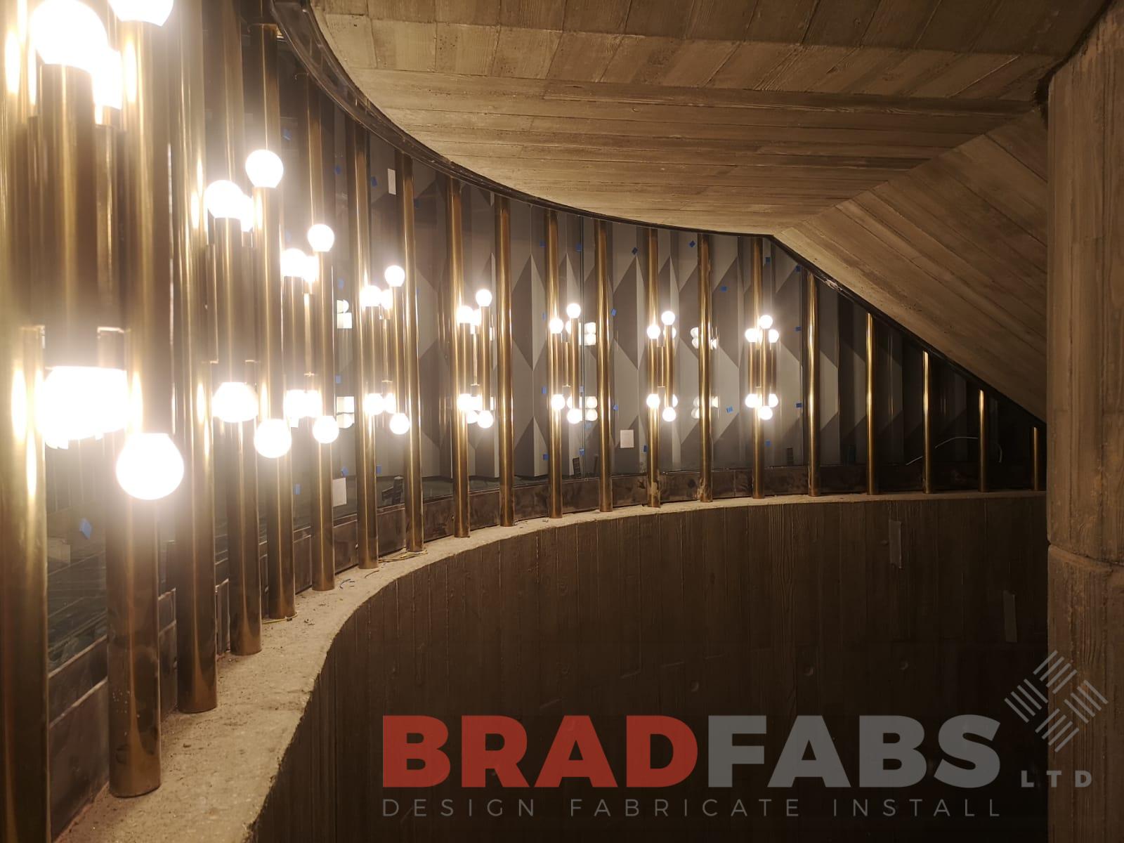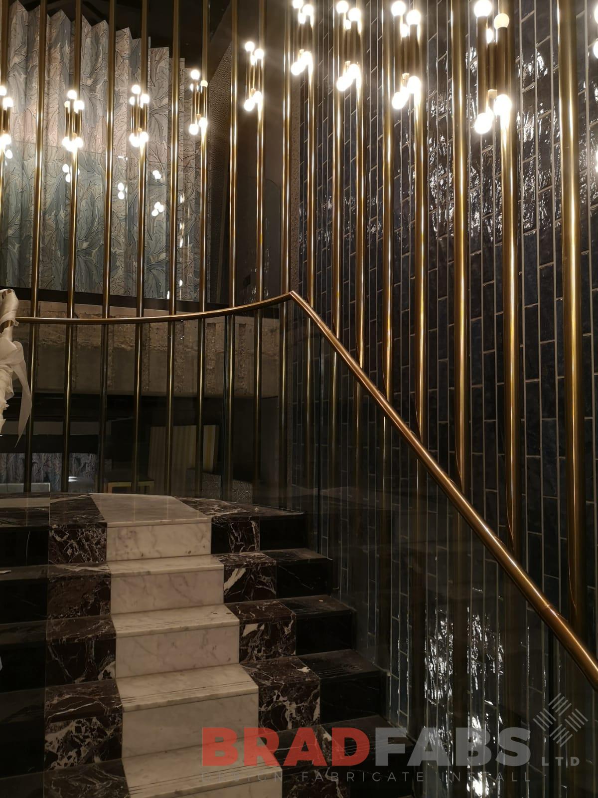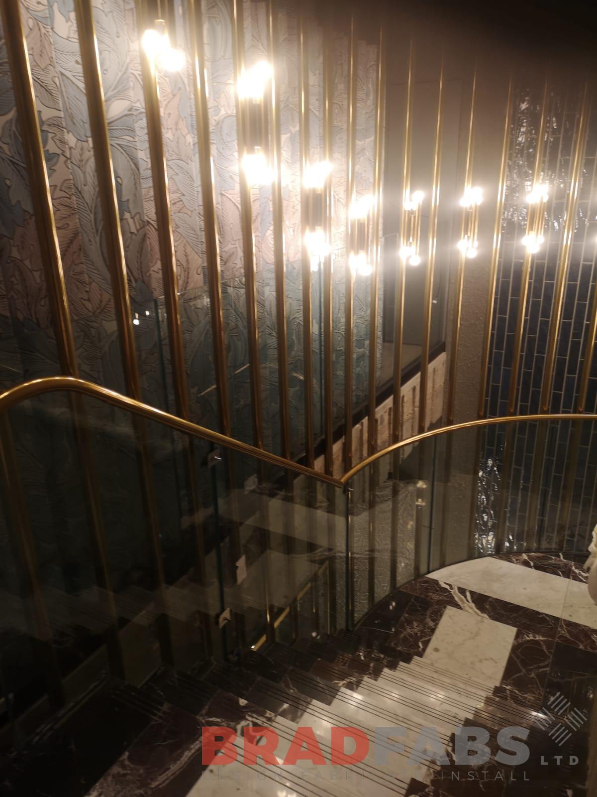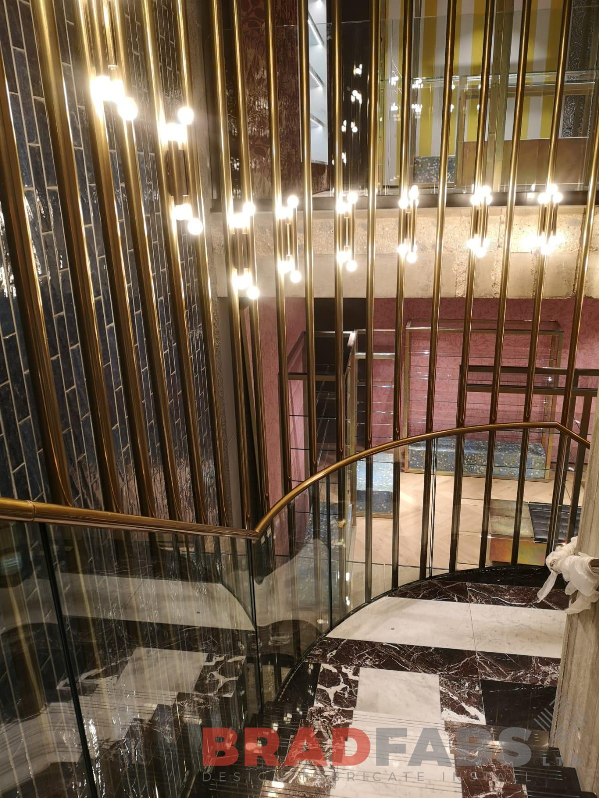 Italian design curved feature balustrade. Brass effect support poles with glass protection to the inside, for Flannels in London.