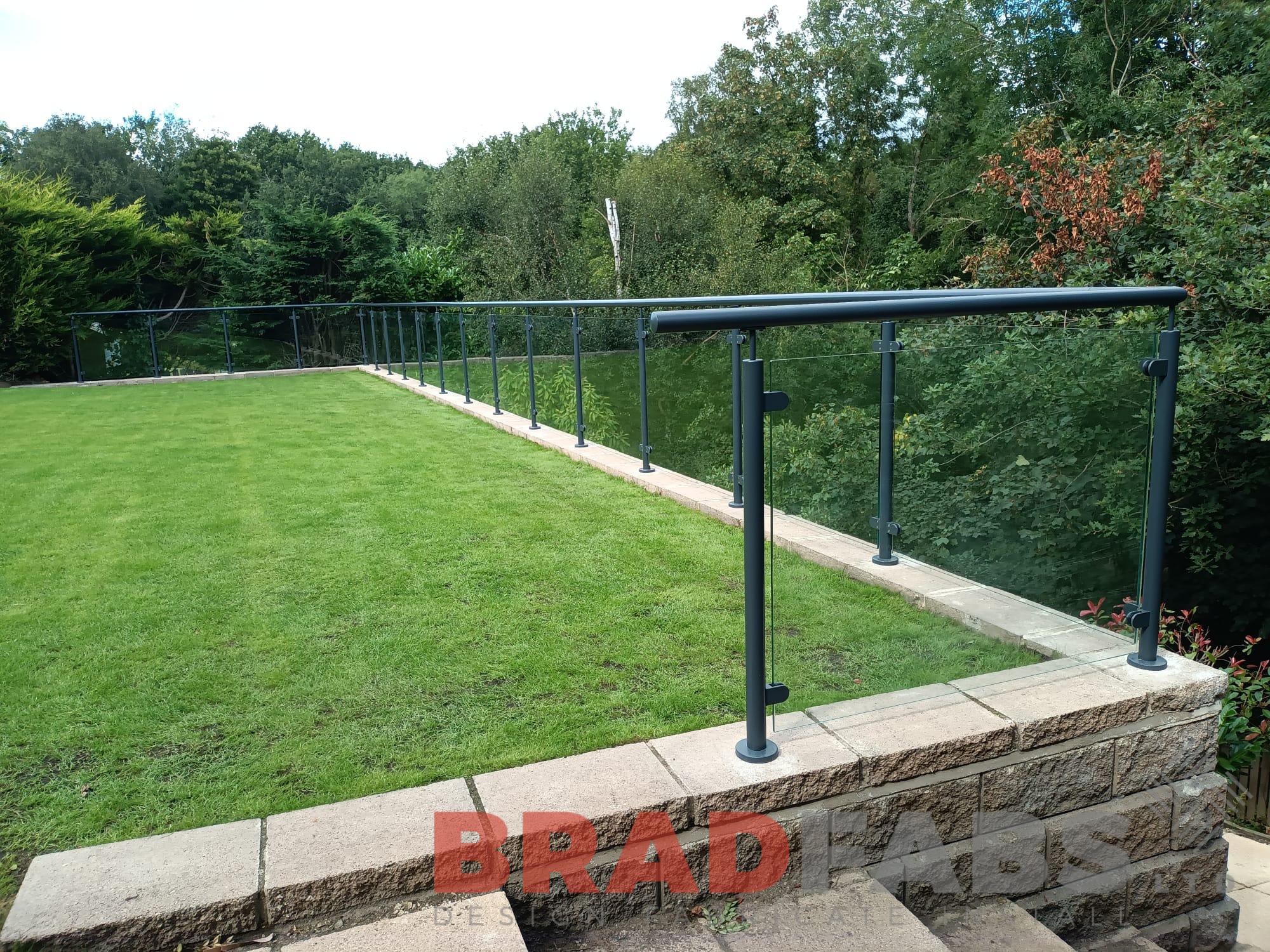 Bespoke domestic property balustrade, mild steel, galvanised and powder coated with glass infill panels