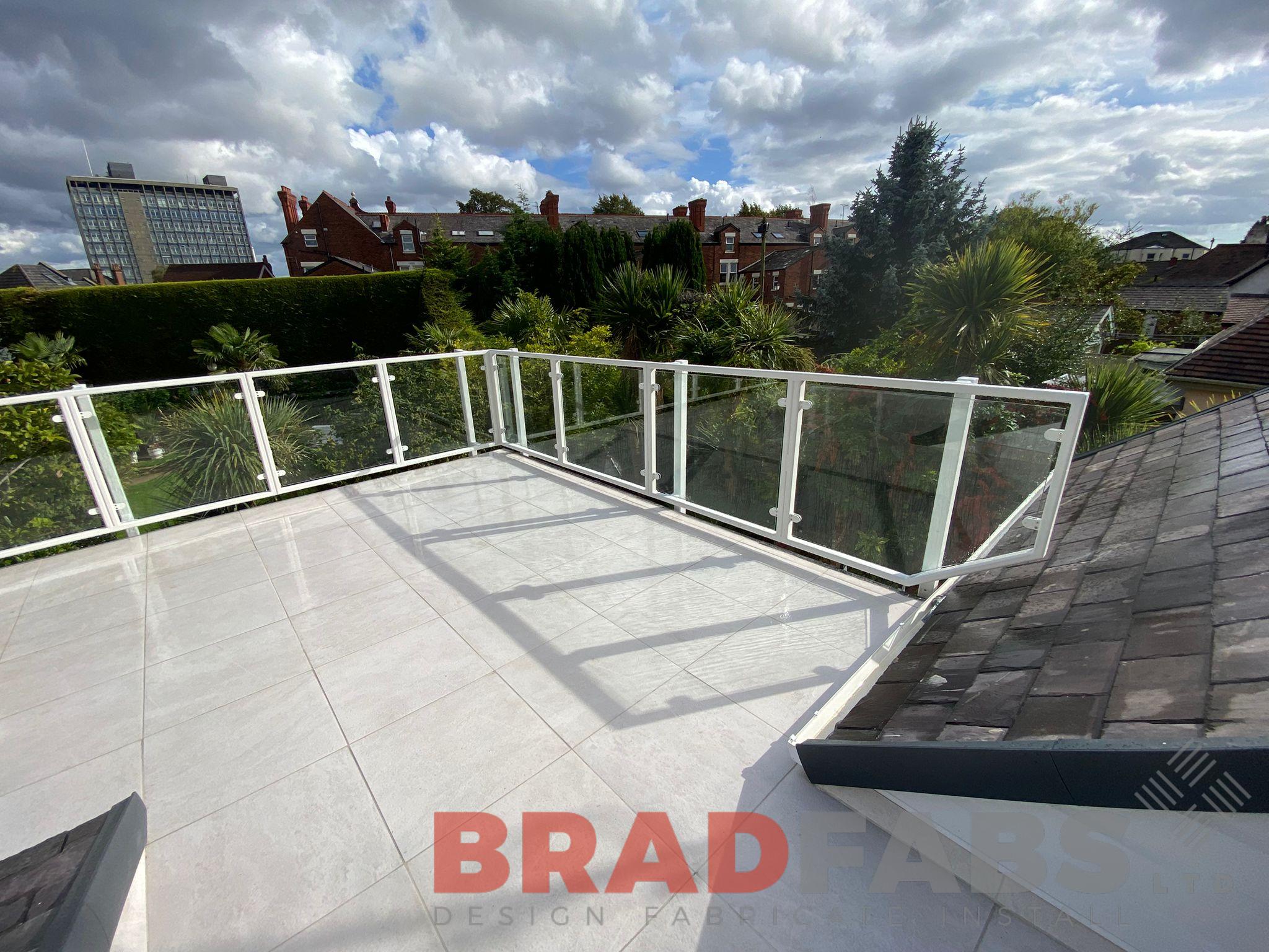 Supply and installation of mild steel, powder coated balustrade comprising of, 70 x 70 x 5 mm ox section stanchions, 50 x 30 box section inset frame complete with glass clamps and 10 mm clear toughened safety glass panels. All supplied in powder coated finish