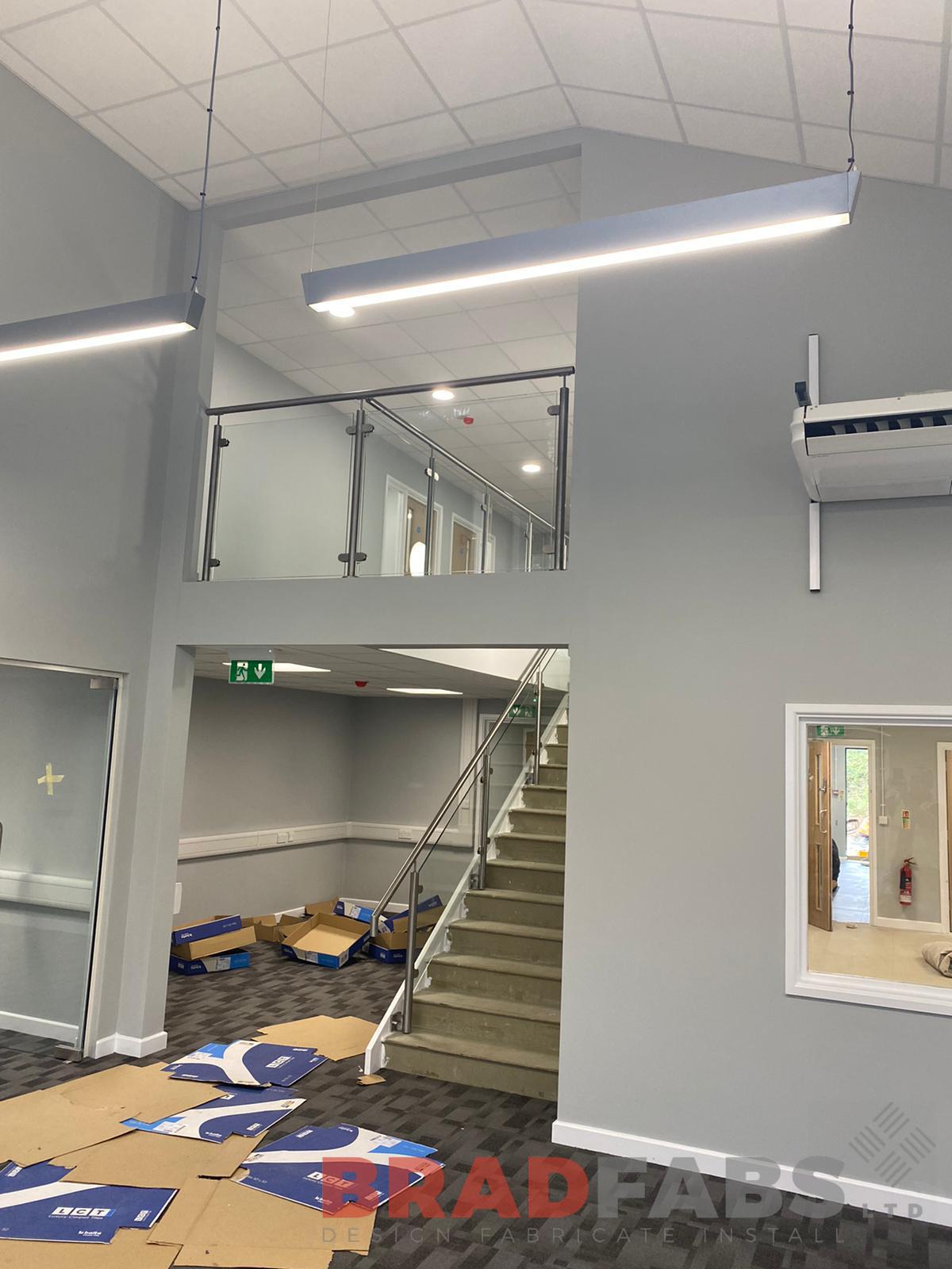 Stainless steel and glass balustrade for the staircase and landing of this office building, giving it a smart and attractive finish