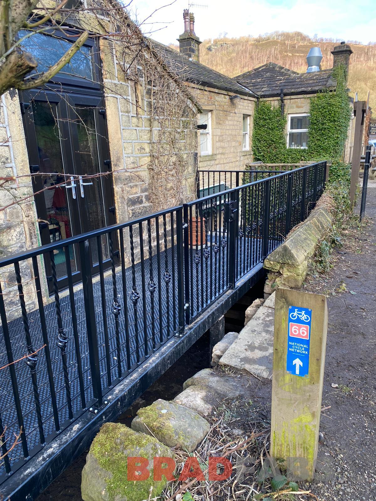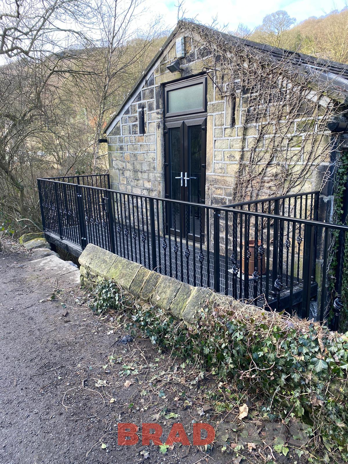 Mild steel, galvanised and powder coated decorative vertical bar balustrade installed around decking area and along property edge by Bradfabs