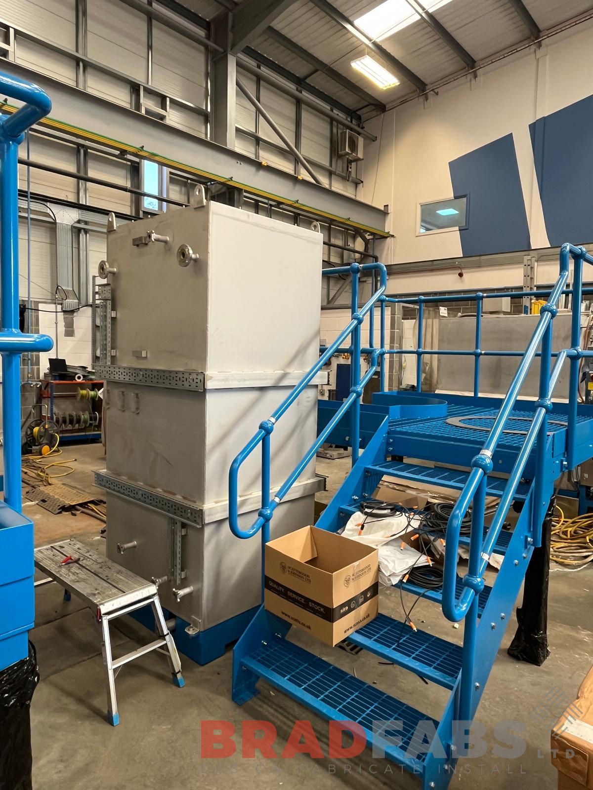We manufactured this stainless steel chemical tank with platform for an engineering company