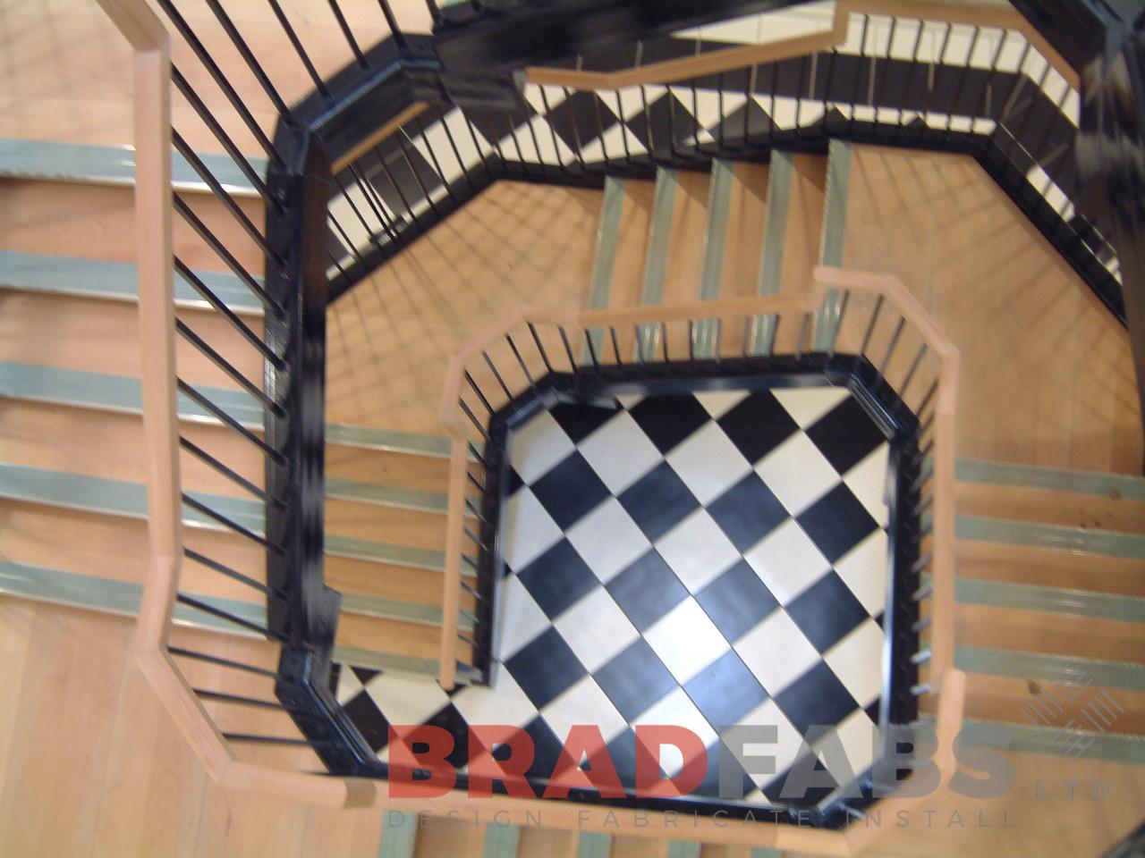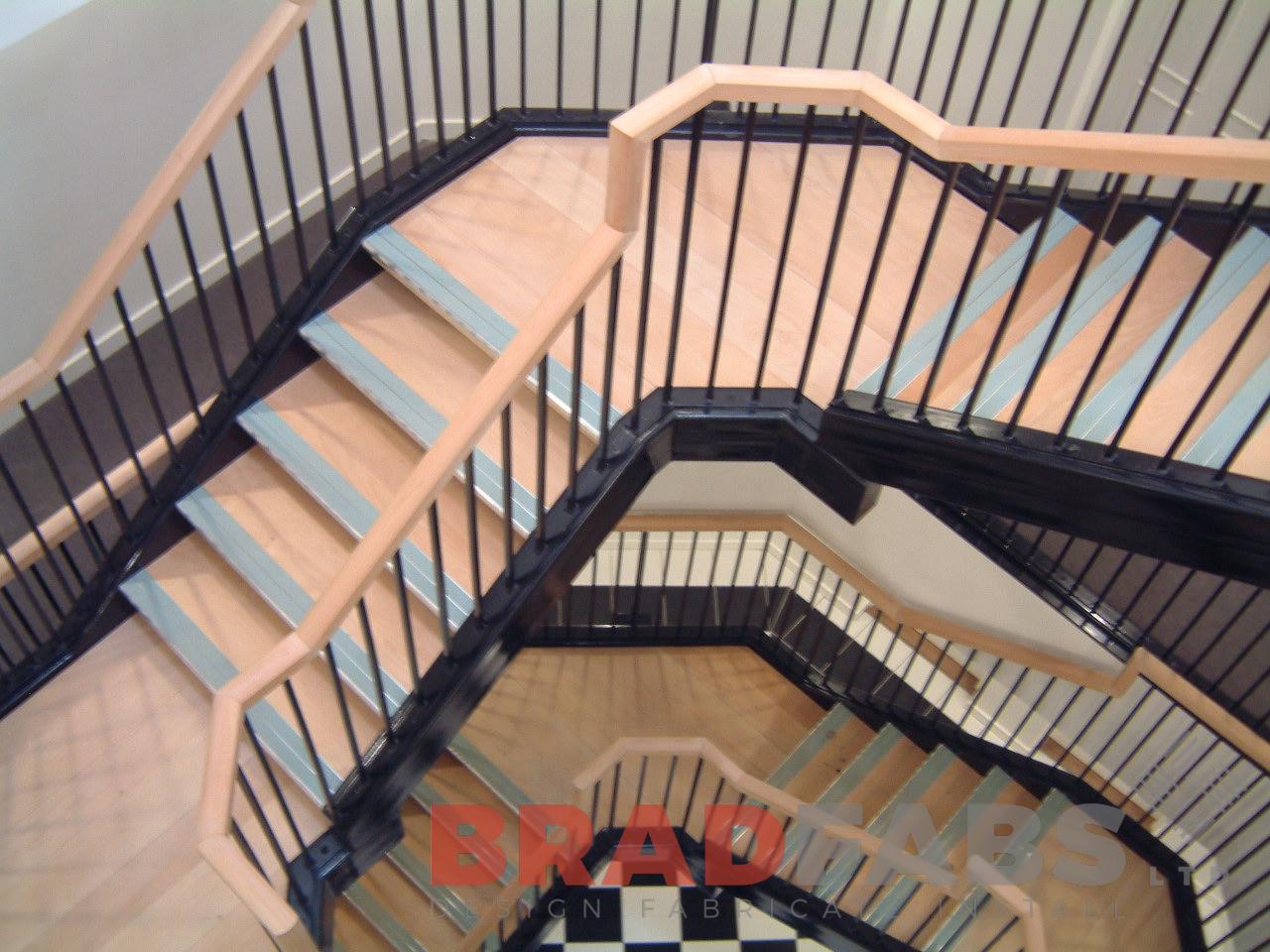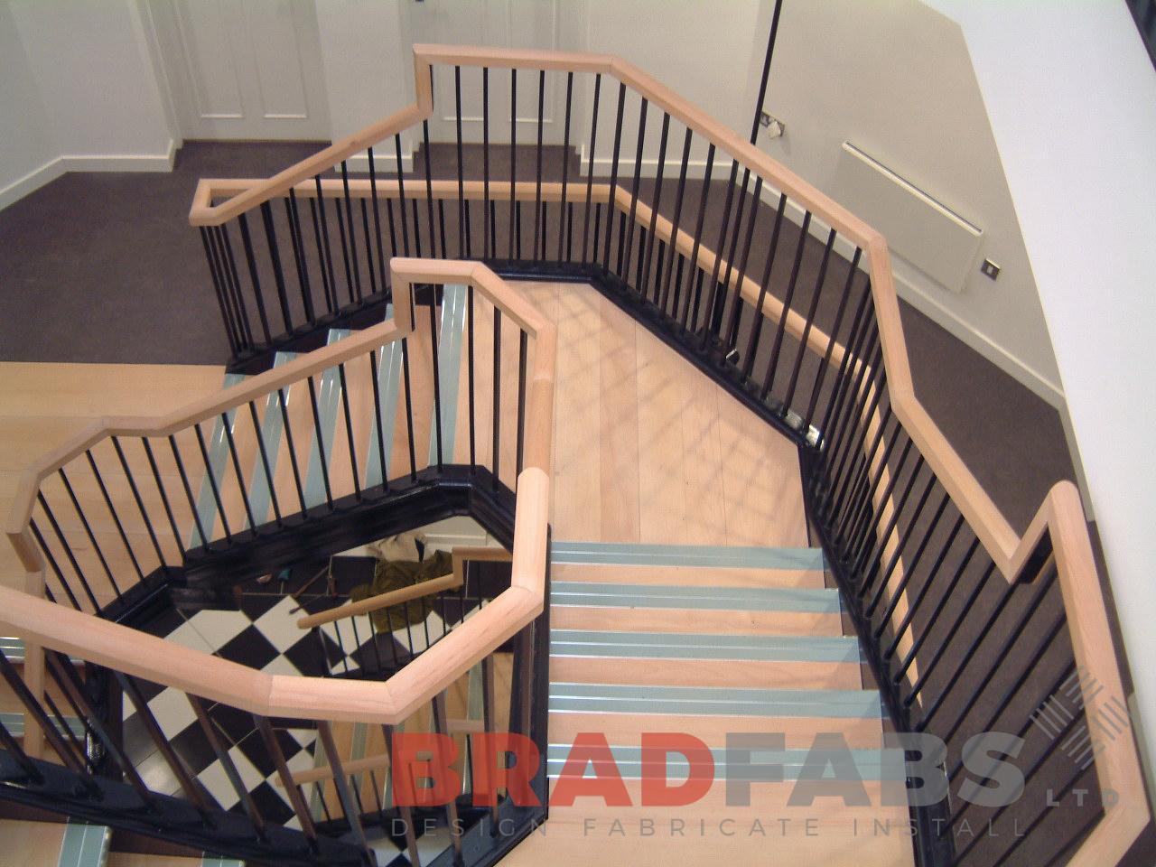 This bespoke staircase has timber handrails and is fabricated in mild steel and painted black featuring vertical balustrading. We design and install bespoke staircases in the UK, send us your requirements for a cost on your next project.