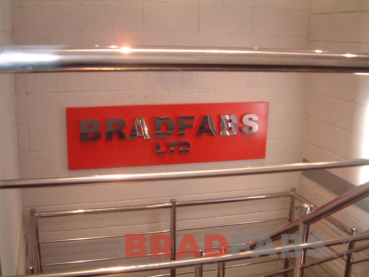 This stainless steel staircase features one landing, fabricated out of mild steel with mirror polished stainless steel balustrading, stair stringers and staircase step treads installed at Bradfabs offices in Bradford, West Yorkshire.