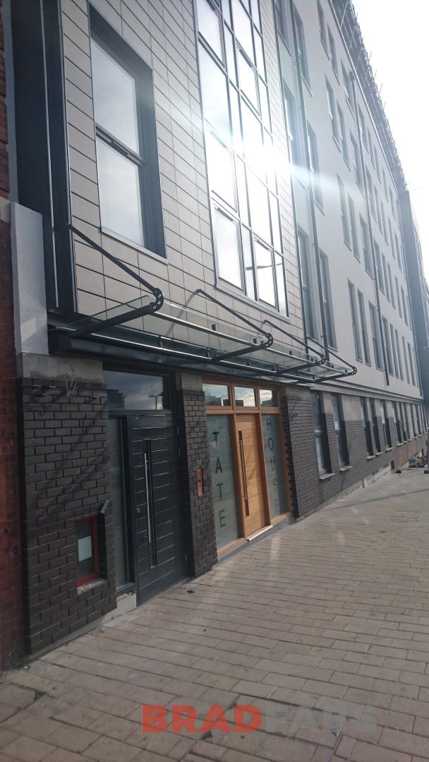 7215 x 1150 canopy framework manufactured in mild steel, galvanised and powder coated with solid bar tie backs fixings to support steelwork by others, with toughened safety glass.