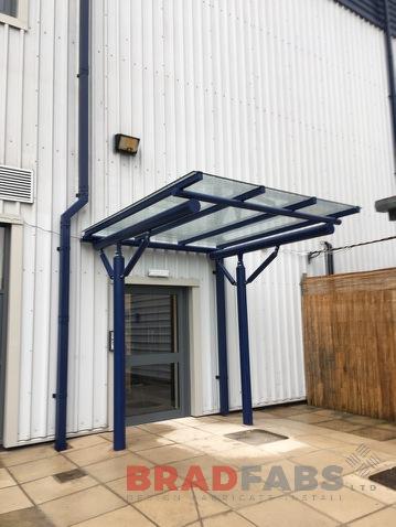 This canopy was for a repeat customer who commission us to design, manufacture and install a mild steel, galvanised and powder coated blue canopy frame with 12 mm heat soaked toughened glass.