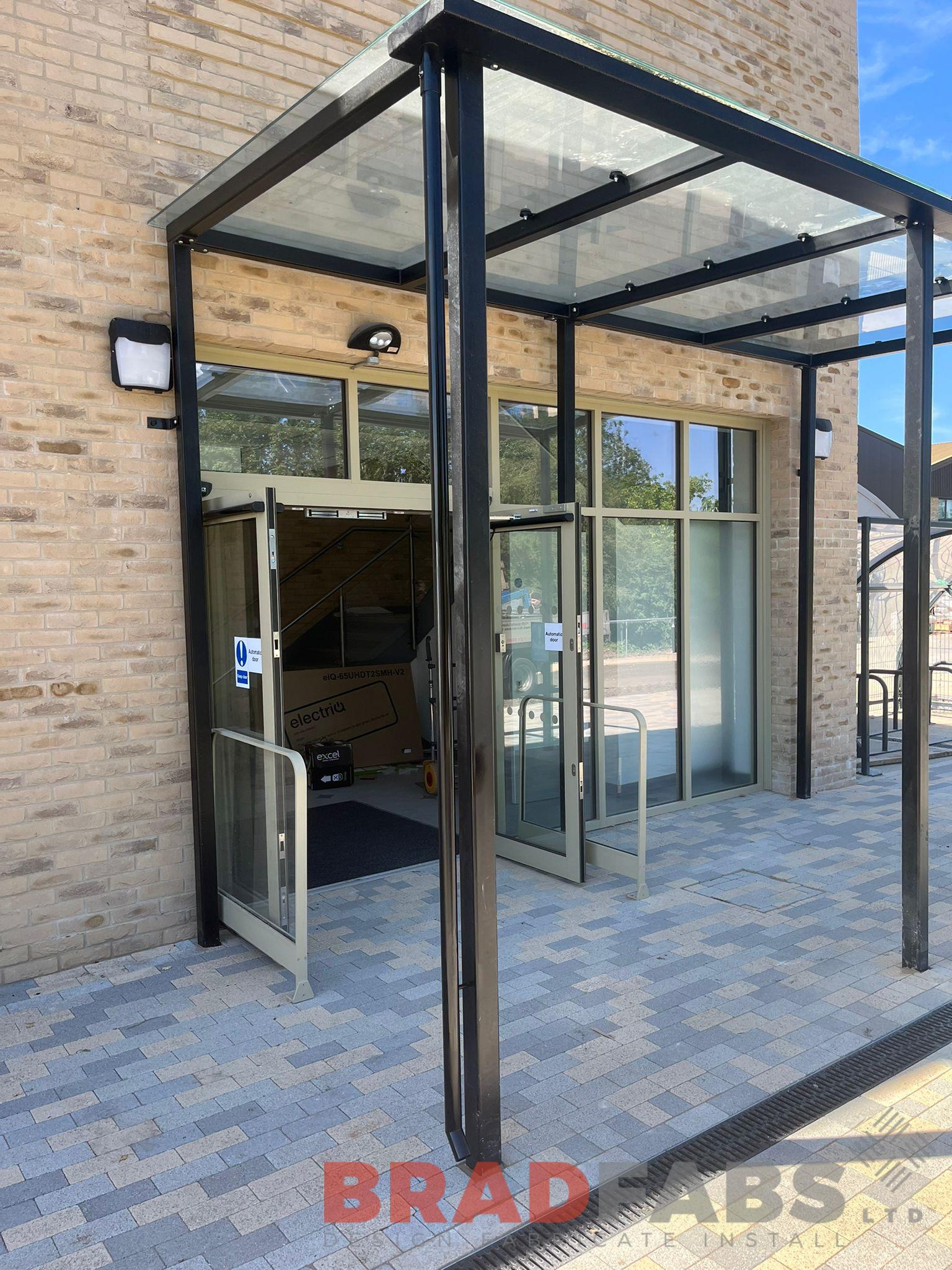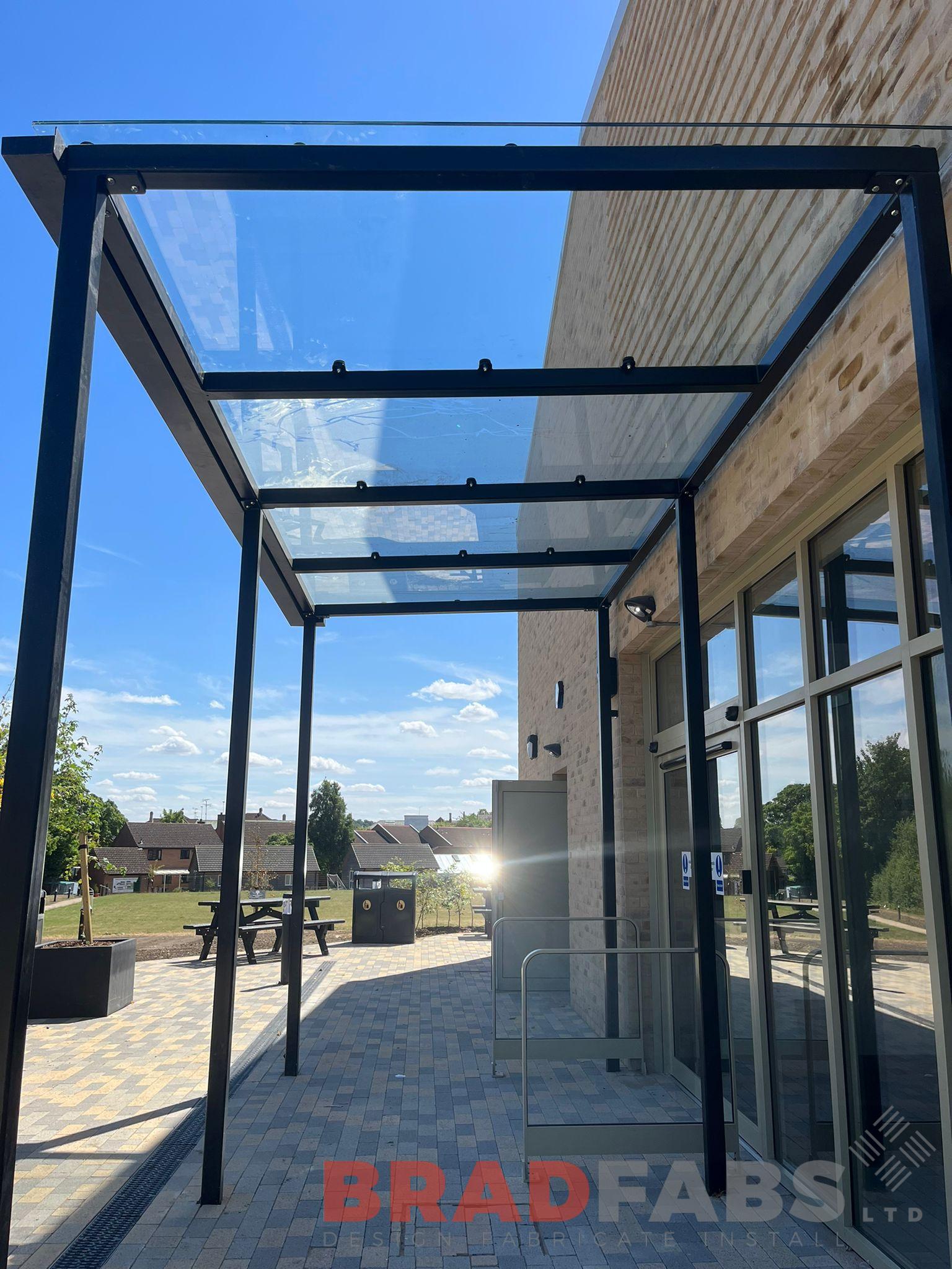 Bespoke steel canopy with straight clear toughened laminated glass roof