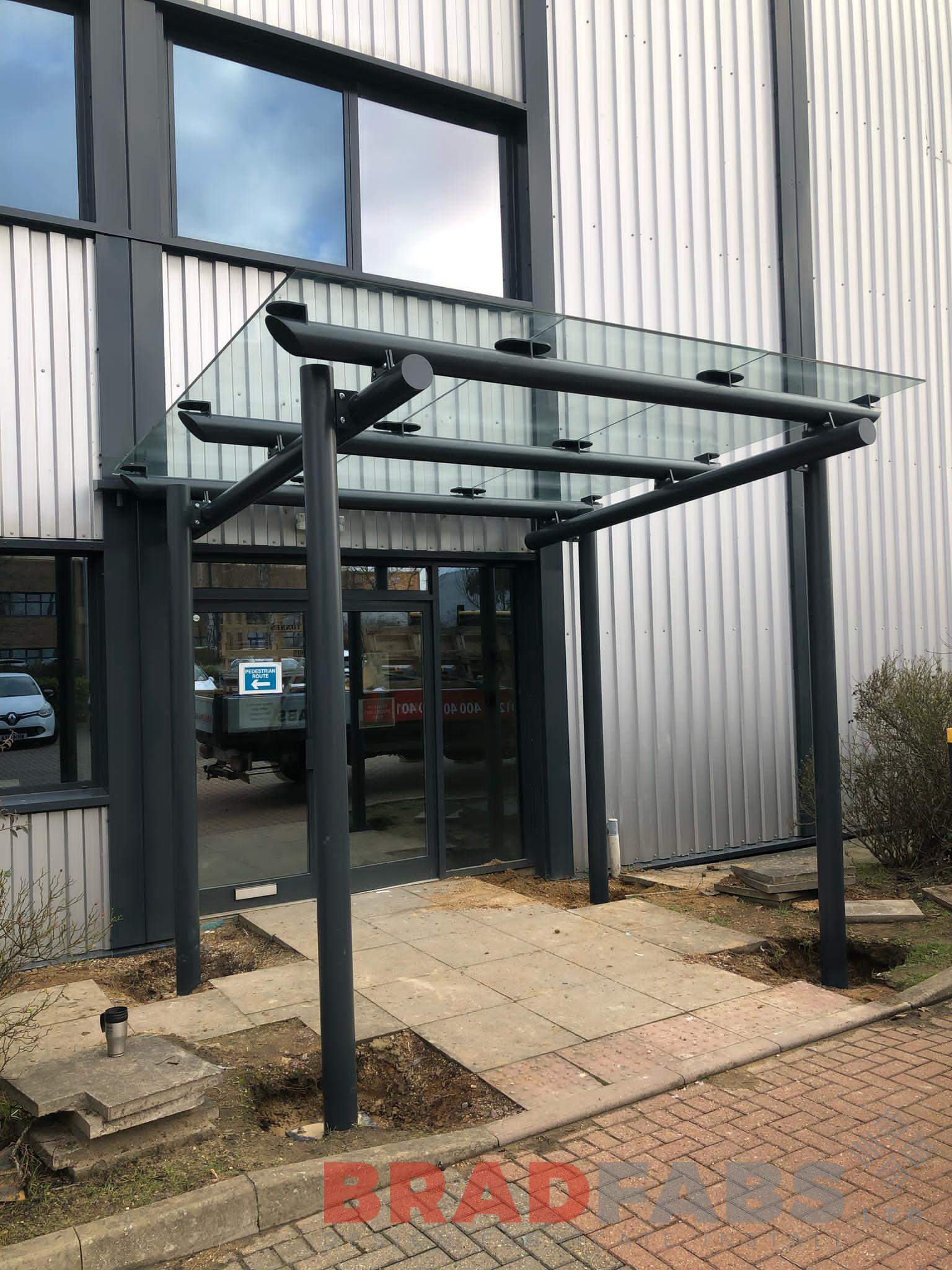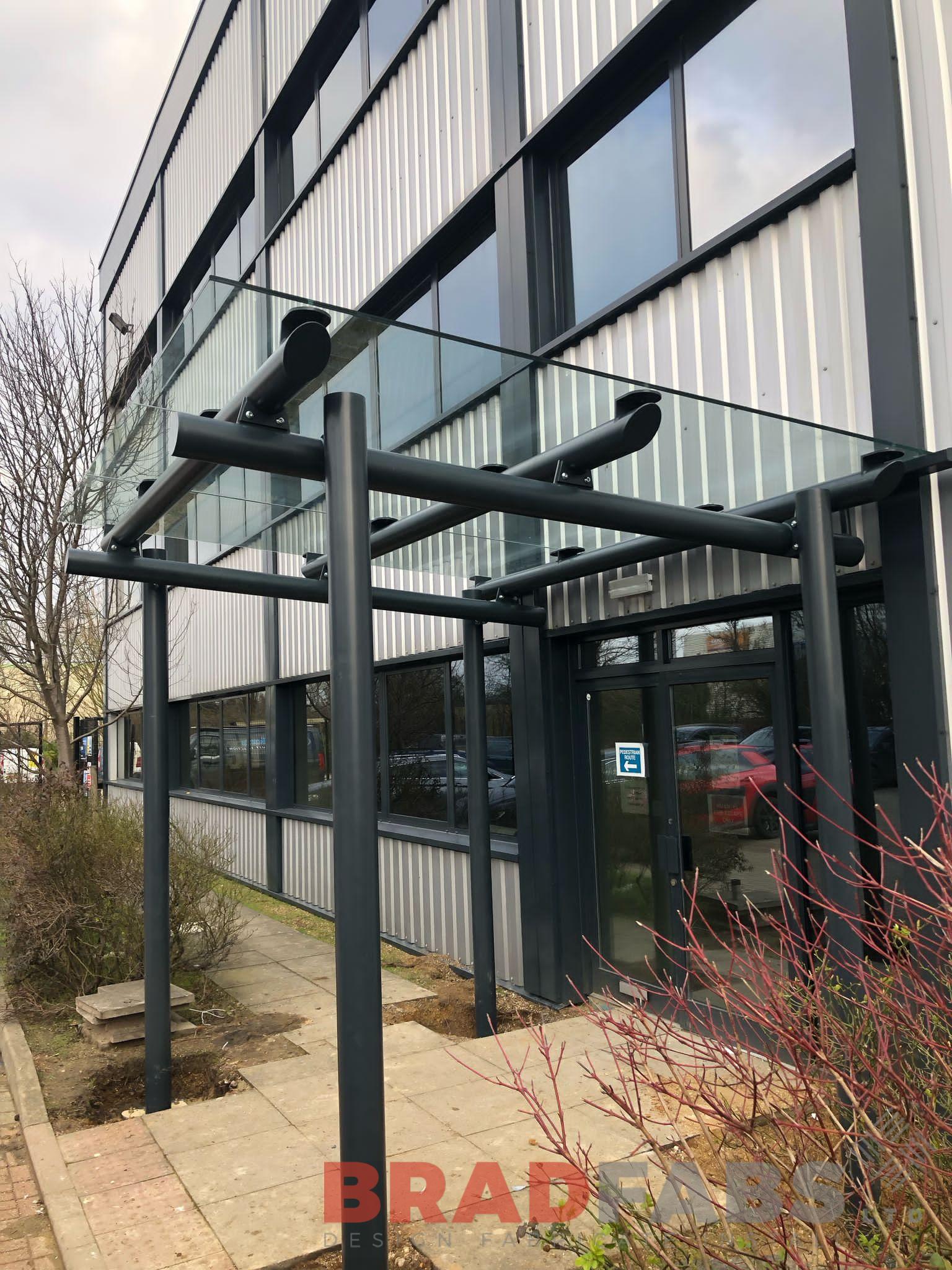This canopy was designed free standing 3 m by 3 m, in mild steel and powder coated with glass