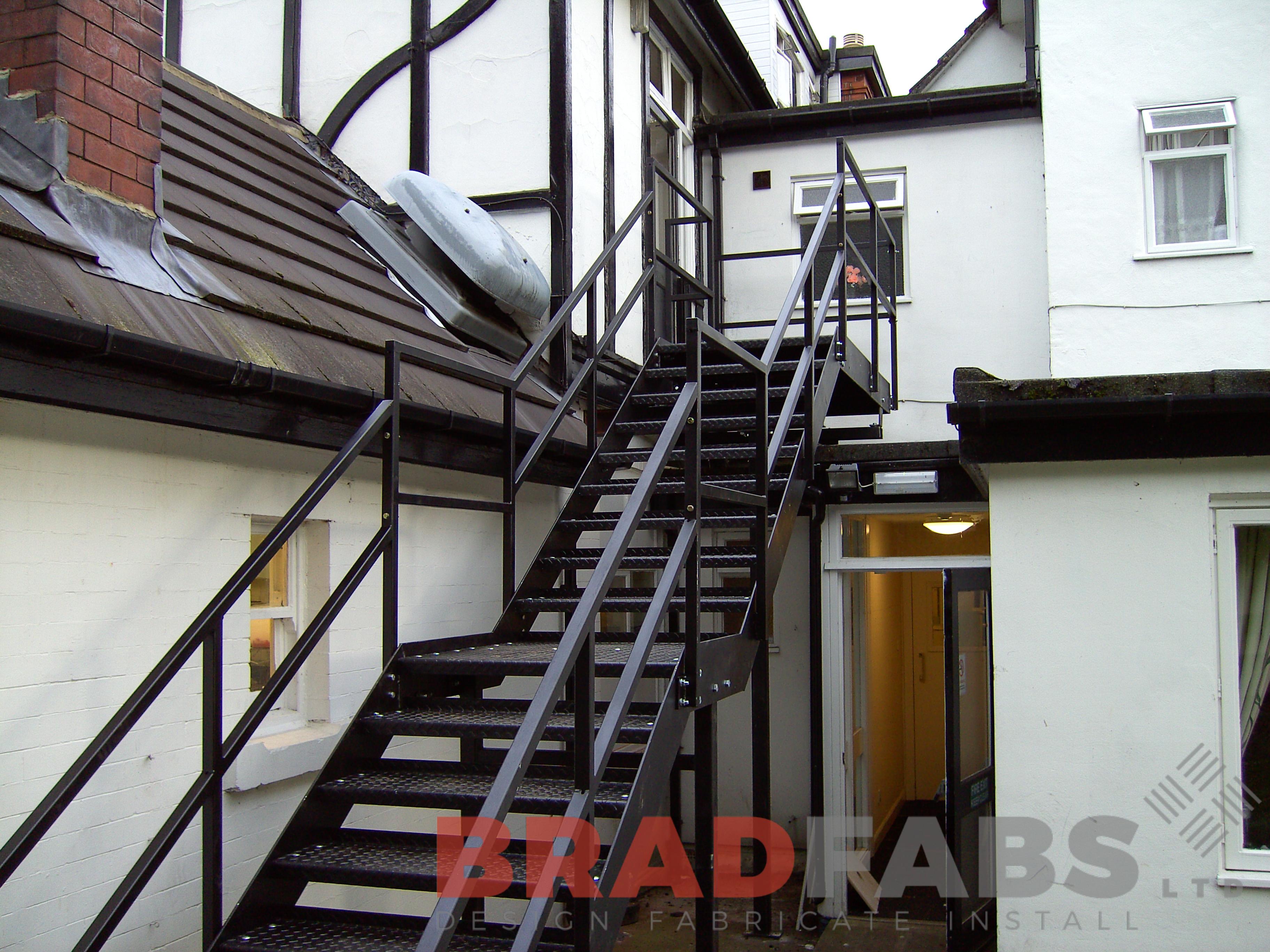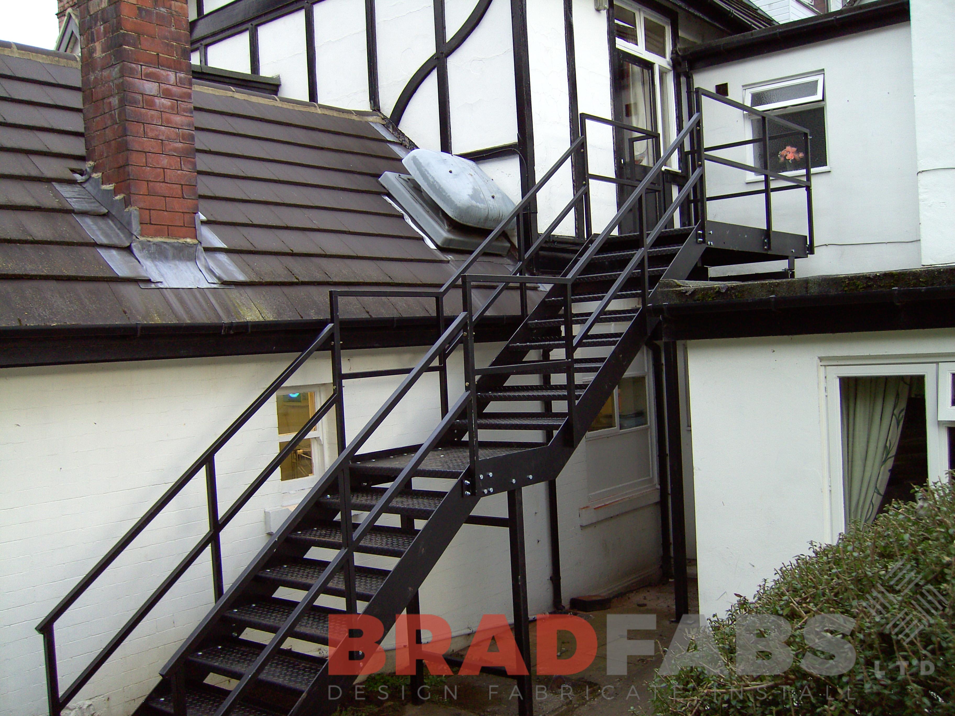 This straight mild steel fire escape features a top and middle landing with non-slip stair treads and double sided hand rails. This example is installed at a residential care home in West Yorkshire.