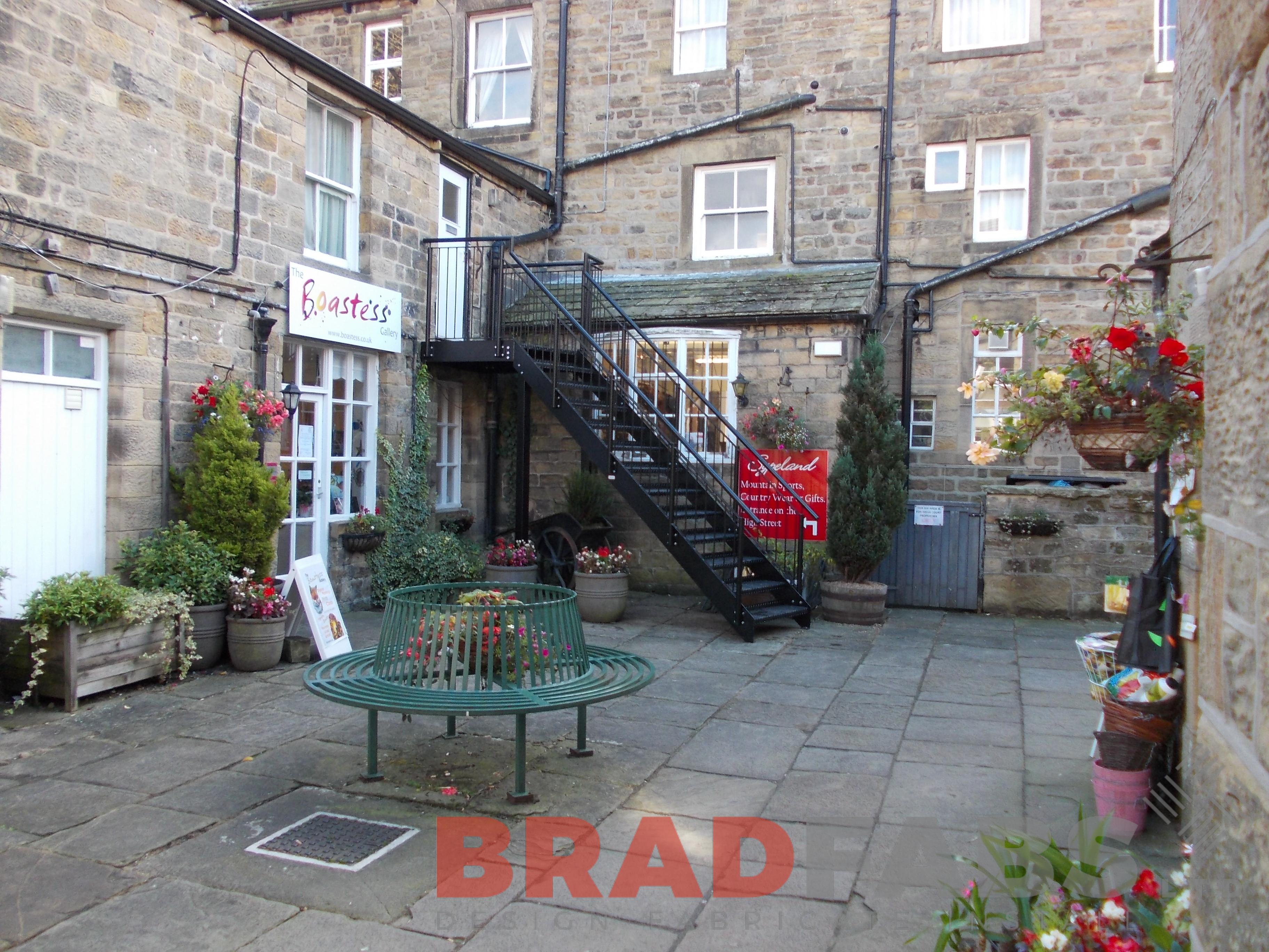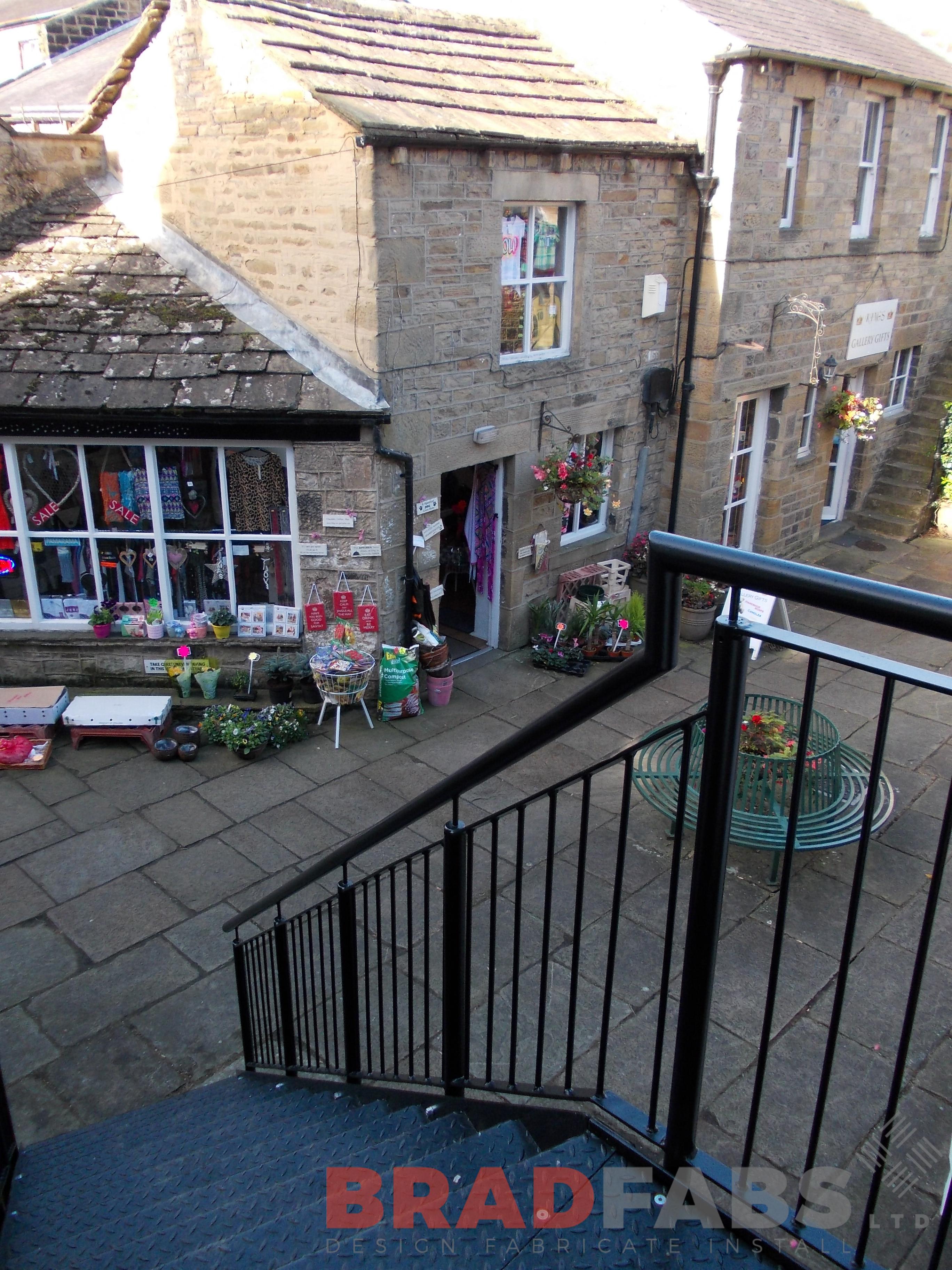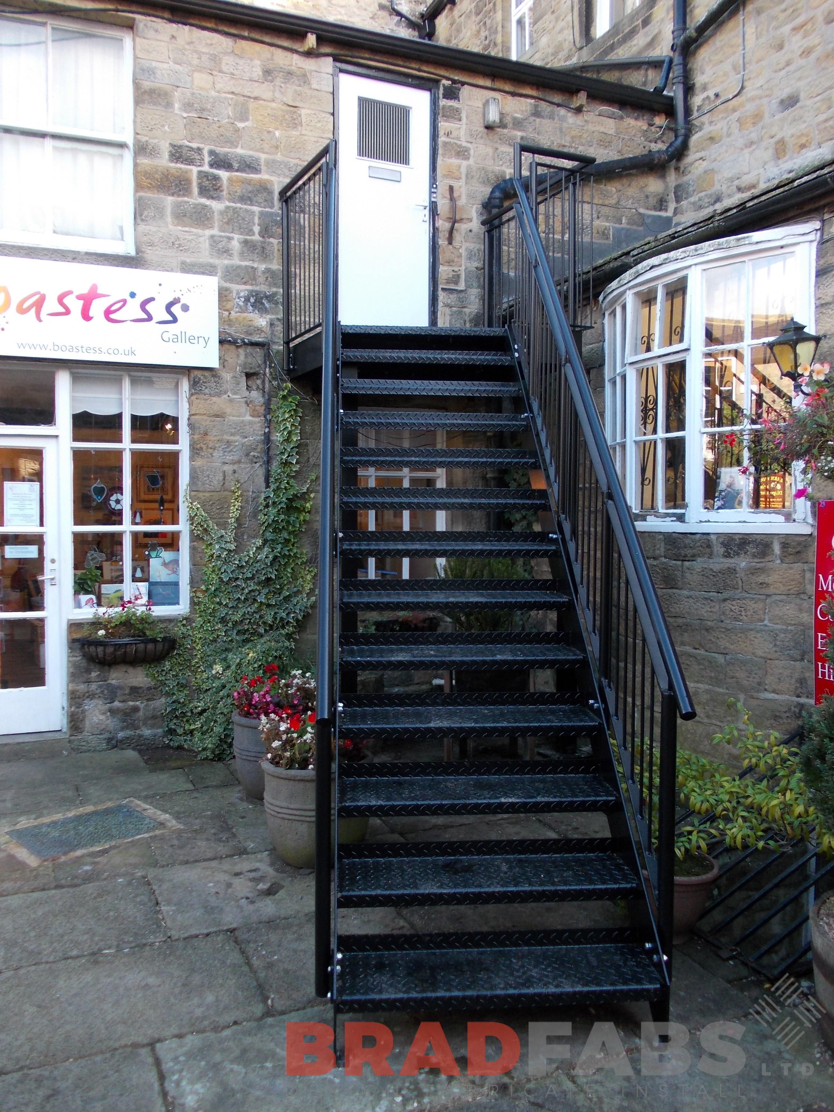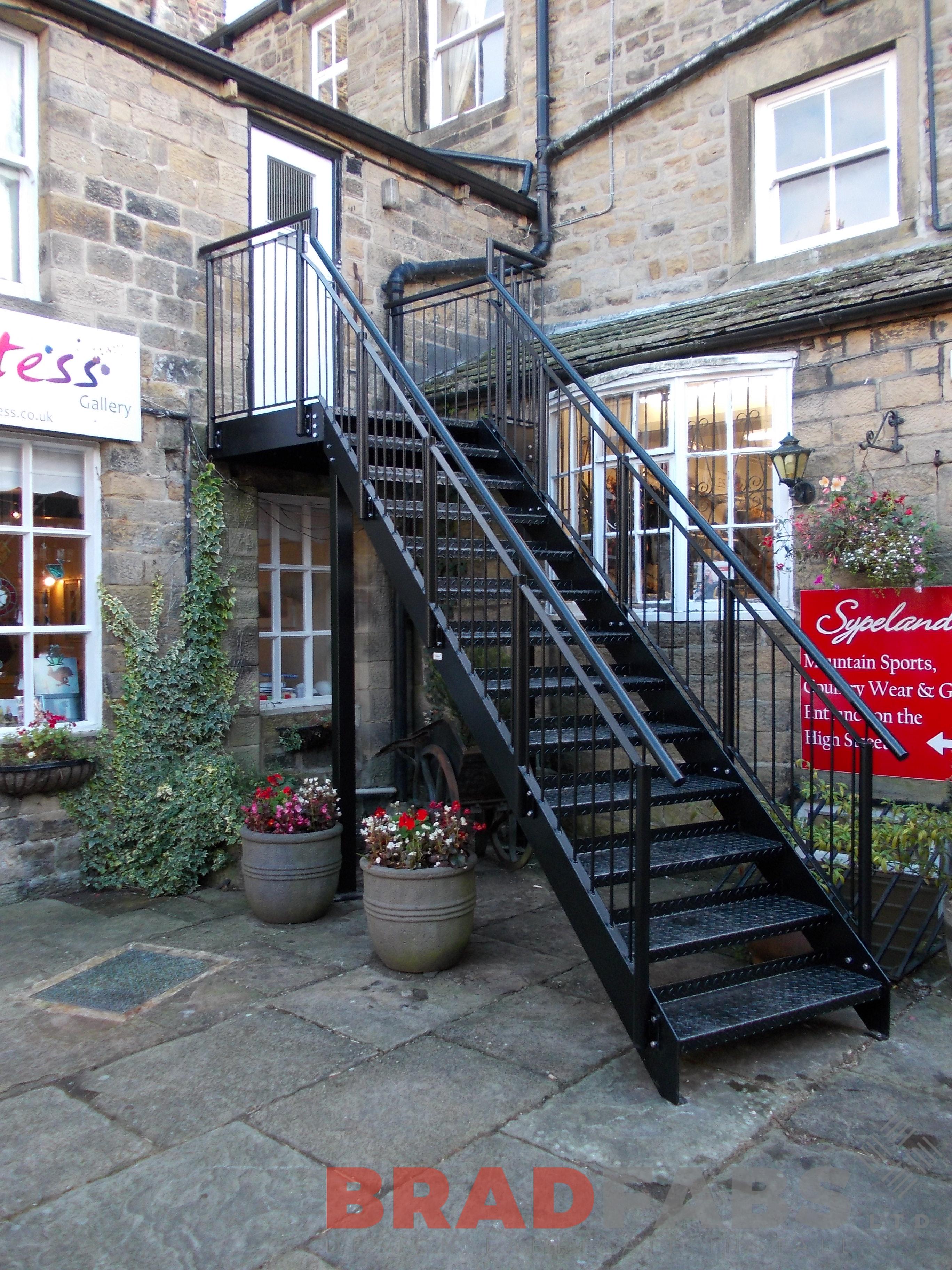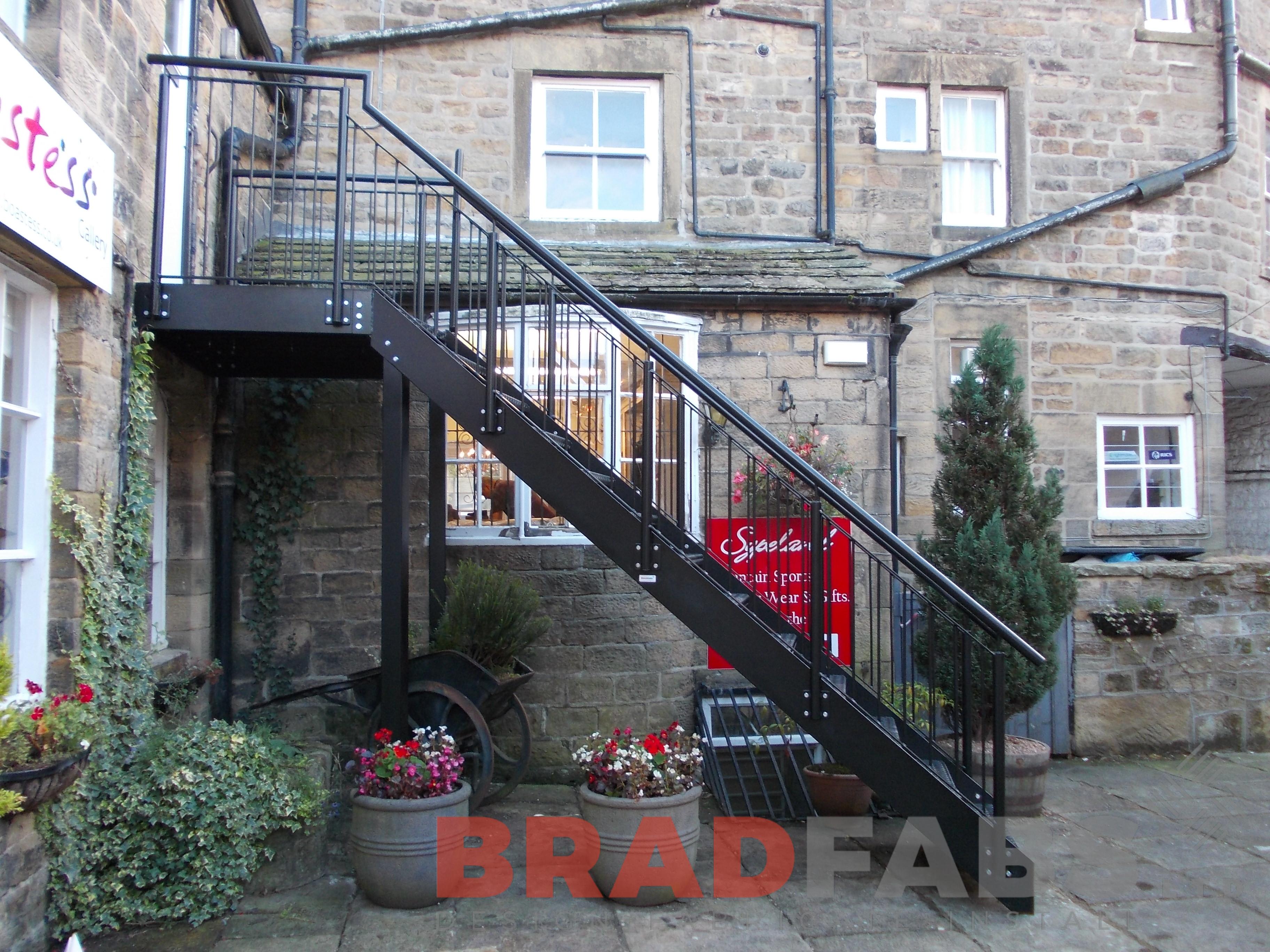 The standard fire escape gives emergency escape for a first floor shop, single flight staircase with anti slip treads and landing. All powder coated black to fit in with surroundings.