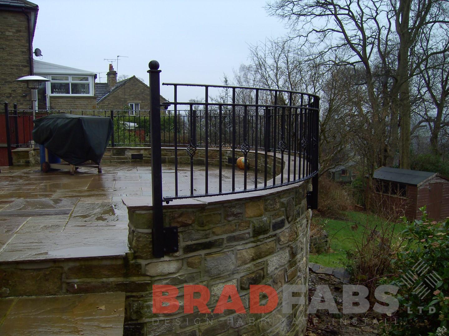 This wall mounted curved railing features vertical bars and ornate baskets designs. This curved railing is fabricated in mild steel then galvanized, painted black and installed at a residential property in Leeds, West Yorkshire.