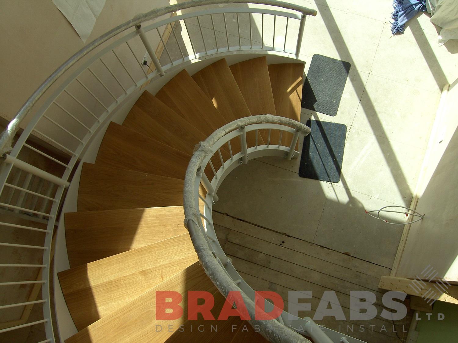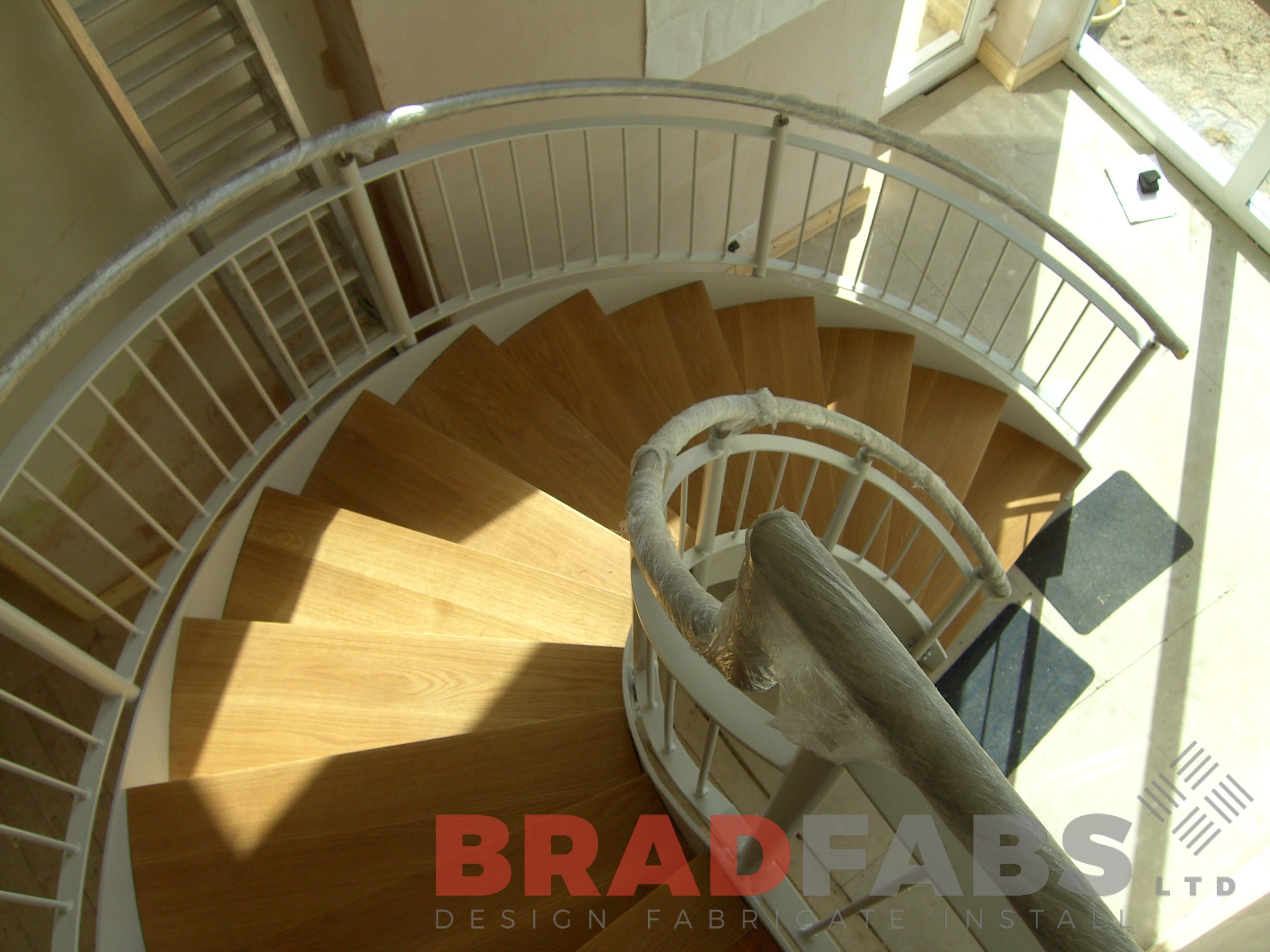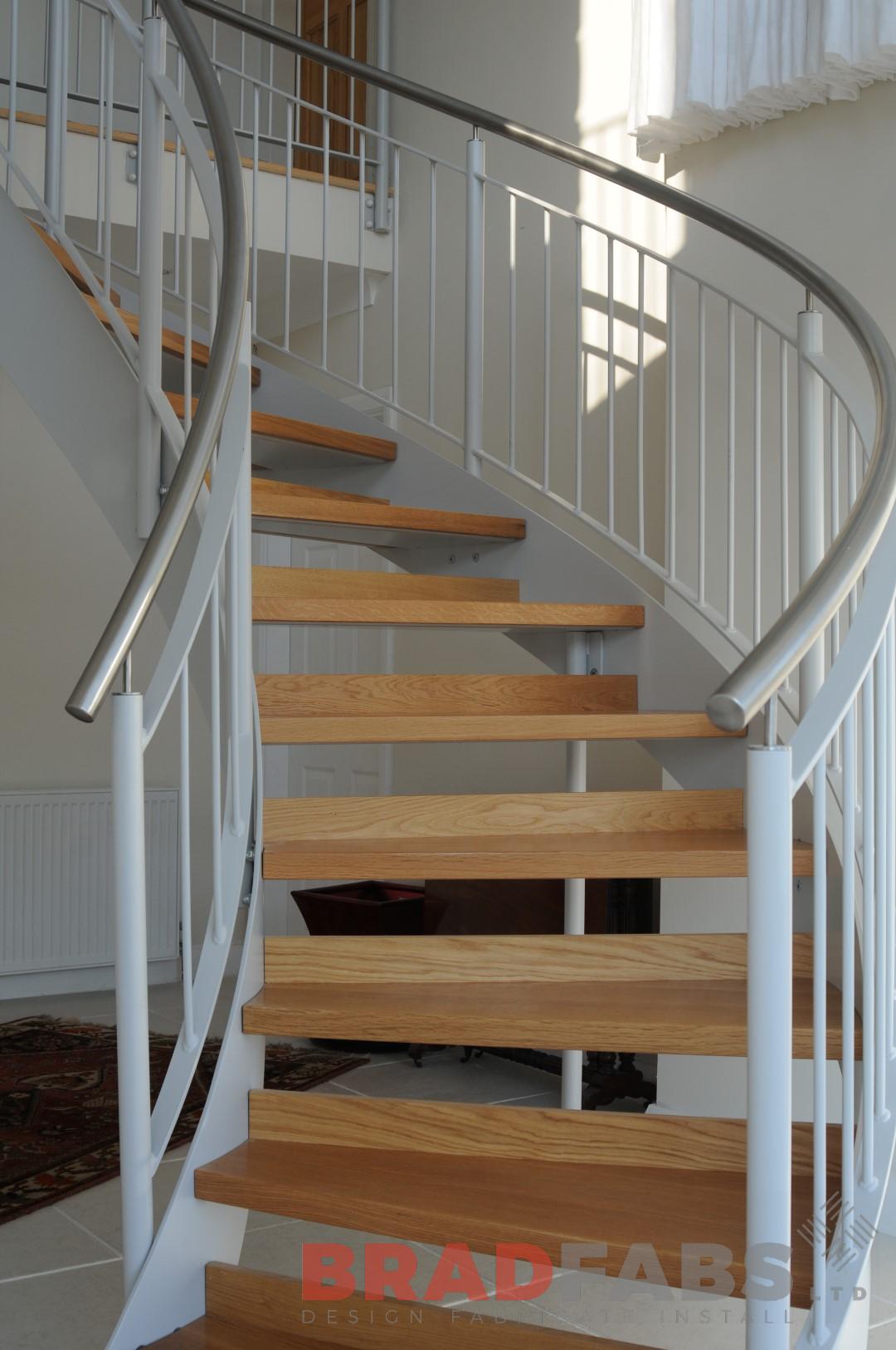 This modern staircase is fabricated in mild steel and stainless steel. The staircase features brushed stainless steel hand rails, mild steel stringers and stair supports, which are timber clad. This bespoke staircase design can be made to your requirements and installed in the UK.