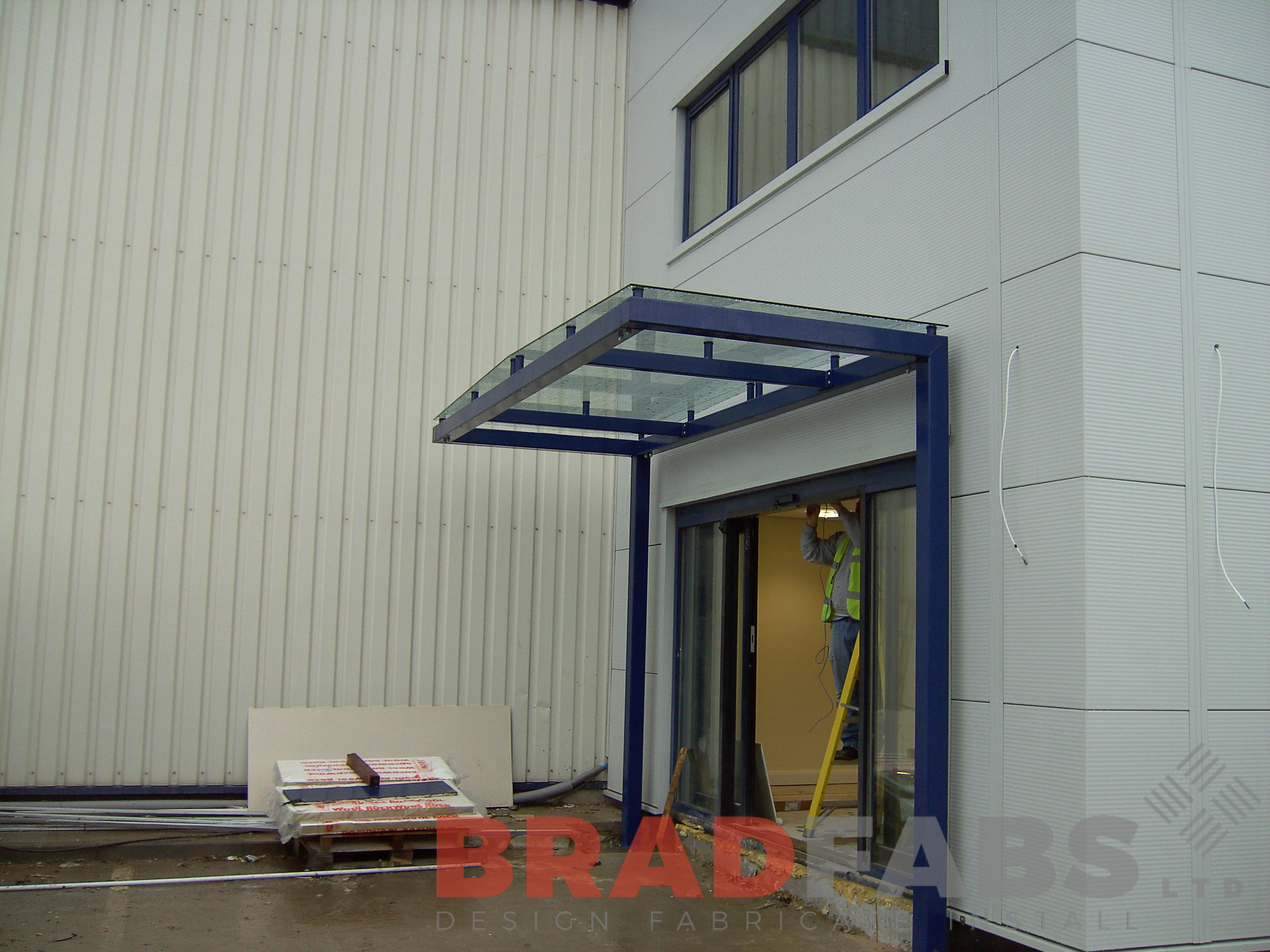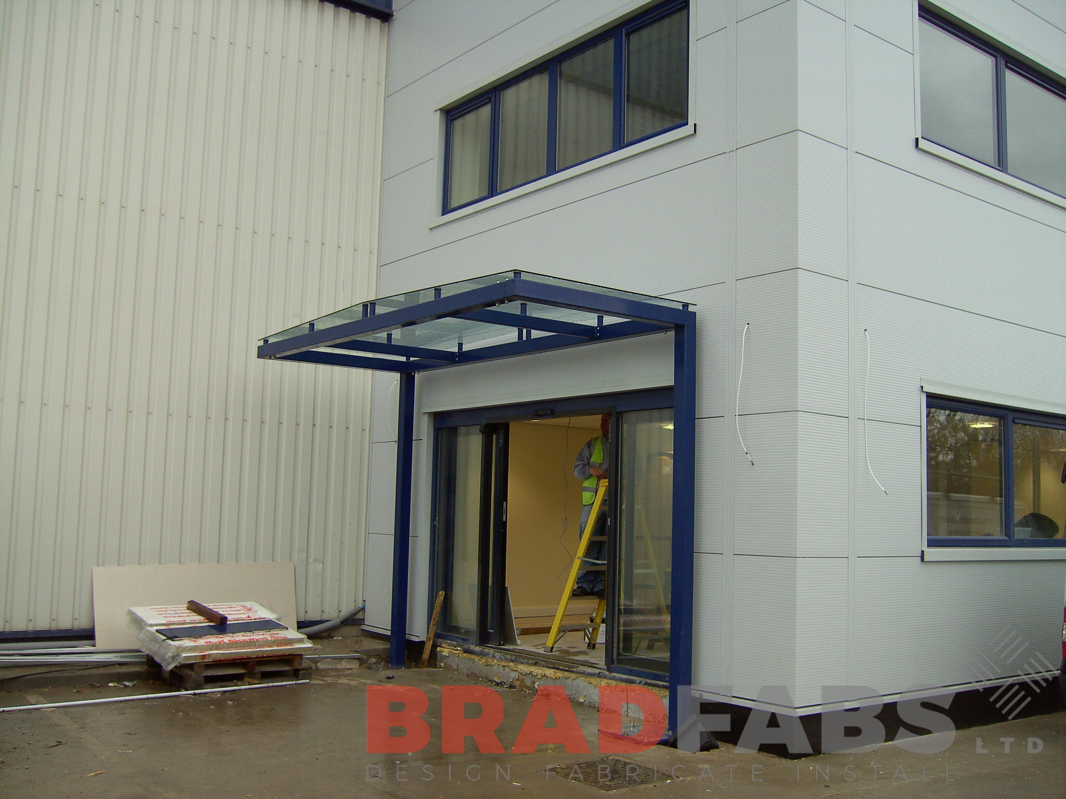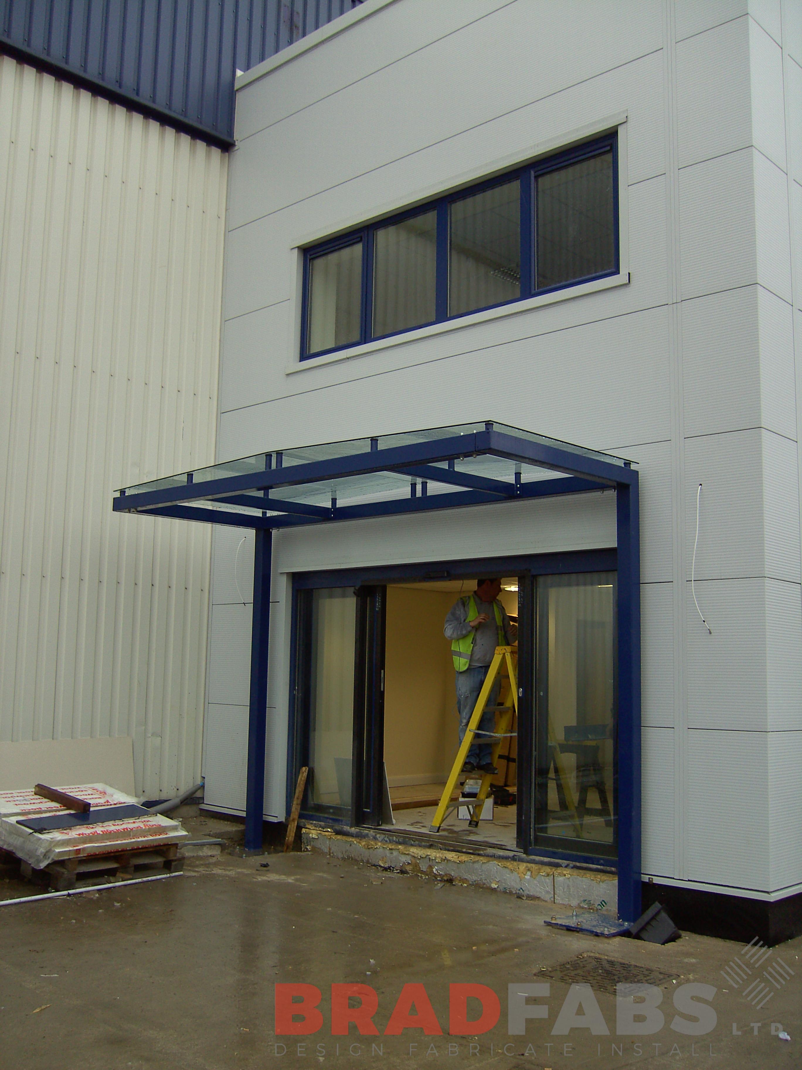 This galvanized canopy shelters staff and customers as they enter and exit the main entrance of this office building. The double door way canopy is powder coated blue to match the door frames and is installed at Capital Park in Tingley, West Yorkshire.