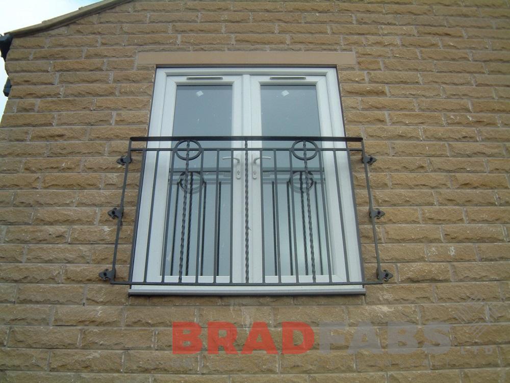 This mild steel Juliet balcony railings is a popular design with wavy bars and decorative fixing plates. All our balconettes are galvanized and powder coated for a long lasting finish. This particular finish is grey, one of many balconettes fitted at some apartments in West Yorkshire, UK.
