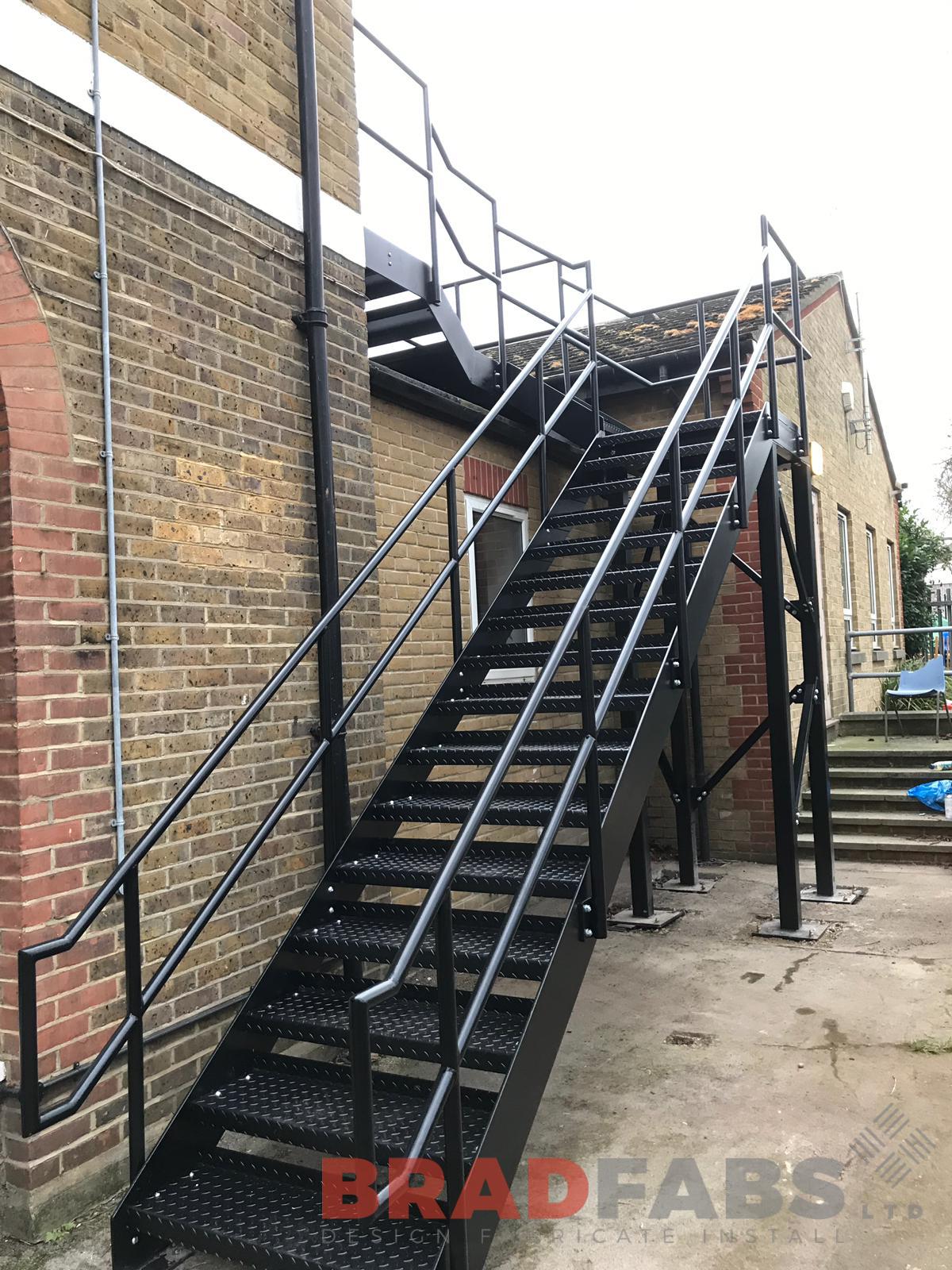 This college wanted a new external staircase to provide a safe emergency exit that would last against all weather conditions. Manufactured in mild steel, galvanised and powder coated black with durbar treads for extra grip underfoot.