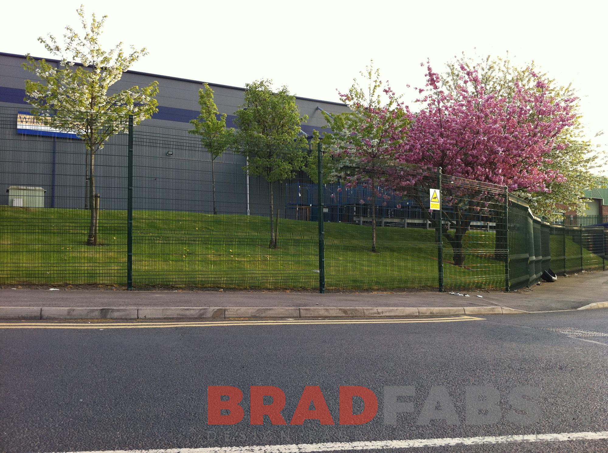 This mesh profile panel perimeter fencing provides a fifteen foot security barrier with other gates and CCTV. It is fabricated in galvanized mild steel, powder coated green to soften its impact and is installed at Geldard Road Business Park, West Yorkshire.